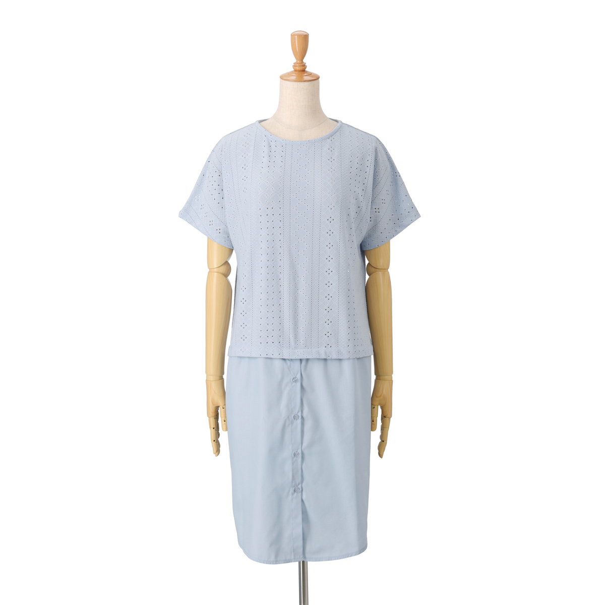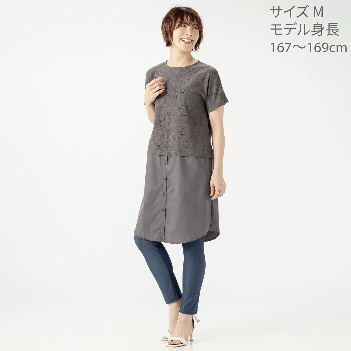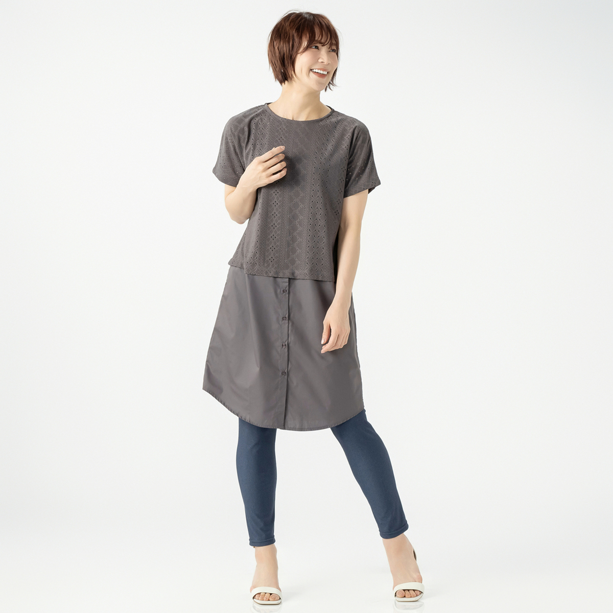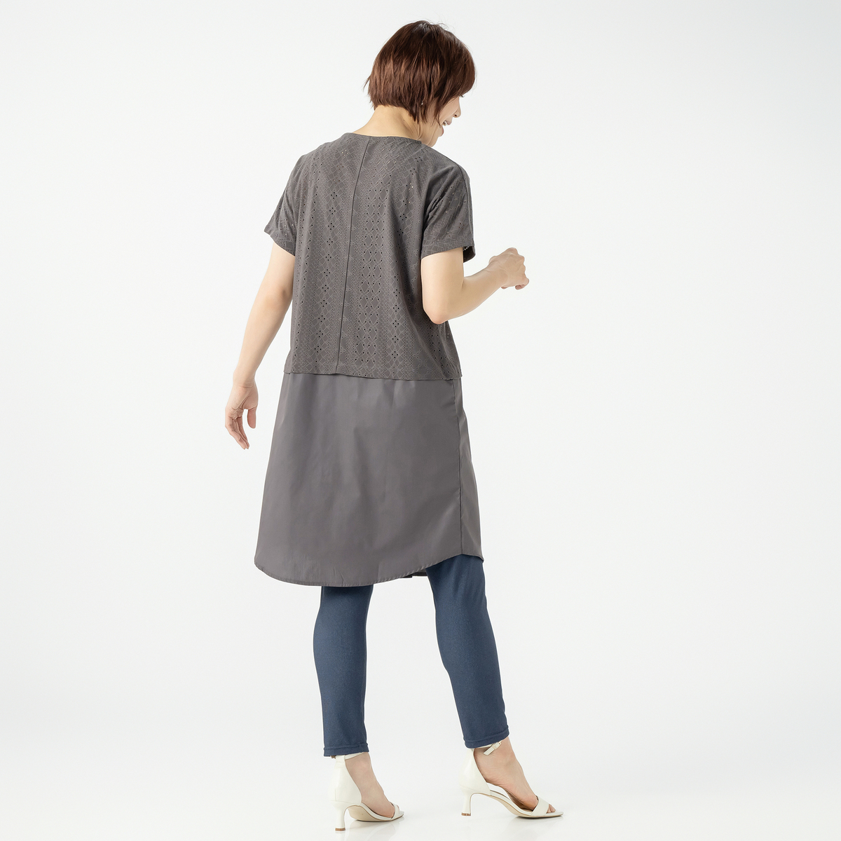 上身頃にストレッチレース、ウエスト下にハリのあるシャツ素材を組合せたチュニックです。透かしのある刺繍柄でジャカード編みのストレッチレースが立体感と清涼感を演出し、細身のパンツと合わせてすっきり着こなせます