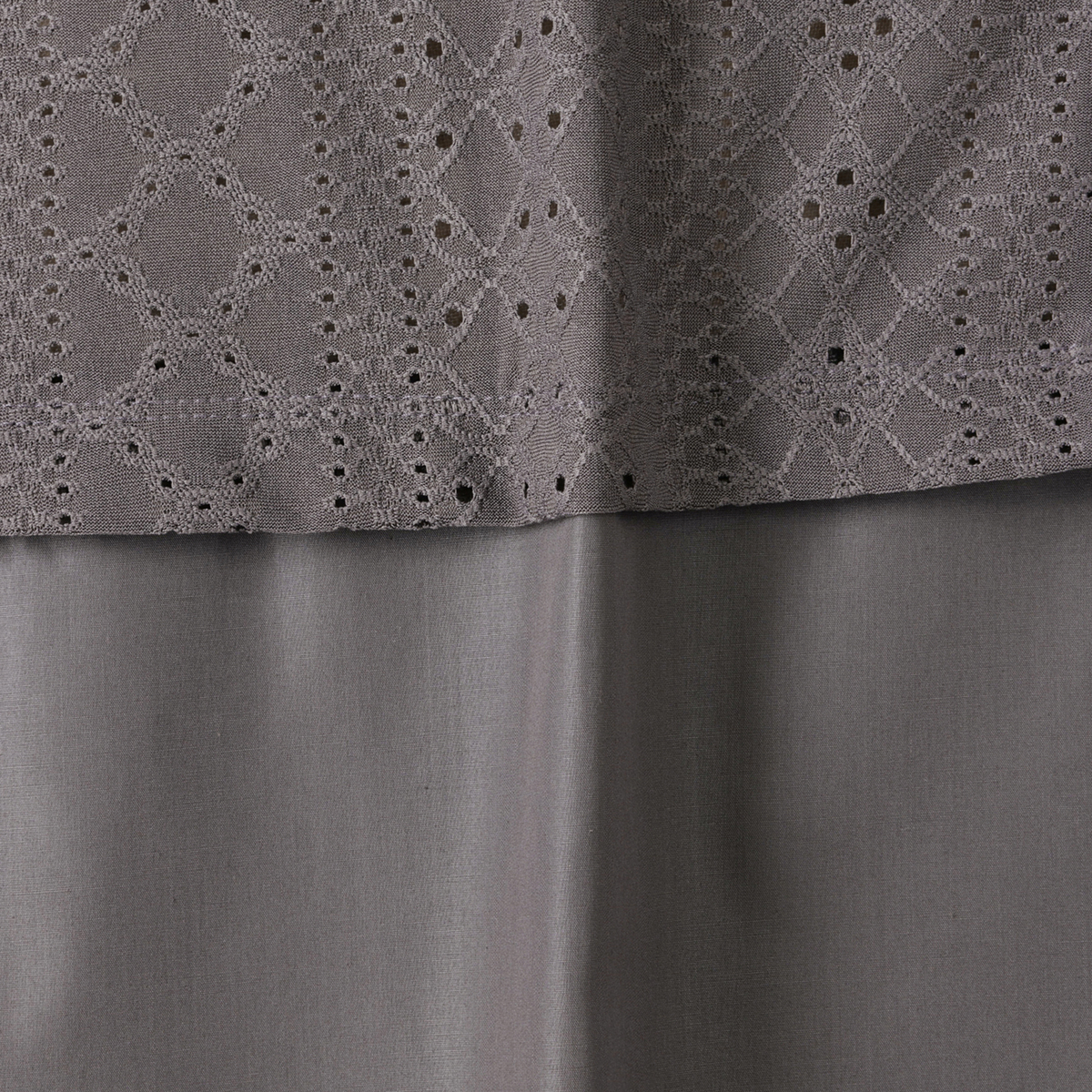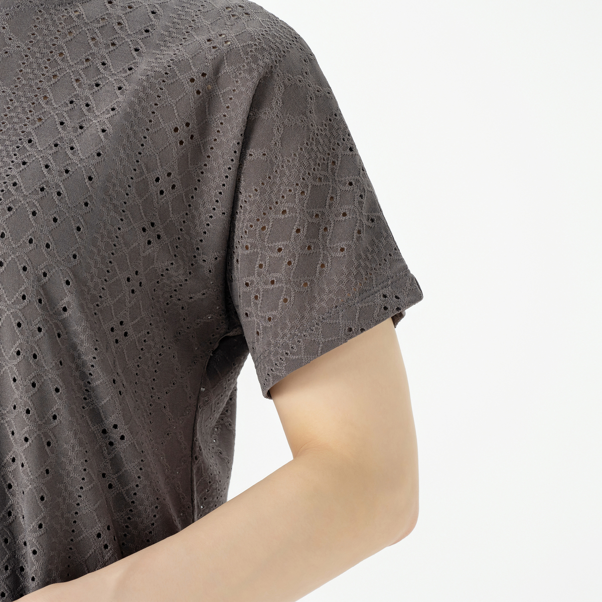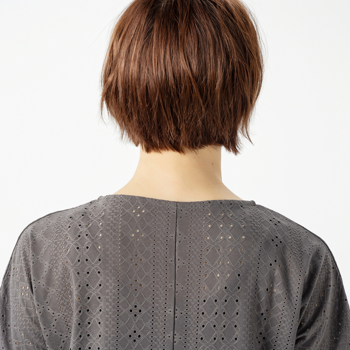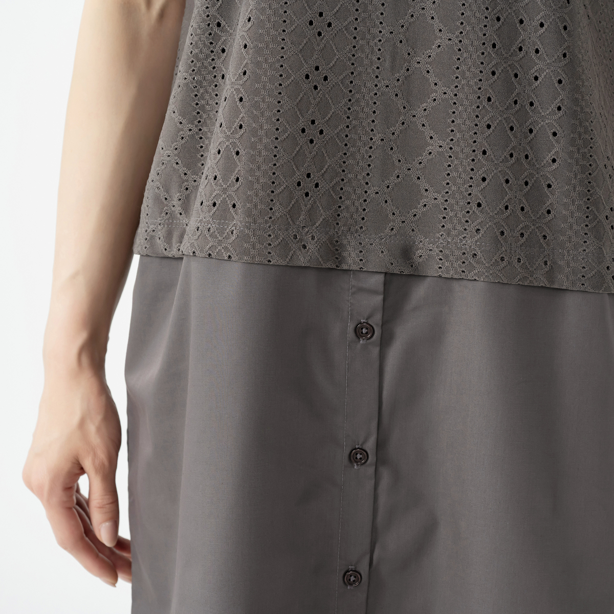上身頃にストレッチレース、ウエスト下にハリのあるシャツ素材を組合せたチュニックです。透かしのある刺繍柄でジャカード編みのストレッチレースが立体感と清涼感を演出し、細身のパンツと合わせてすっきり着こなせます