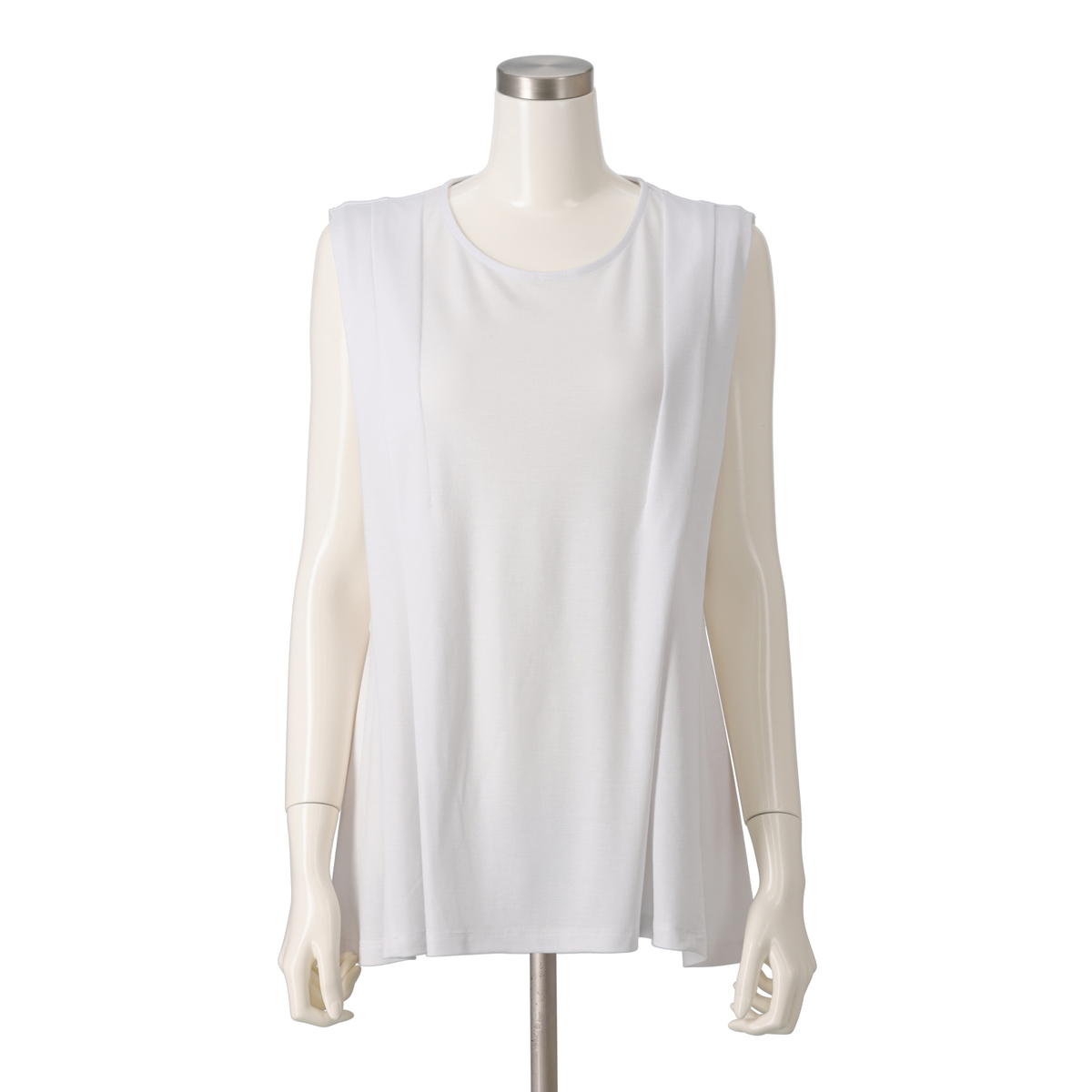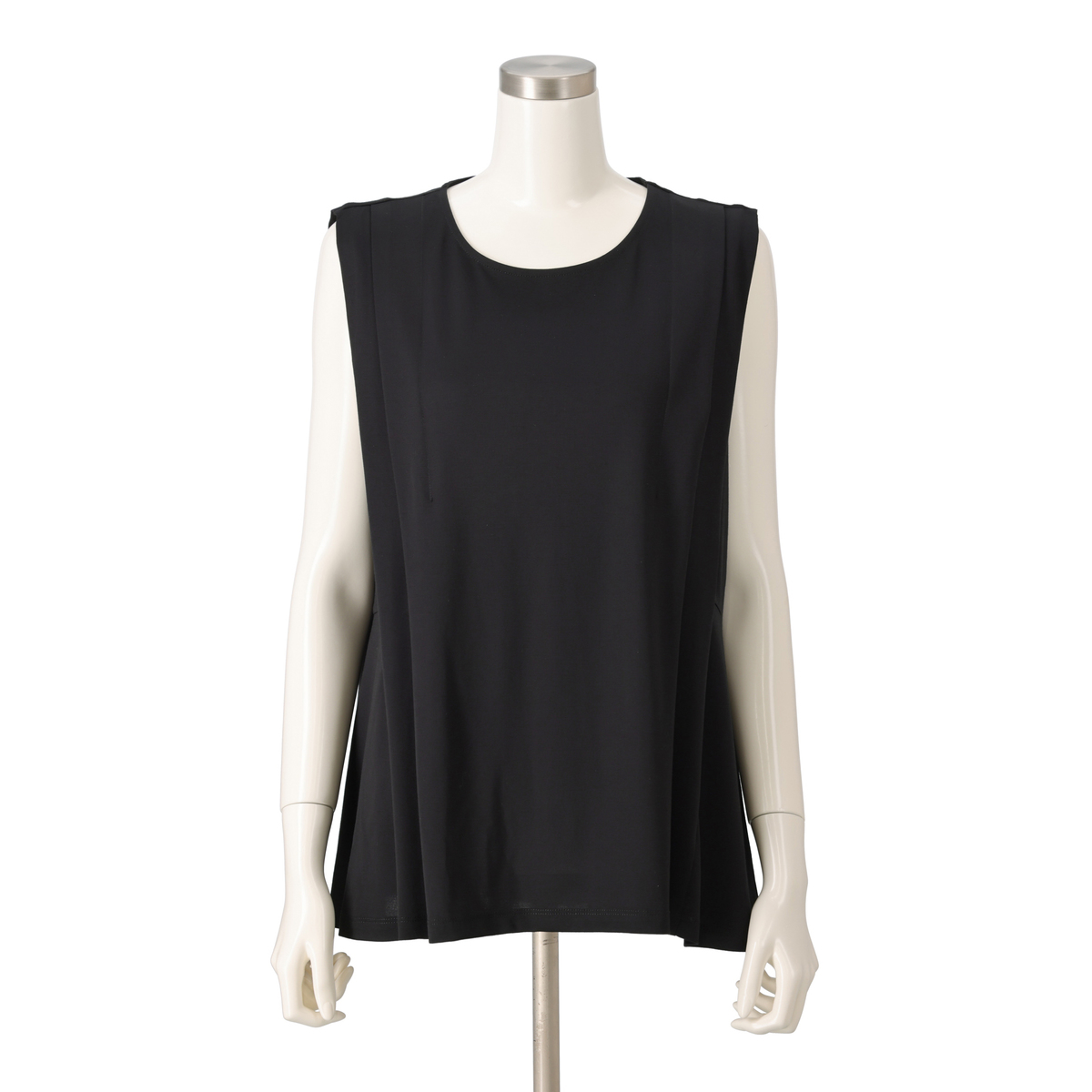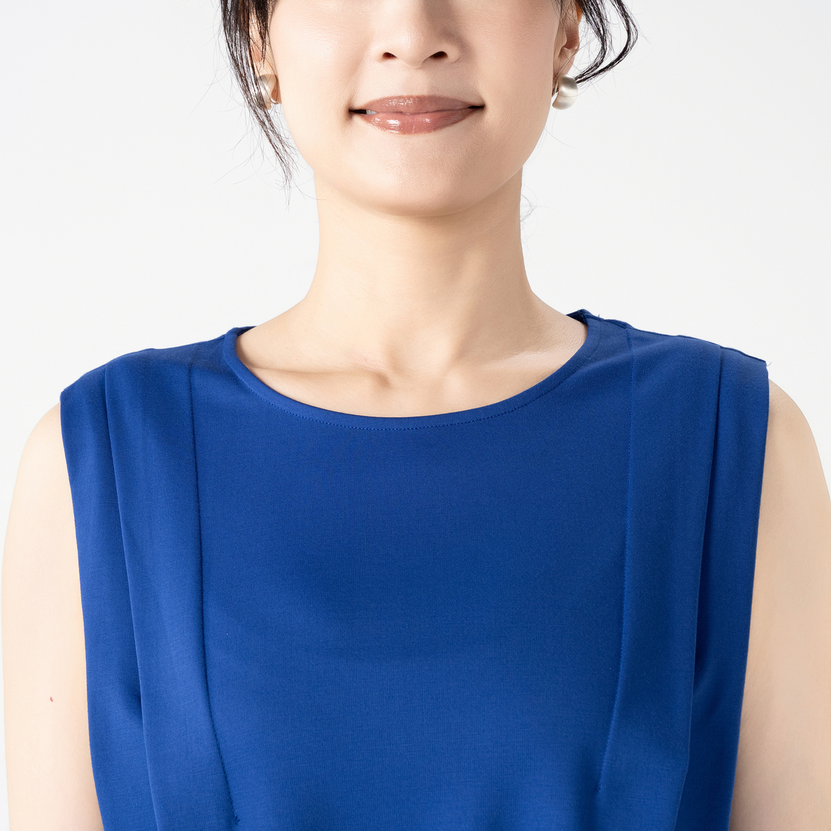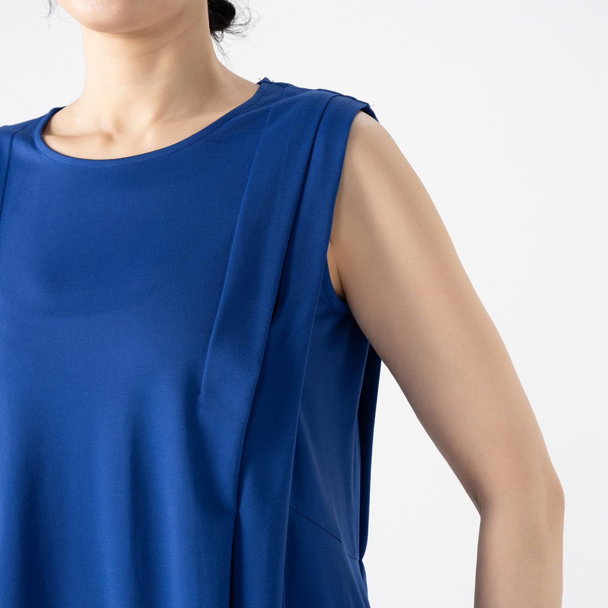 ノースリーブながらも外側のタックが肩先までかかり、腕の付け根が覗きすぎない仕様。やや後ろ下がりのヘムラインと程良い丈感でバランス良く着こなせます