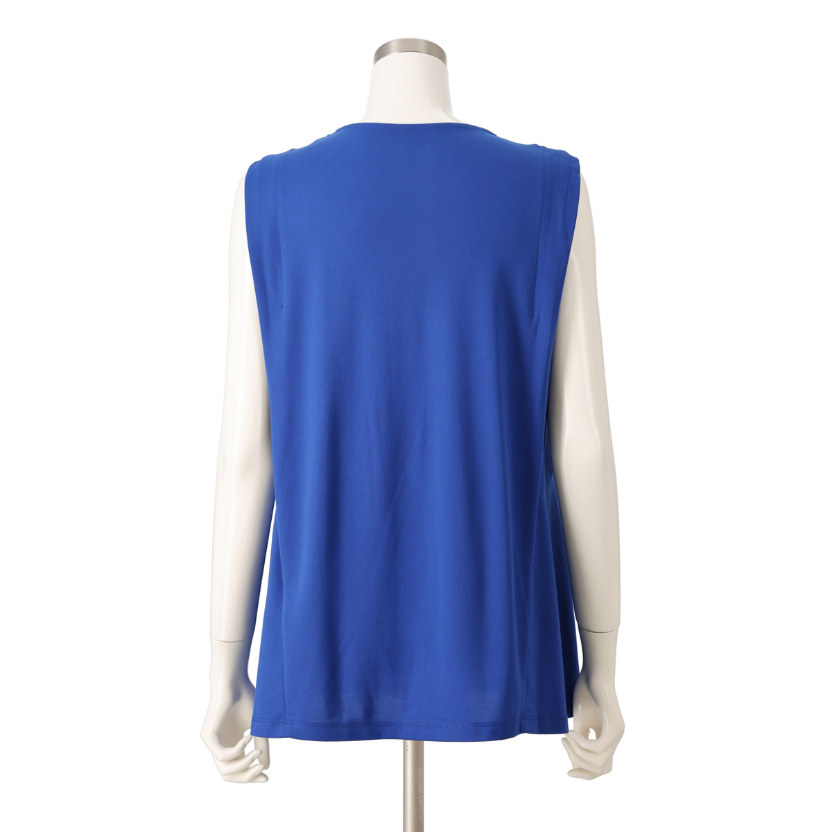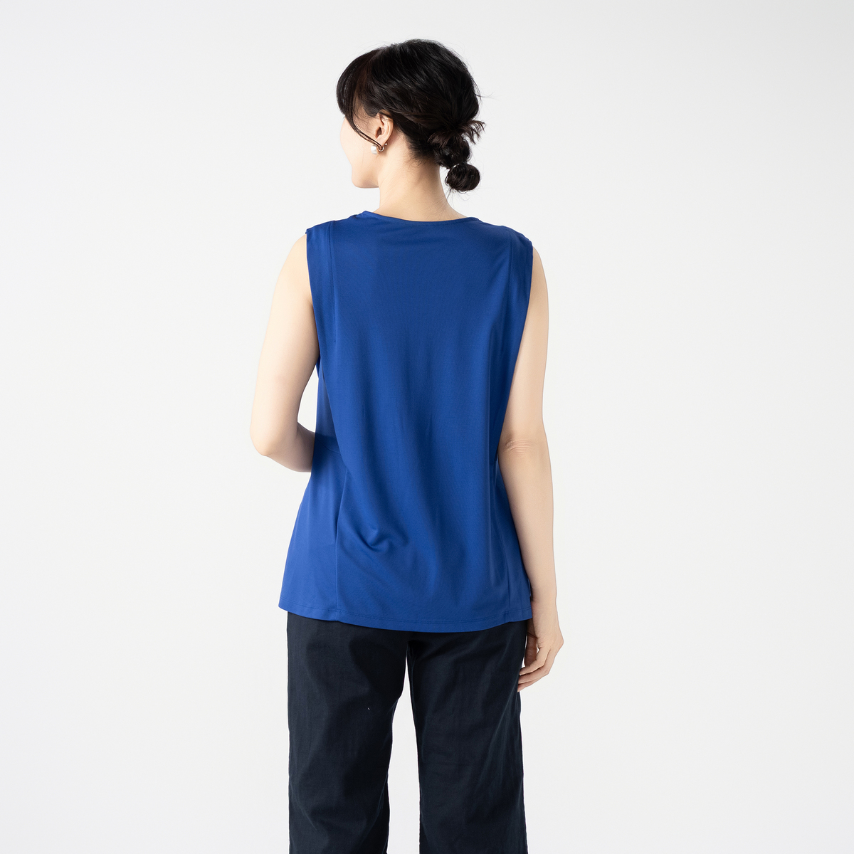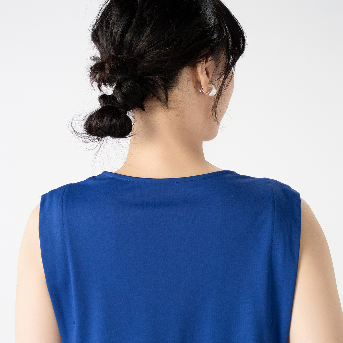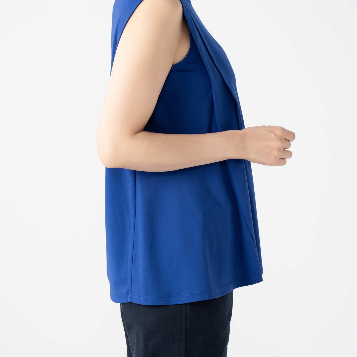 ノースリーブながらも外側のタックが肩先までかかり、腕の付け根が覗きすぎない仕様。やや後ろ下がりのヘムラインと程良い丈感でバランス良く着こなせます