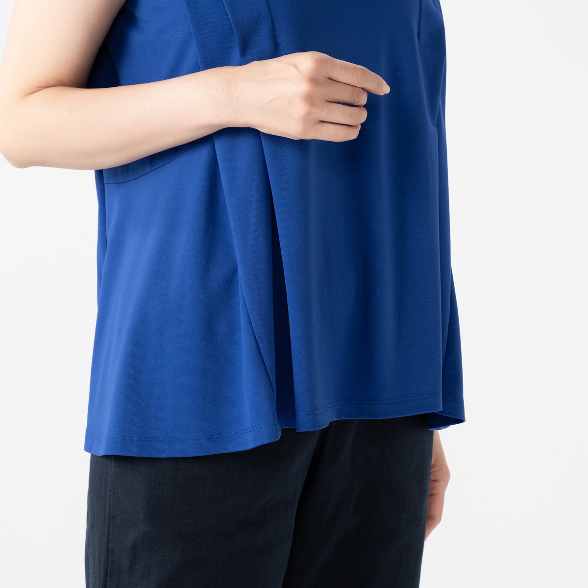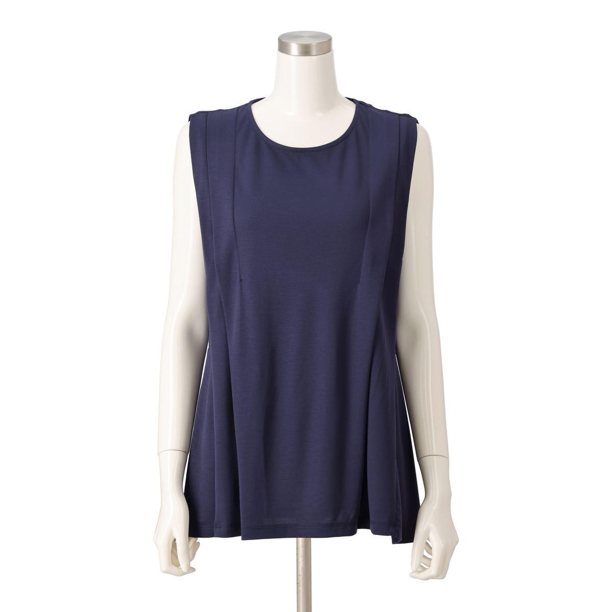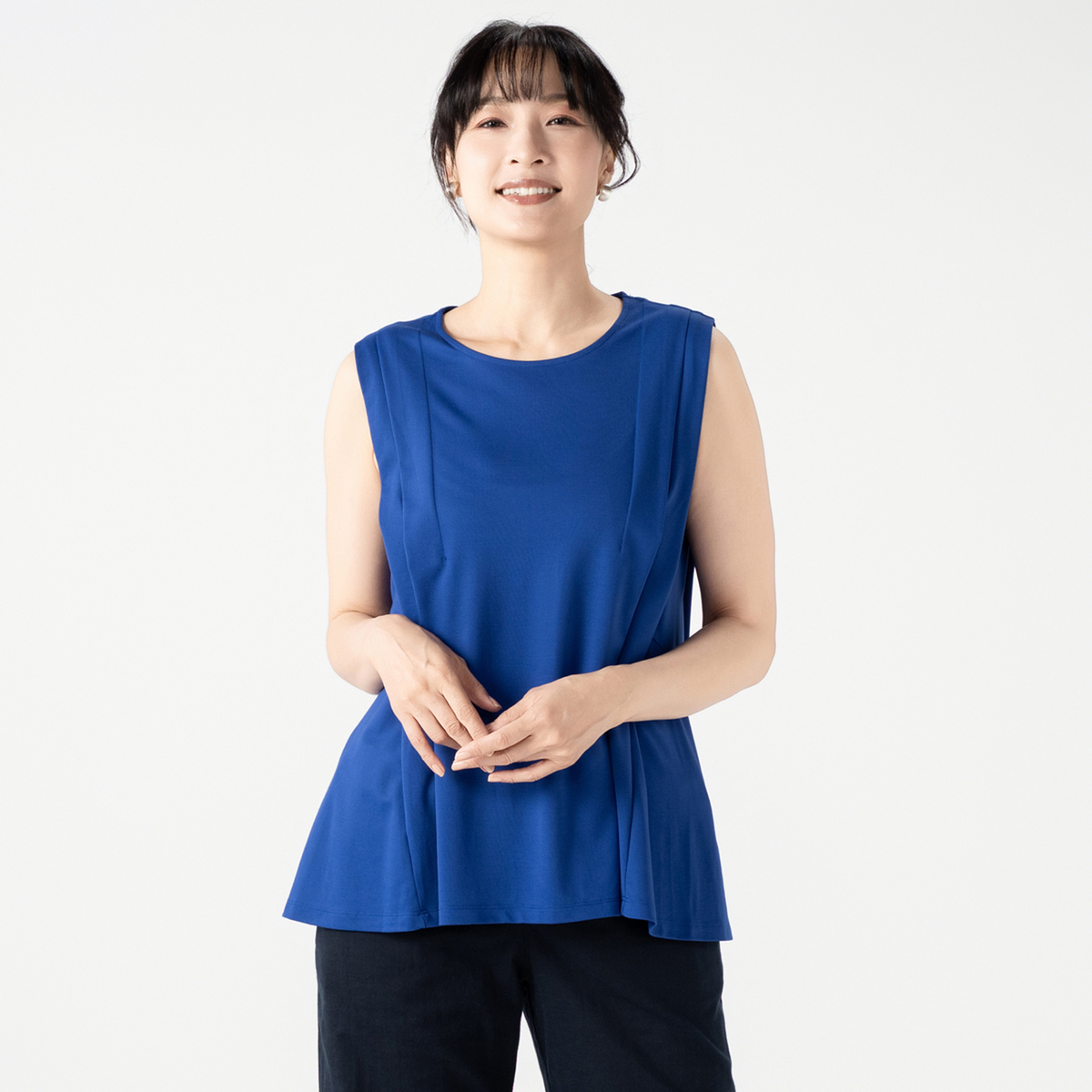きれいめコーデに活躍してくれるノースリーブプルオーバー。フロントにタックを施し立体的なデザインに仕上げました。ウエストで切り替えたソフトなフレアーシルエットがお腹や腰周りをカバーしてくれます