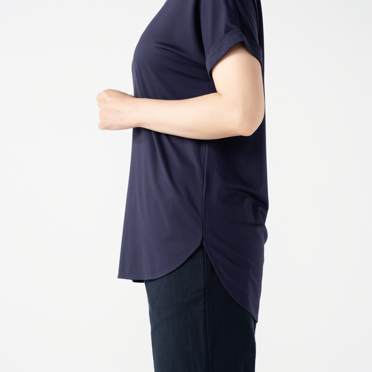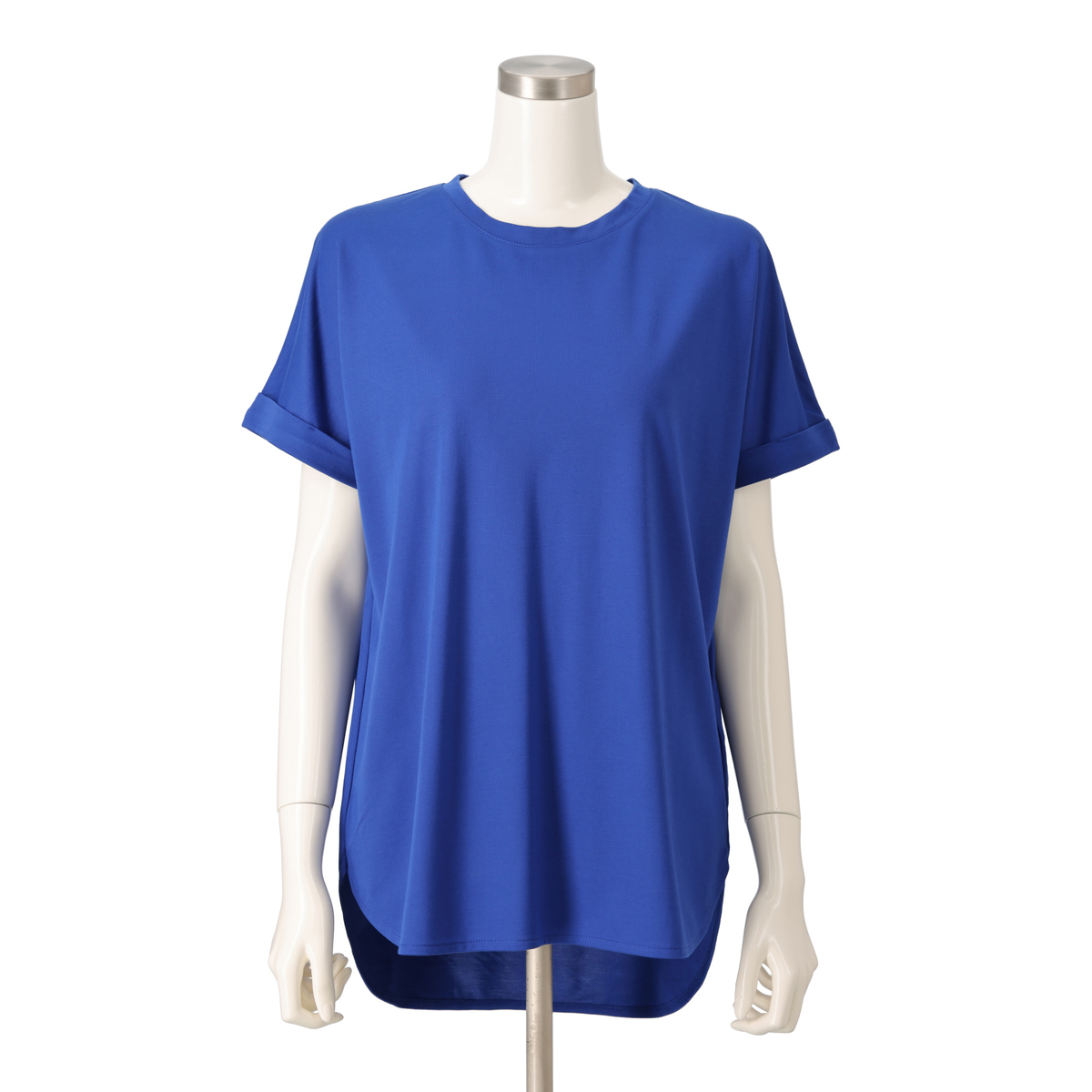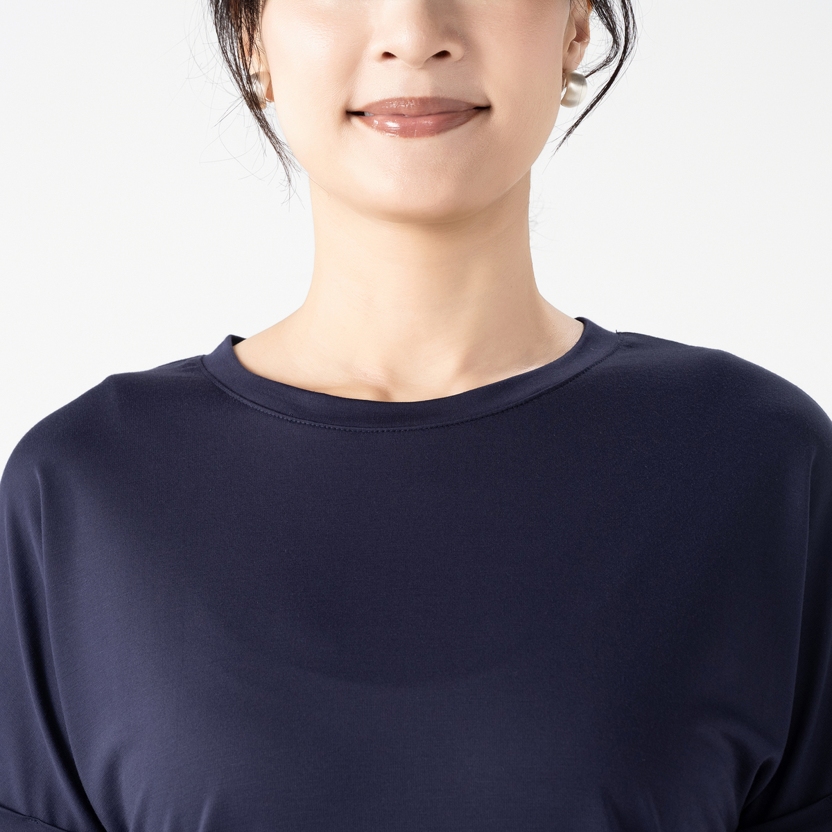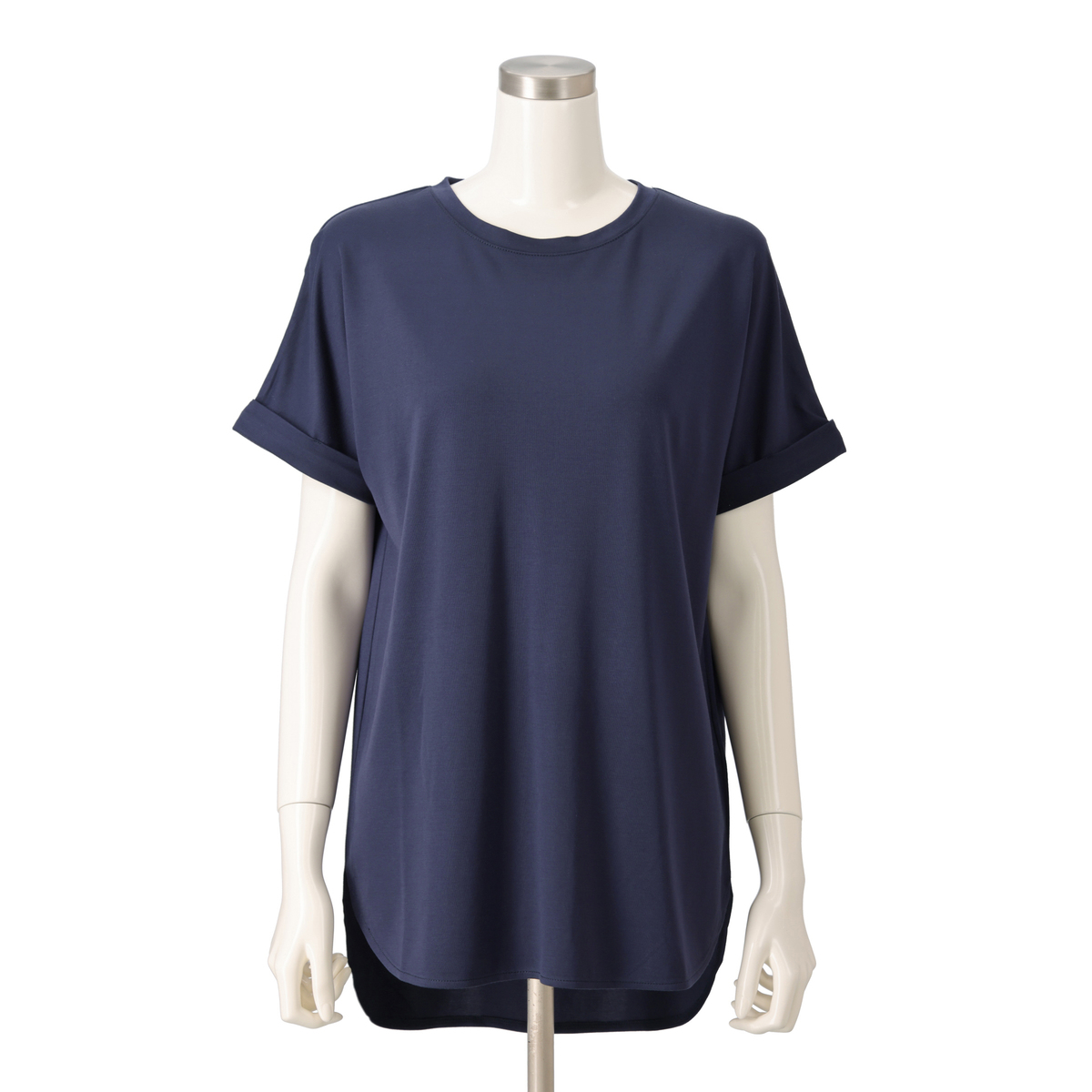 コーデしやすいラウンドヘムで、生地の柔らかさで裾まですとんと落ちるライン、見た目はすっきり・着心地は楽な一枚。袖口にWの折り返しをつけたドルマンスリーブで、身頃続きのドルマンスリーブなので、肩周りも腕周りも楽な作りです