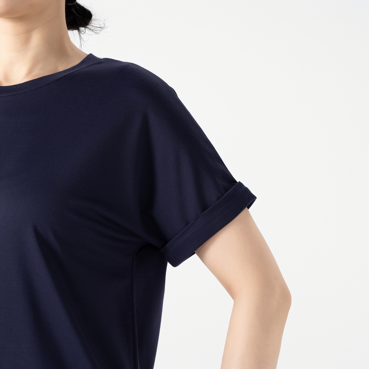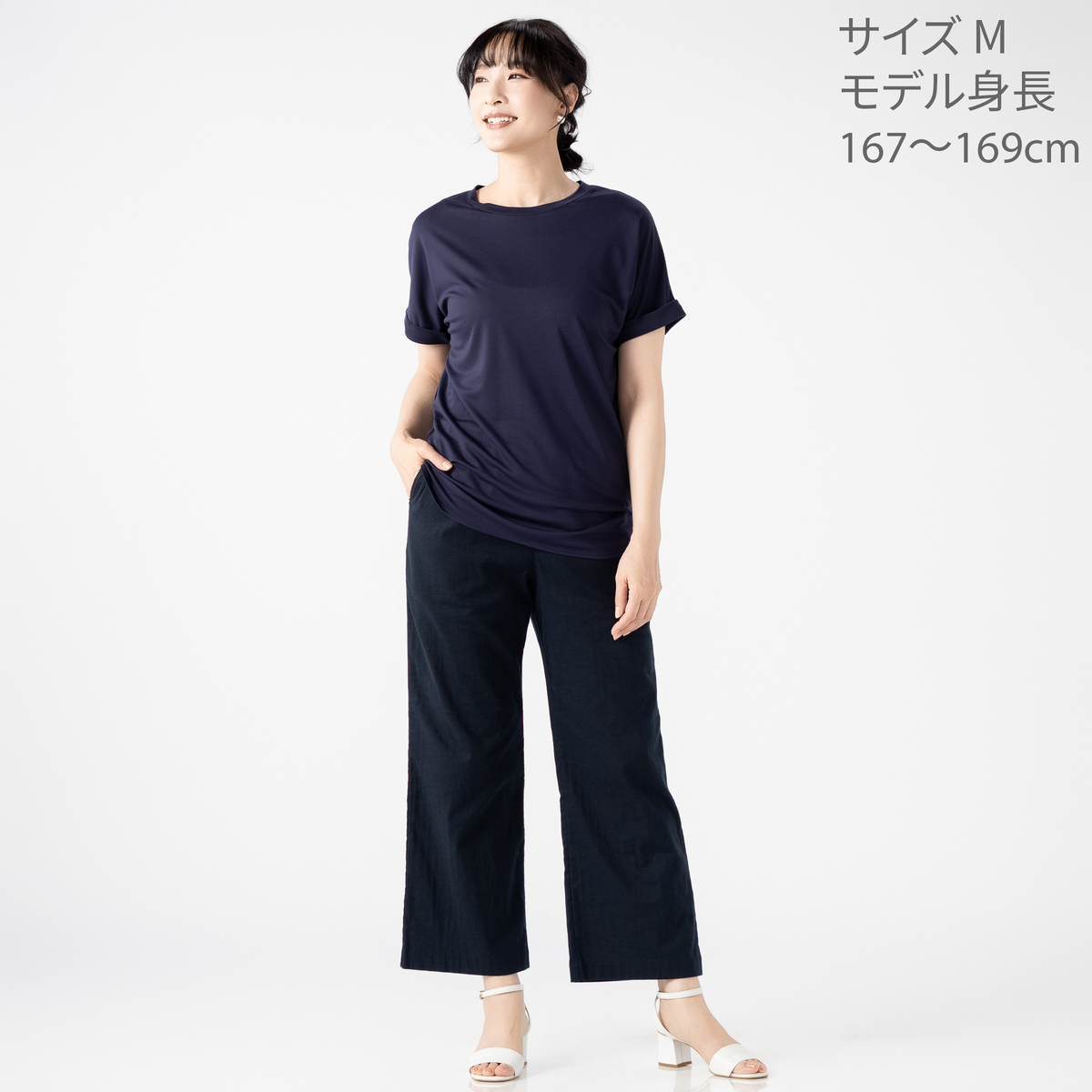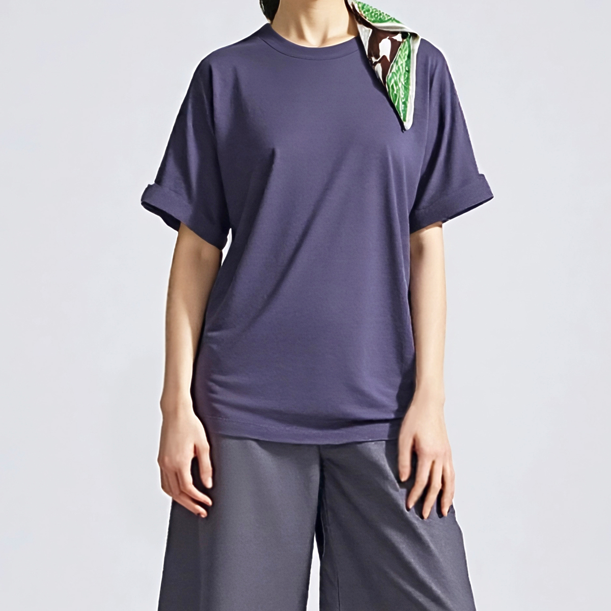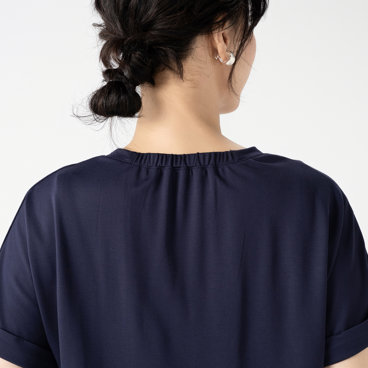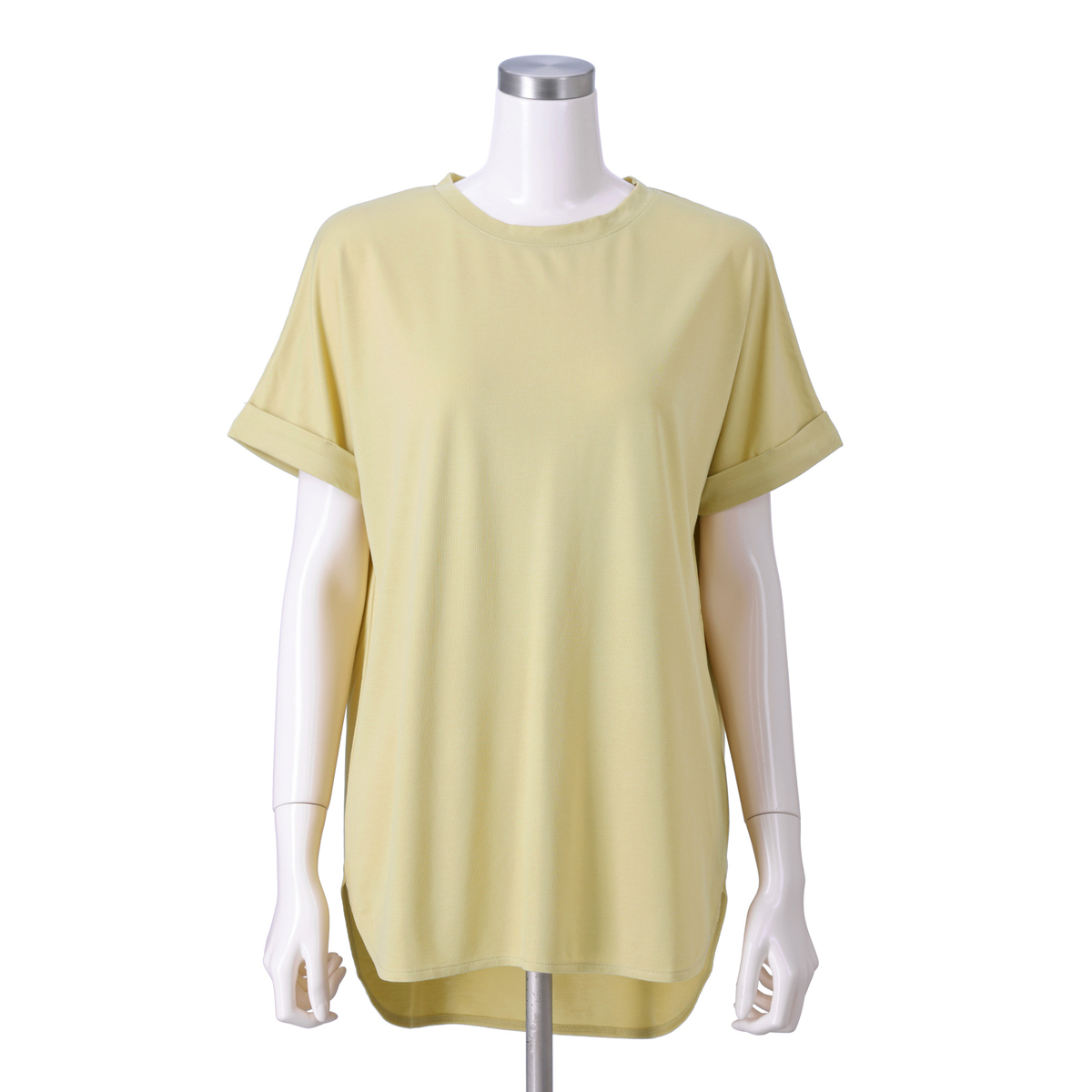 コーデしやすいラウンドヘムで、生地の柔らかさで裾まですとんと落ちるライン、見た目はすっきり・着心地は楽な一枚。袖口にWの折り返しをつけたドルマンスリーブで、身頃続きのドルマンスリーブなので、肩周りも腕周りも楽な作りです