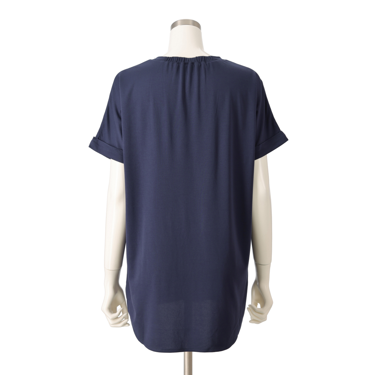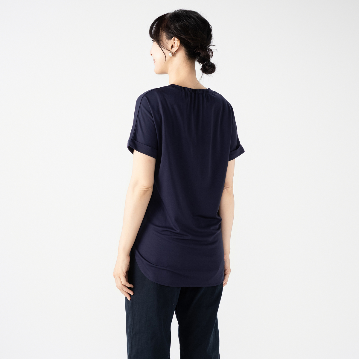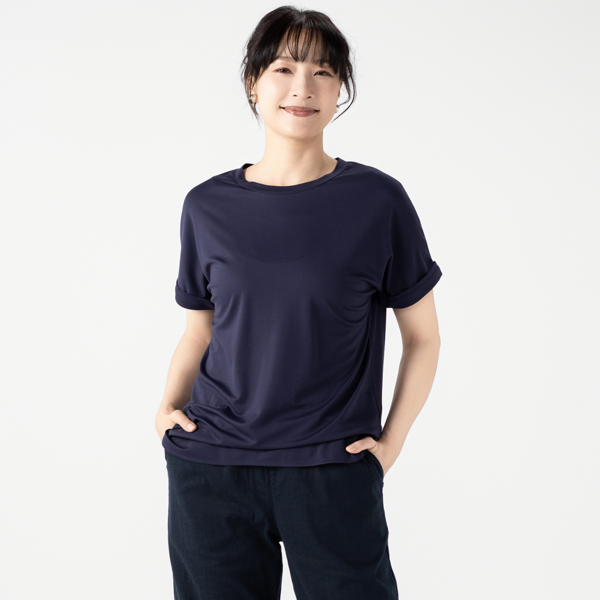 UVカットと接触冷感機能のあるレーヨン混カットソー素材のプルオーバー。柔らかでしなやかさがある心地良い編地で、適度な落ち感とハリ感があり、薄手でもボディラインを拾いにくく、サラッと心地よく着られます。伸縮性があり楽に着脱できます