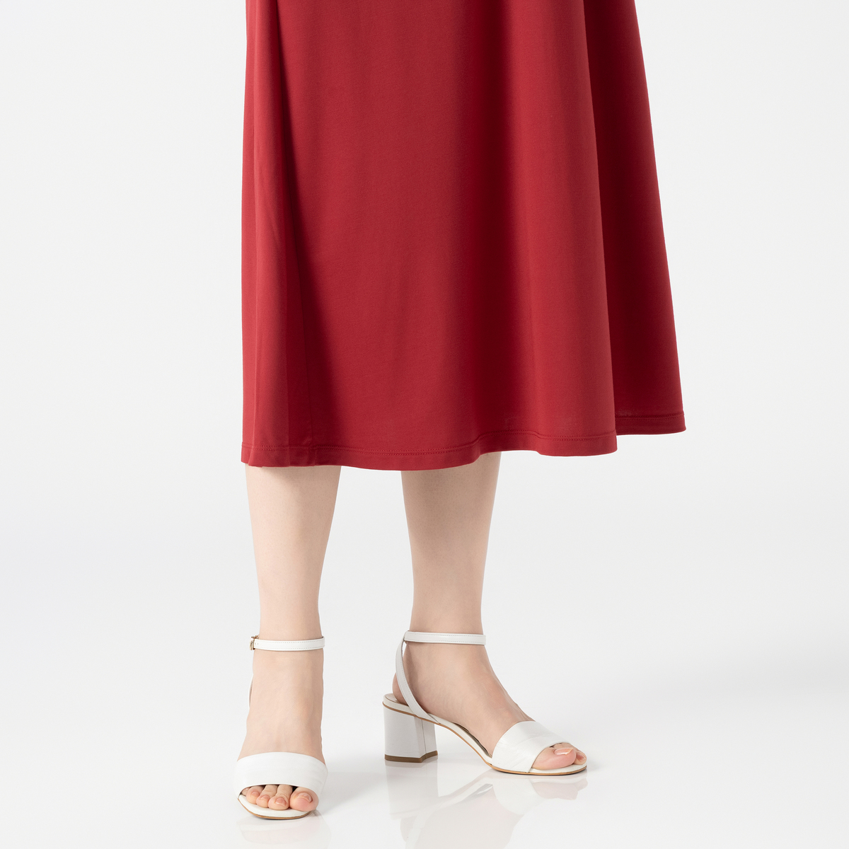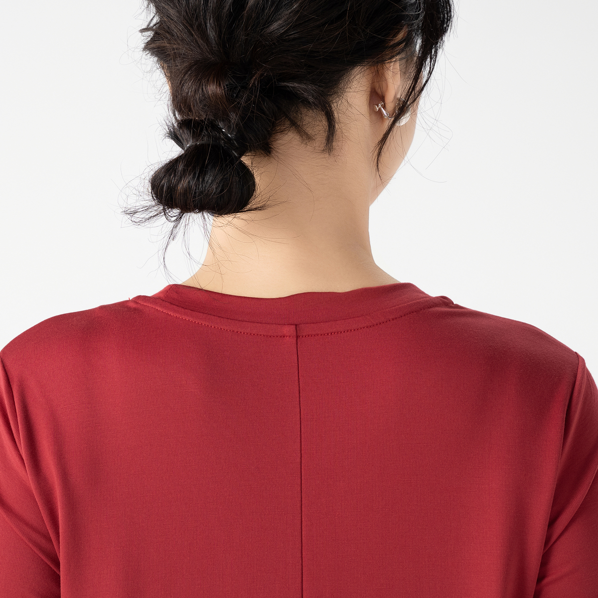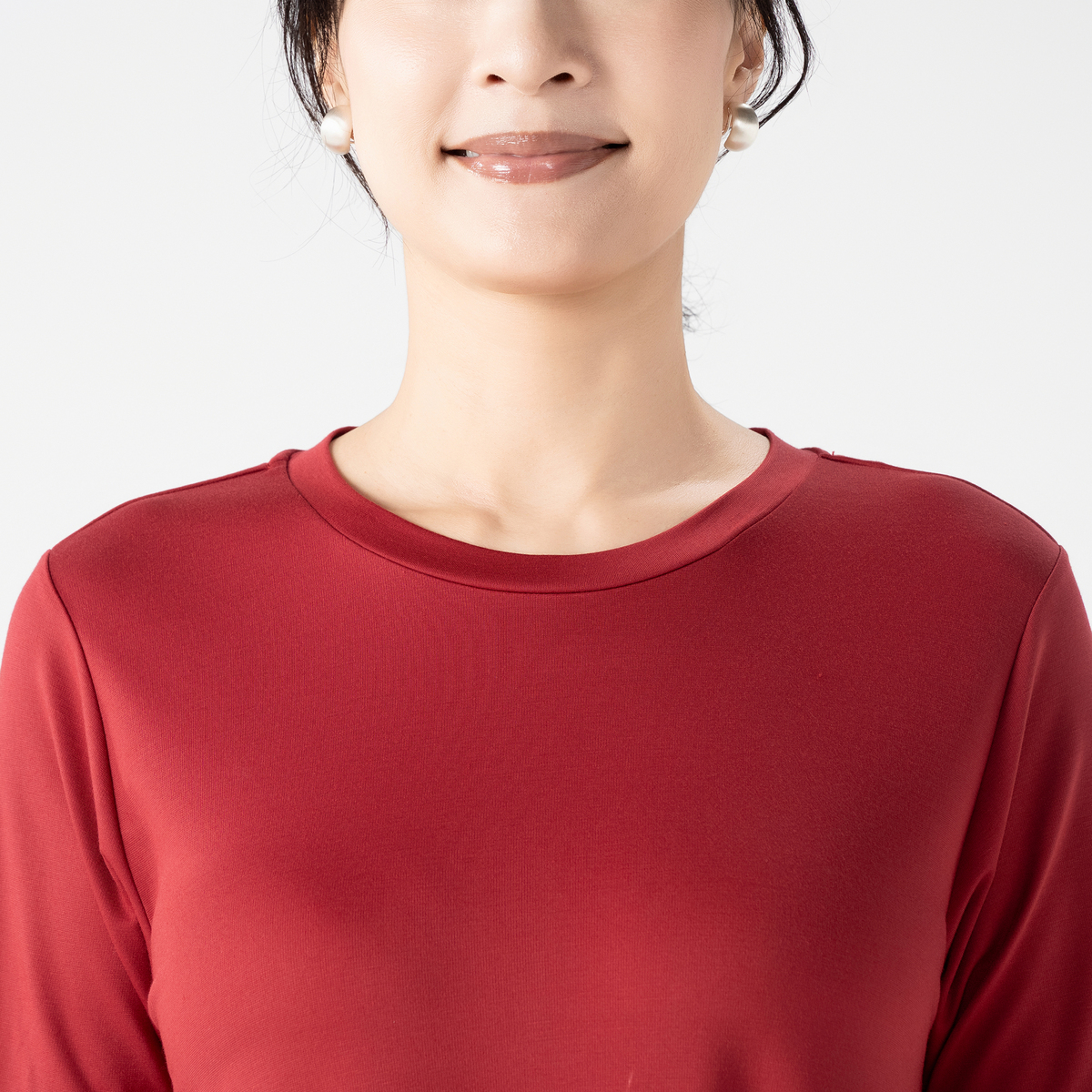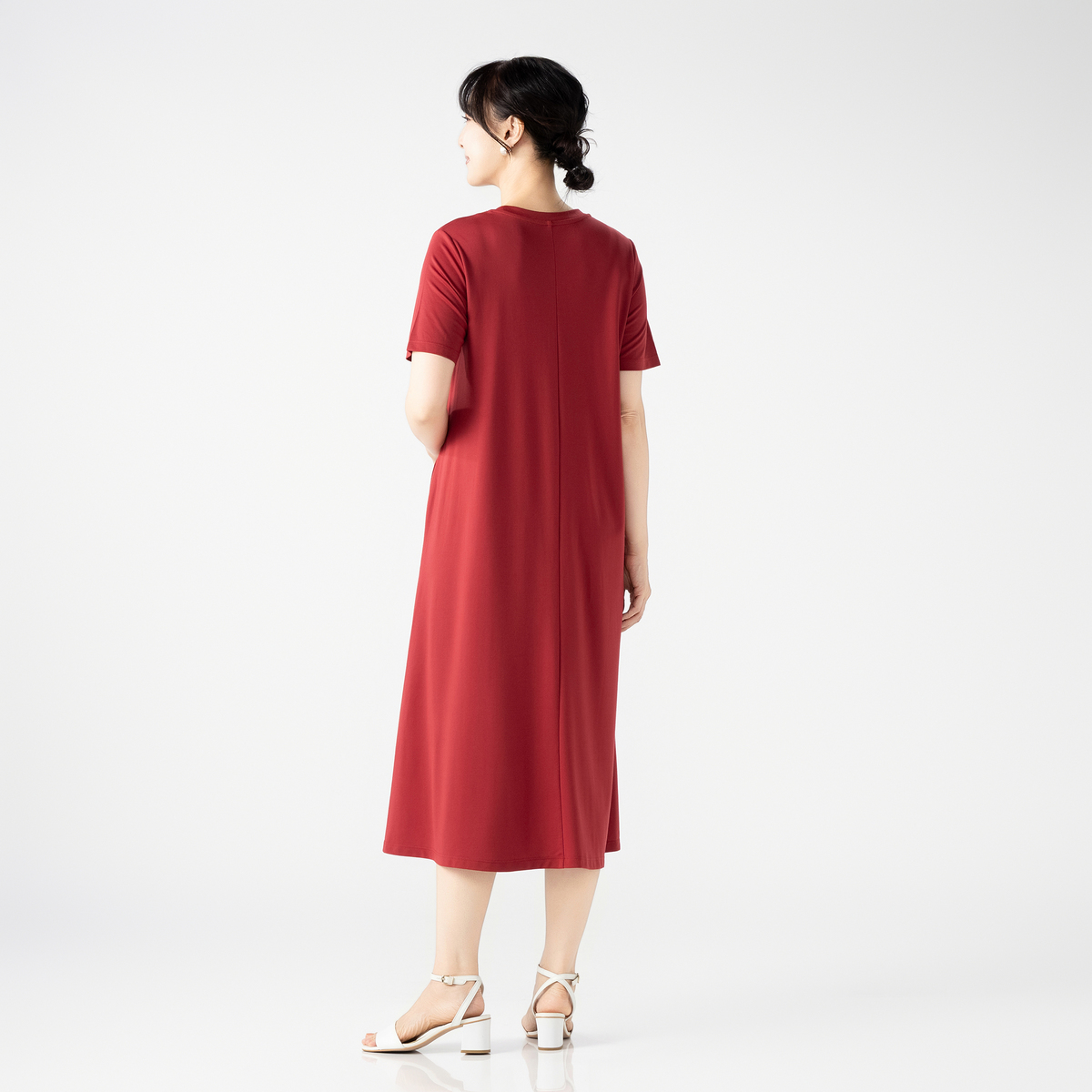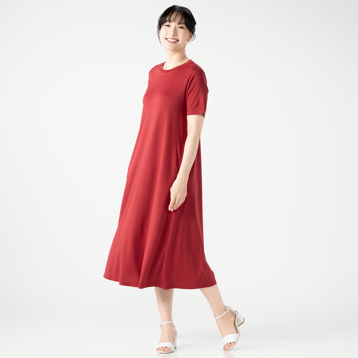 UVカットと接触冷感機能のあるレーヨン混カットソー素材のワンピース。柔らかでしなやかさがある心地良い編地で、適度な落ち感とハリ感があり、薄手でもボディラインを拾いにくく、サラッと心地よく着られます。伸縮性があり楽に着脱できます