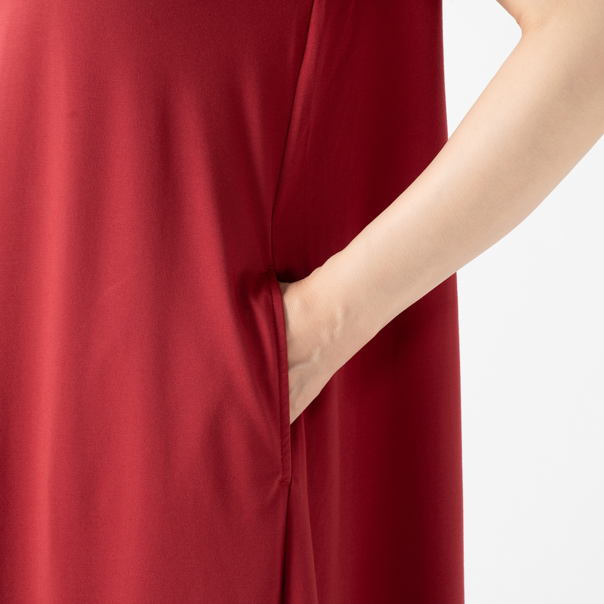 縦長ラインのロングワンピースで、適度なゆったり感がボディラインをカバー。素材感を活かしたスッキリ見えのしなやかなラインです。肩周りや腕周りに程よいゆとりがある楽な着心地で、二の腕をすっぽり隠す袖丈。両サイドには便利なポケット付きです