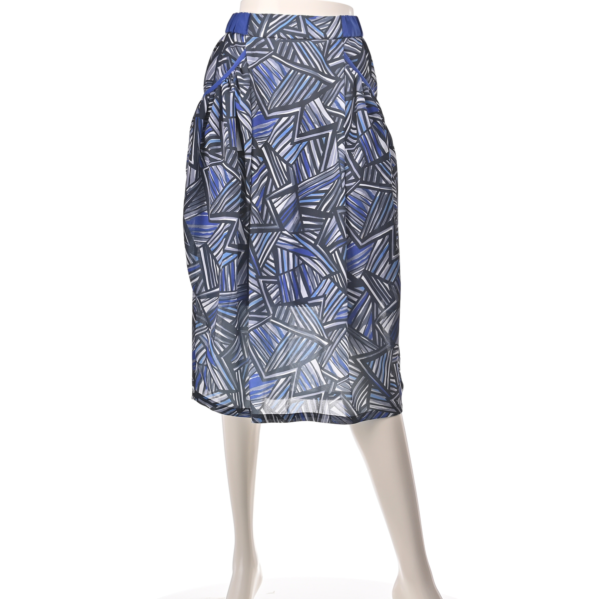 ヤシの葉をモチーフにしたプリントが目を引くバルーンペンシルスカート。大胆さと繊細さを兼ね備えた華やかな柄です