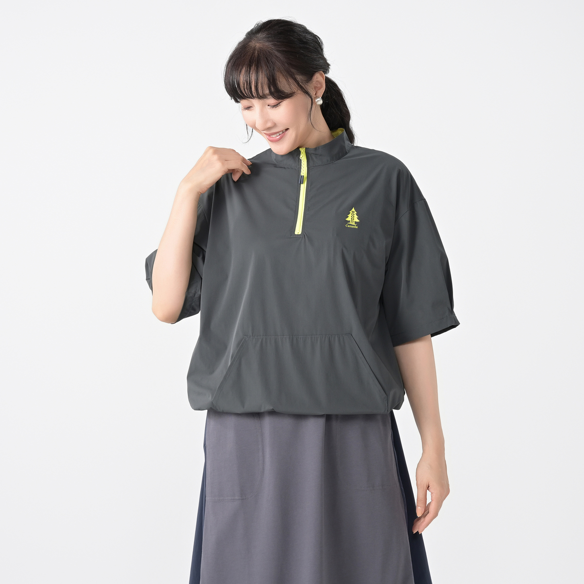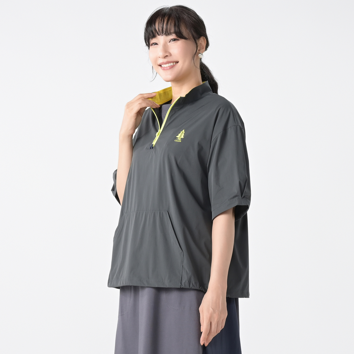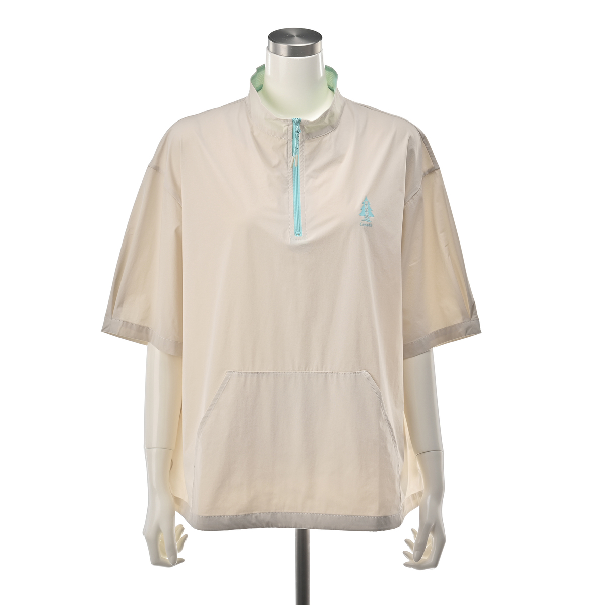 トラックジャケットのディテールを取り入れたプルオーバー。スタンドカラーのハーフファスナー仕様で、閉めてハイネックのように、開けてオープンカラー風にしたり、変化を楽しめます。清涼感のあるアクセントカラーのロゴプリントとファスナーディテールが、夏らしい印象です