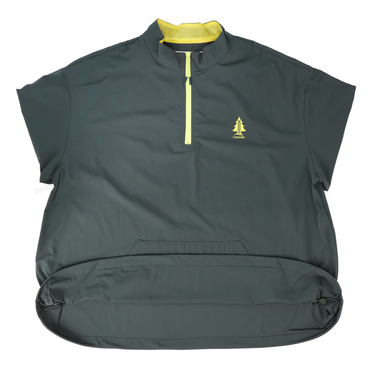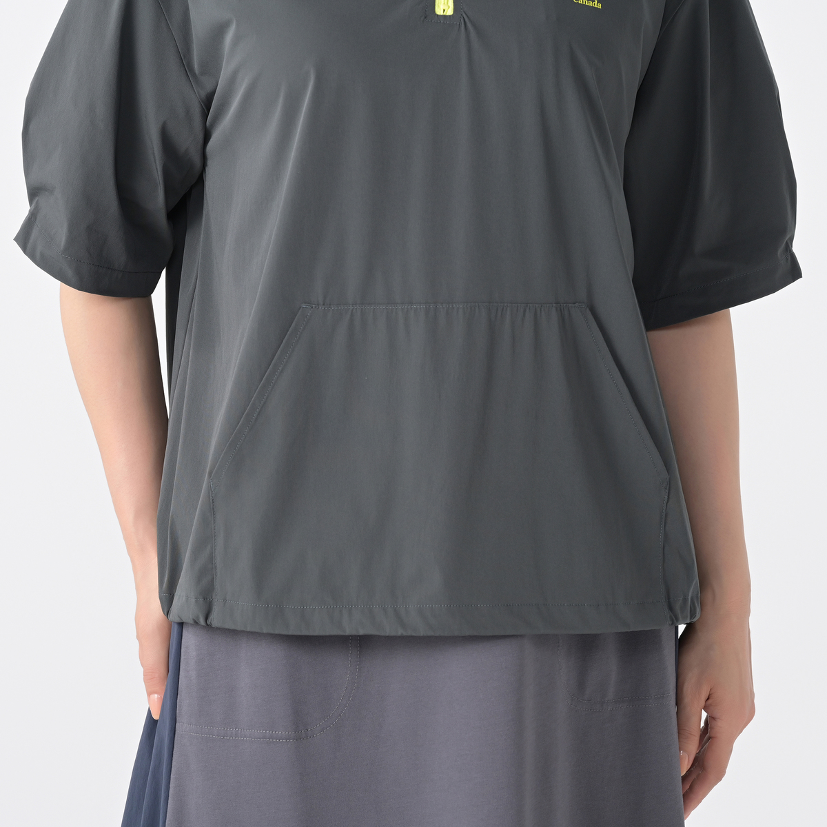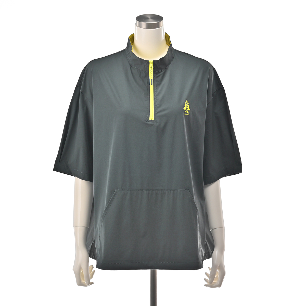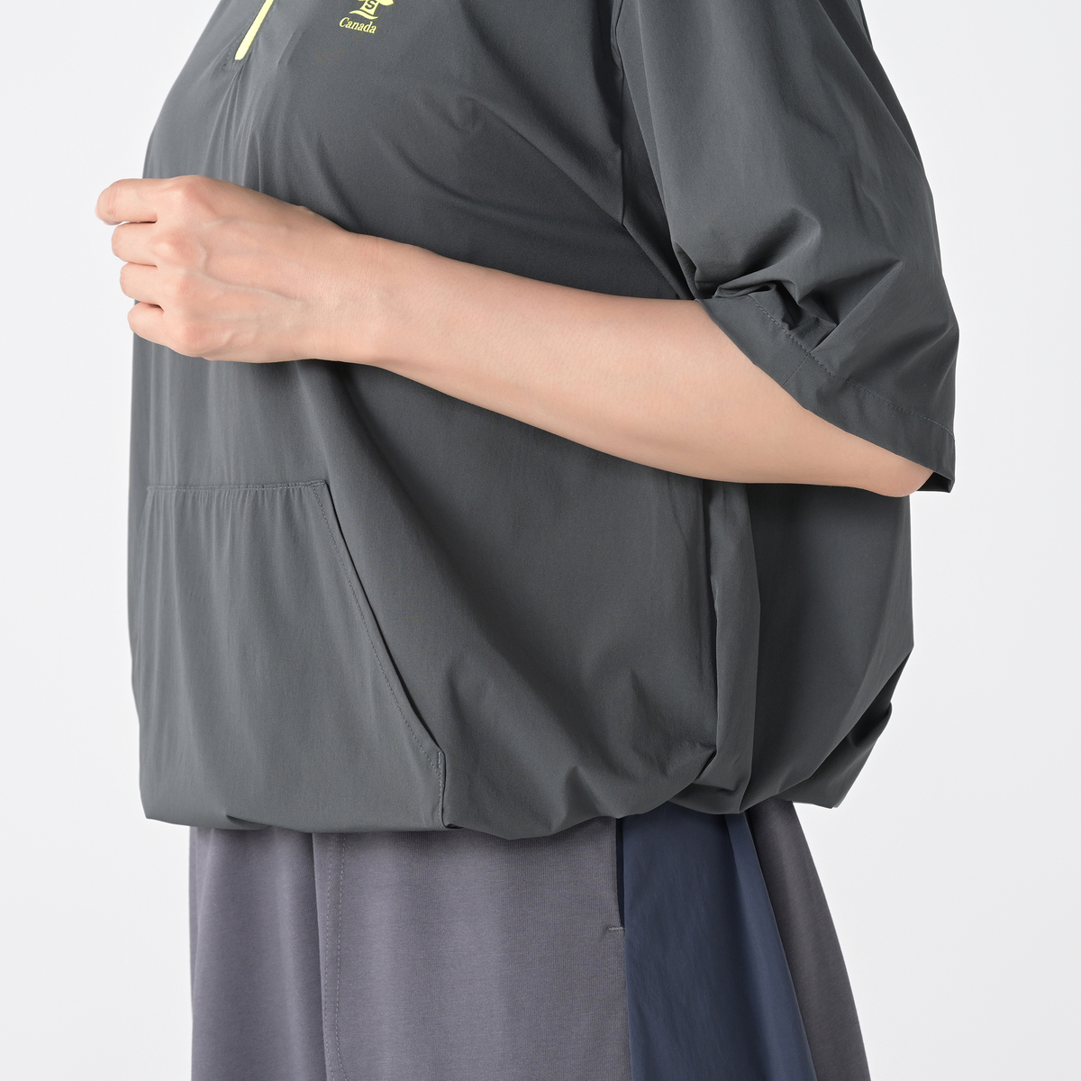 トラックジャケットのディテールを取り入れたプルオーバー。スタンドカラーのハーフファスナー仕様で、閉めてハイネックのように、開けてオープンカラー風にしたり、変化を楽しめます。清涼感のあるアクセントカラーのロゴプリントとファスナーディテールが、夏らしい印象です