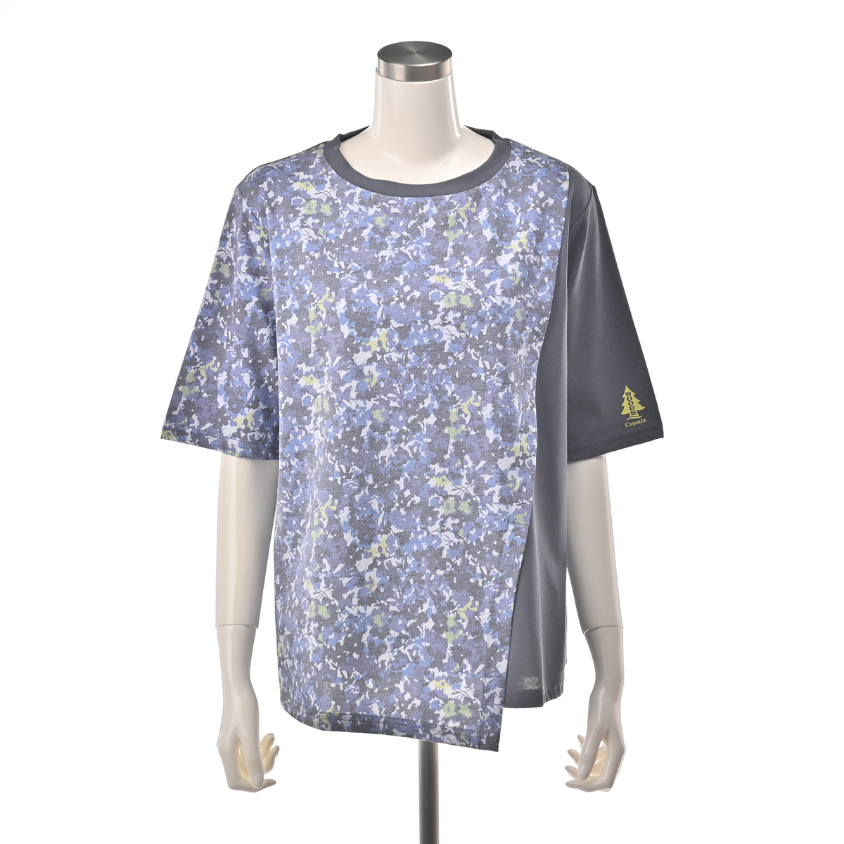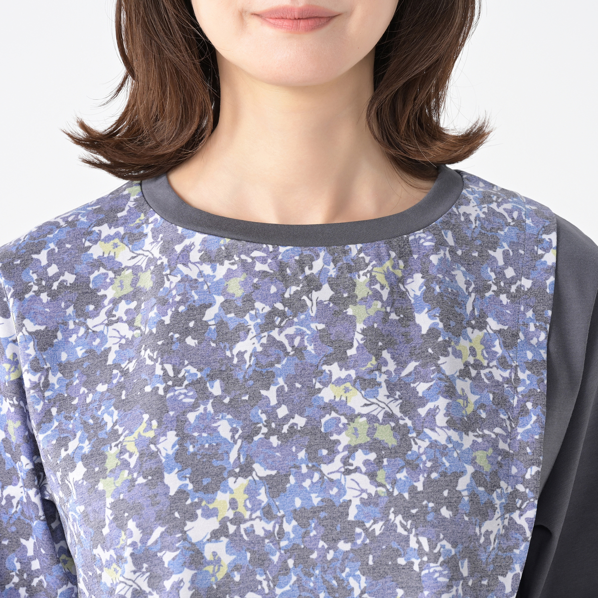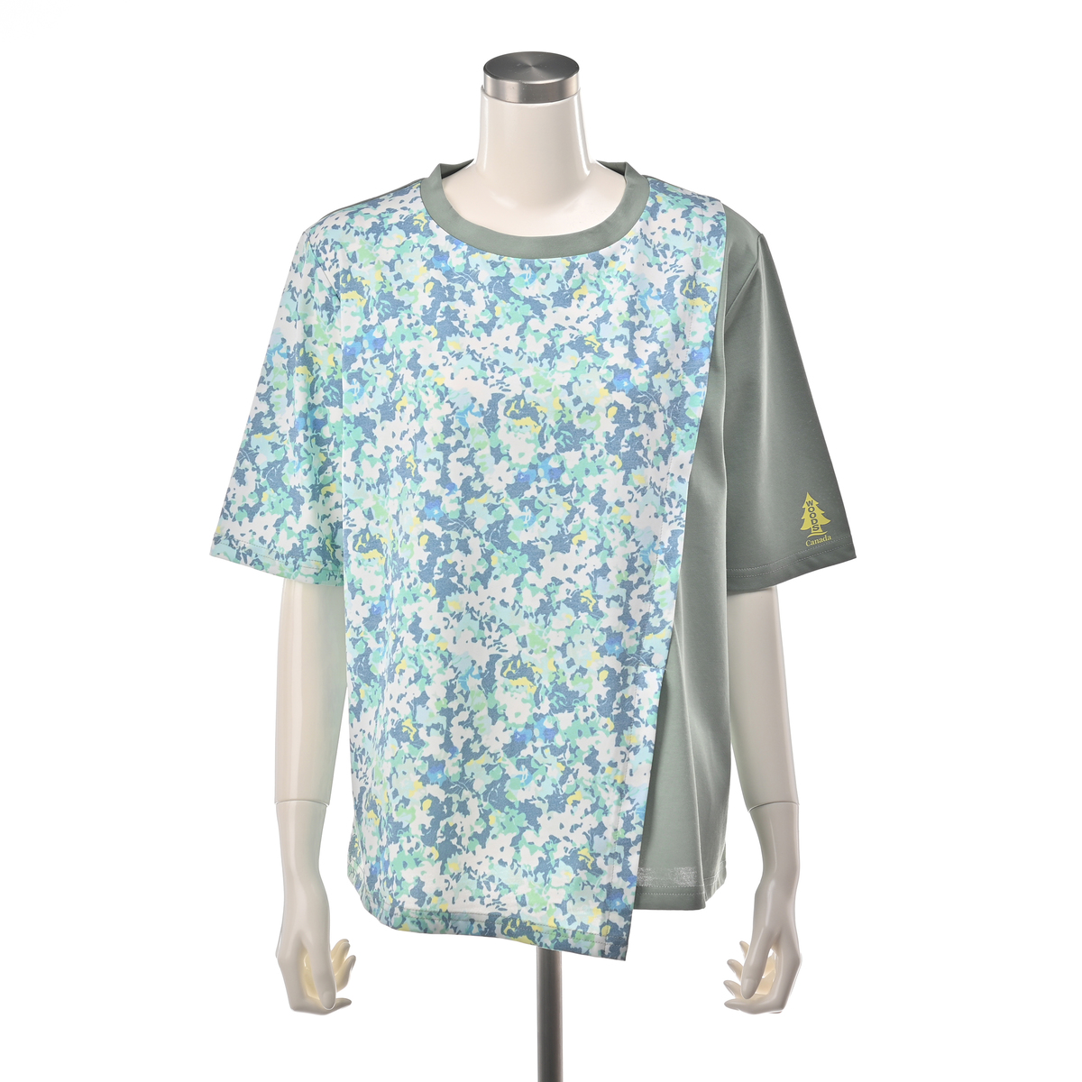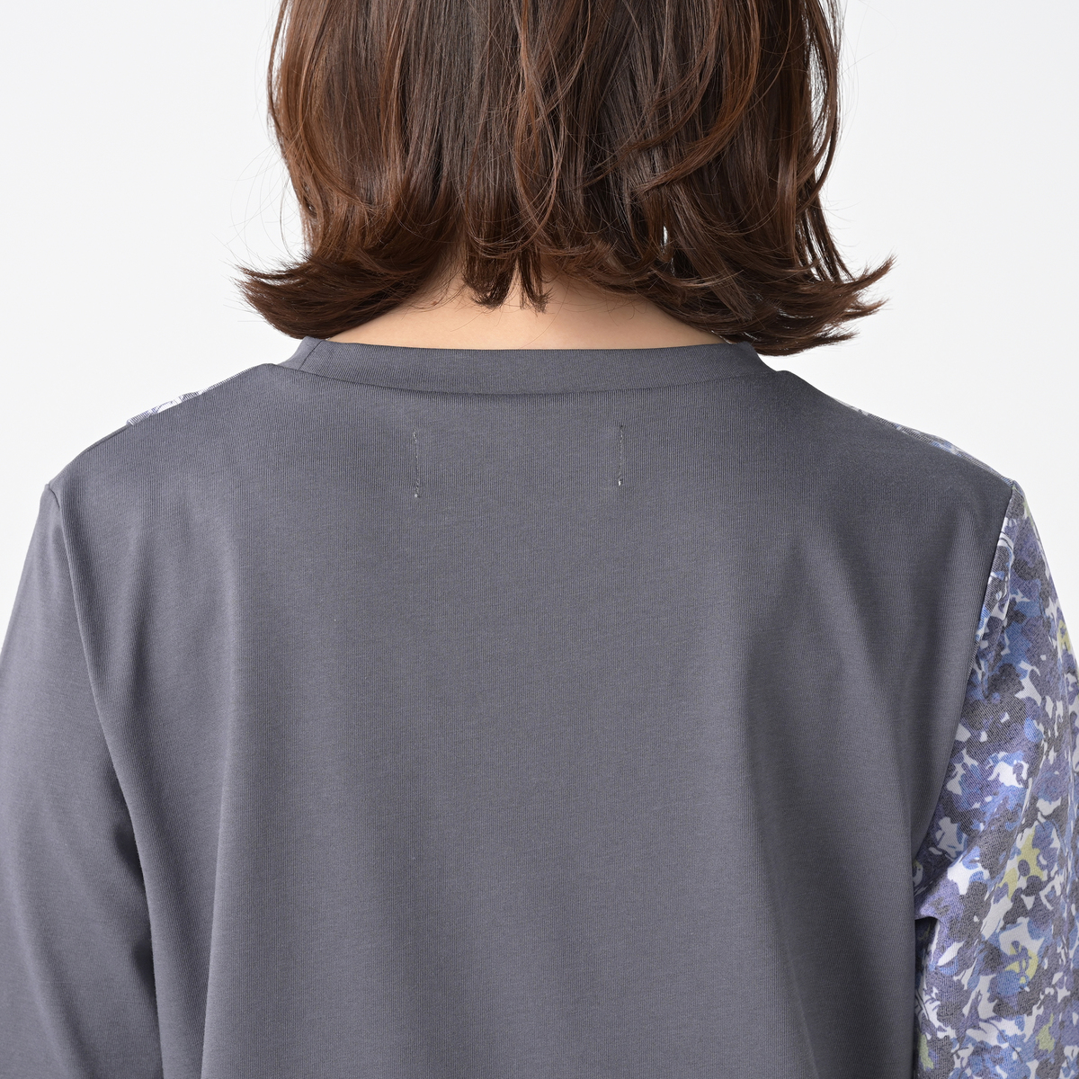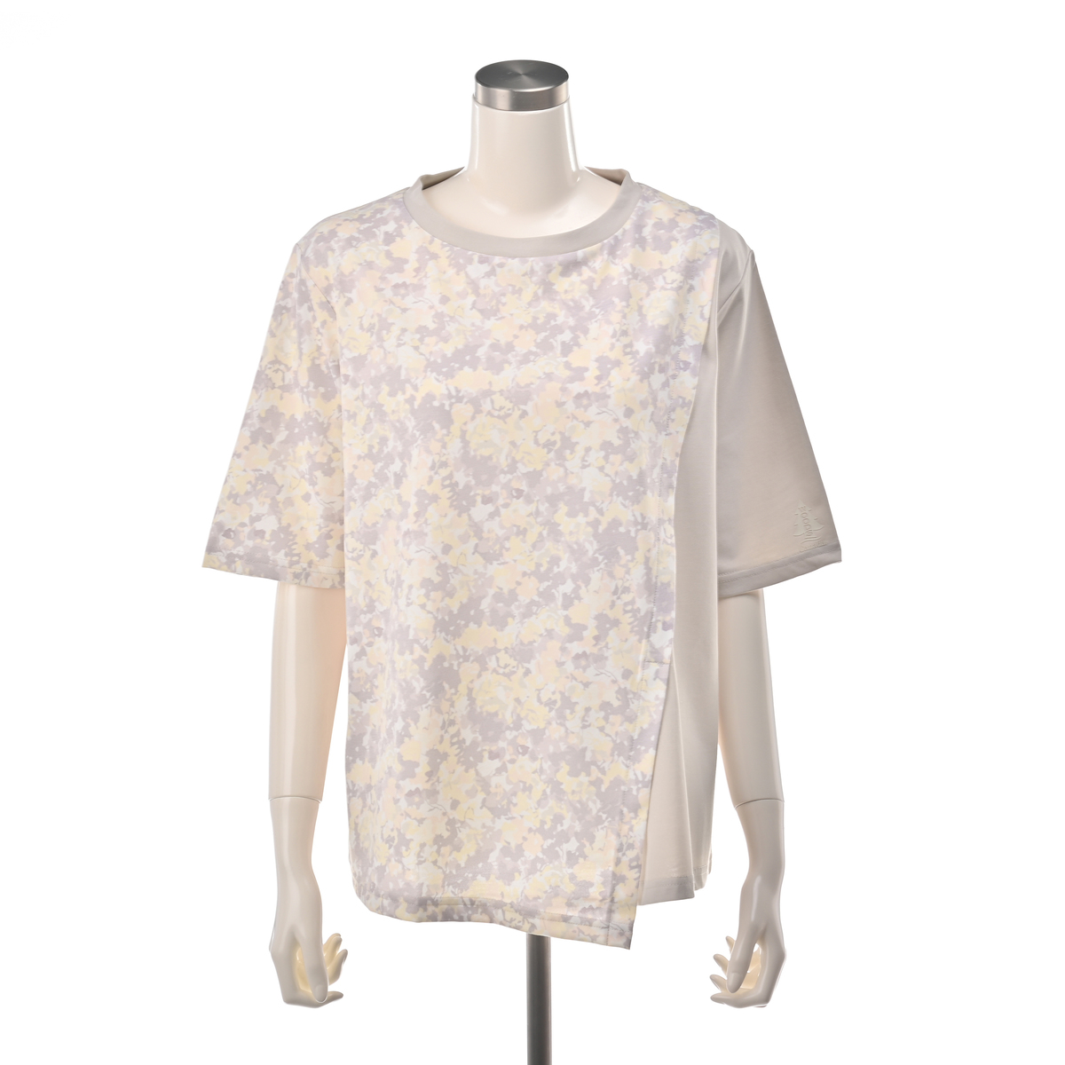 カモフラージュ風フラワープリントを前身頃にあしらったアシンメトリープルオーバー。プリントと同系色の無地を切り替え、立体的なフォルムに仕上げました