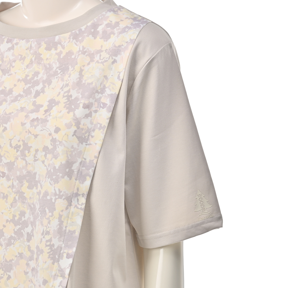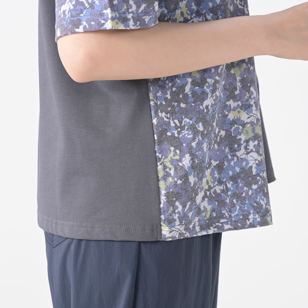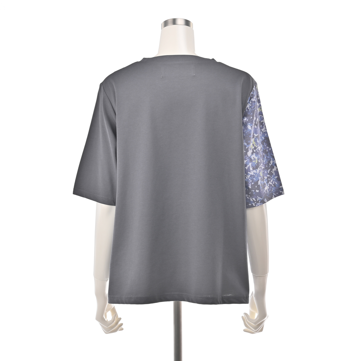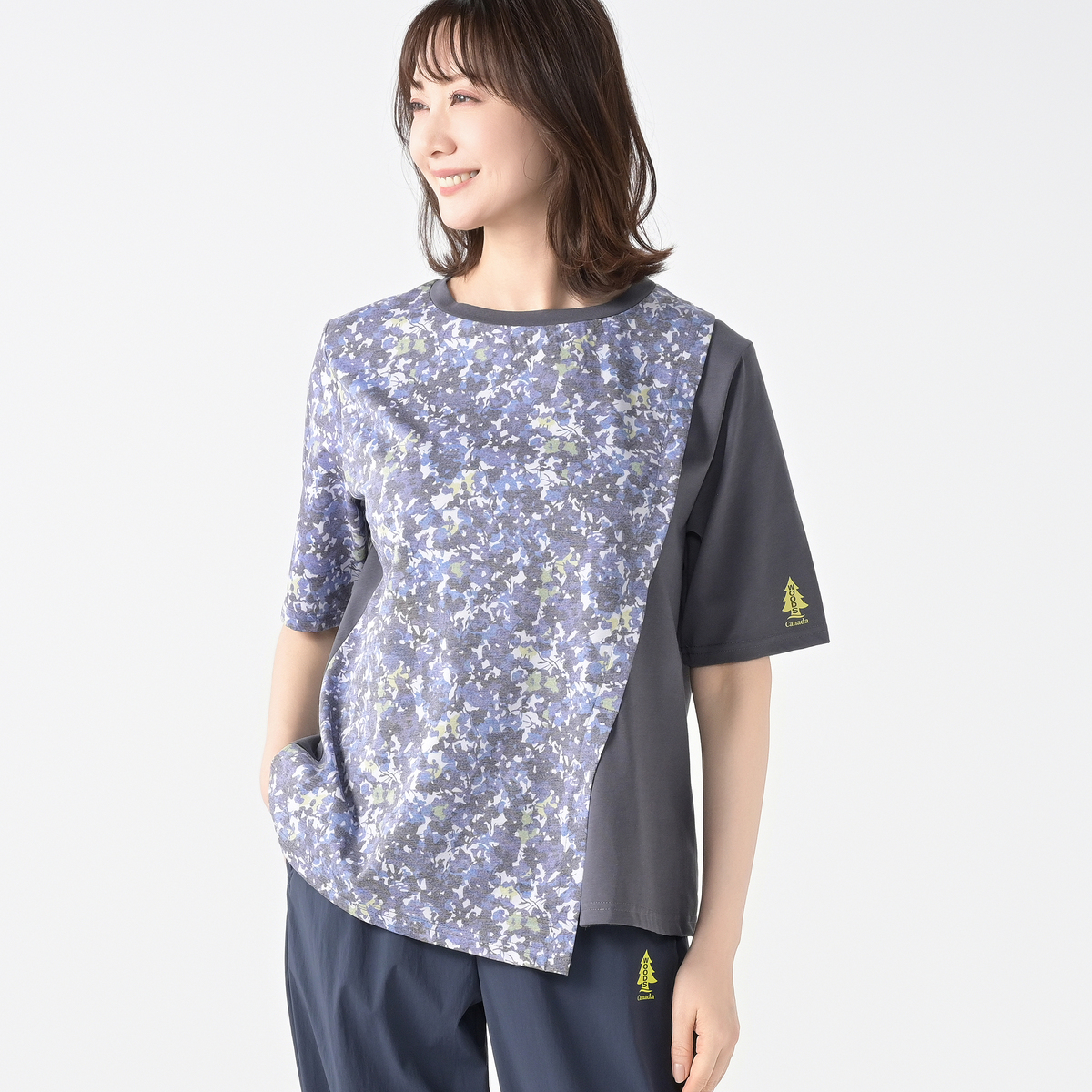 カモフラージュ風フラワープリントを前身頃にあしらったアシンメトリープルオーバー。プリントと同系色の無地を切り替え、立体的なフォルムに仕上げました
