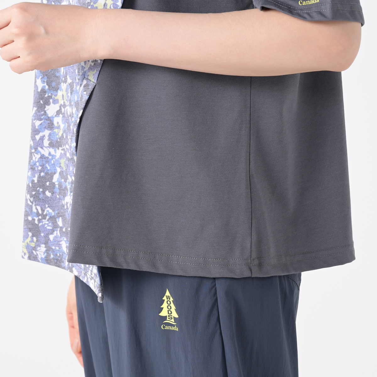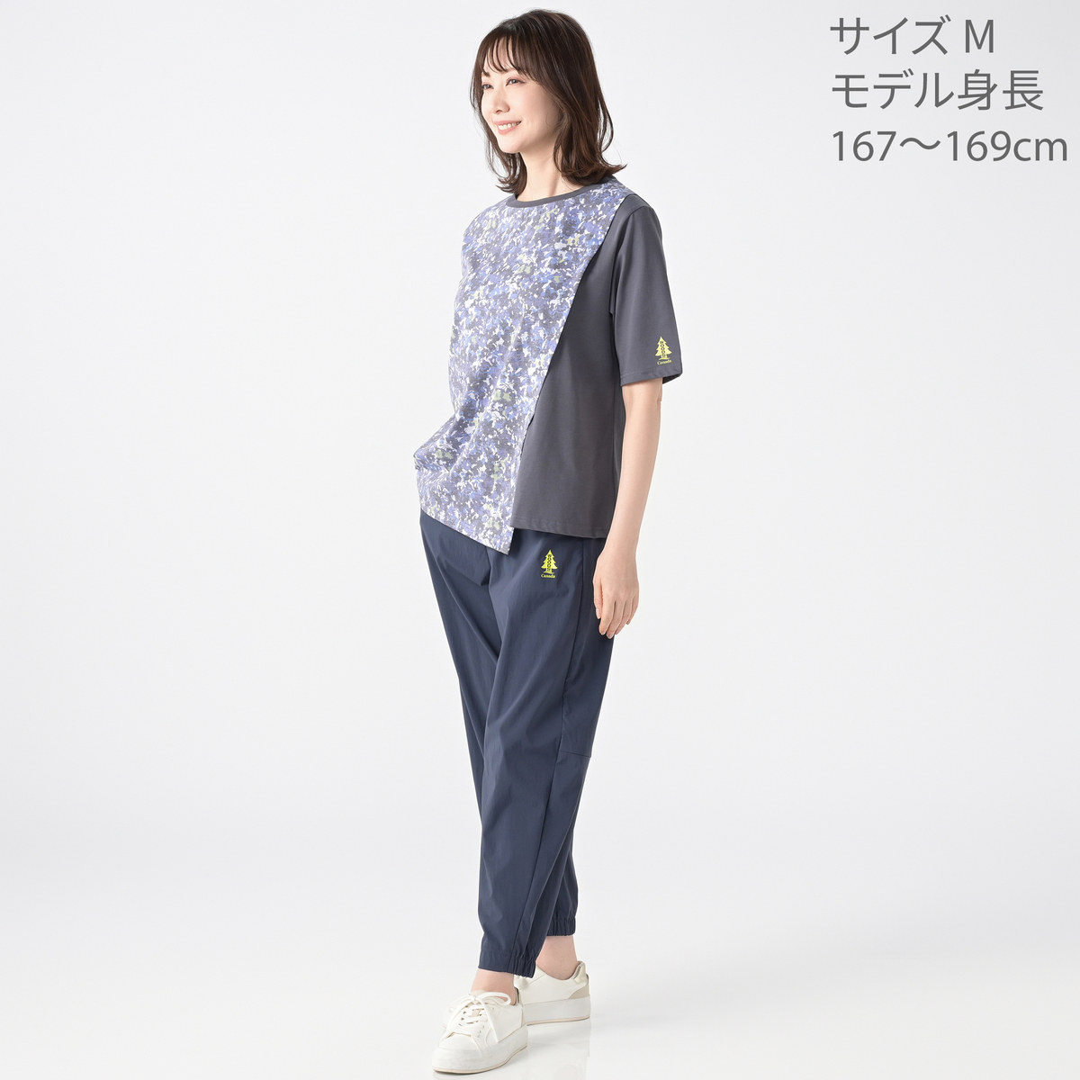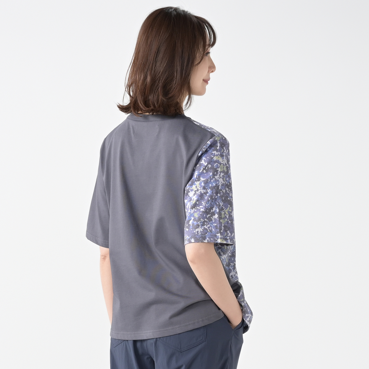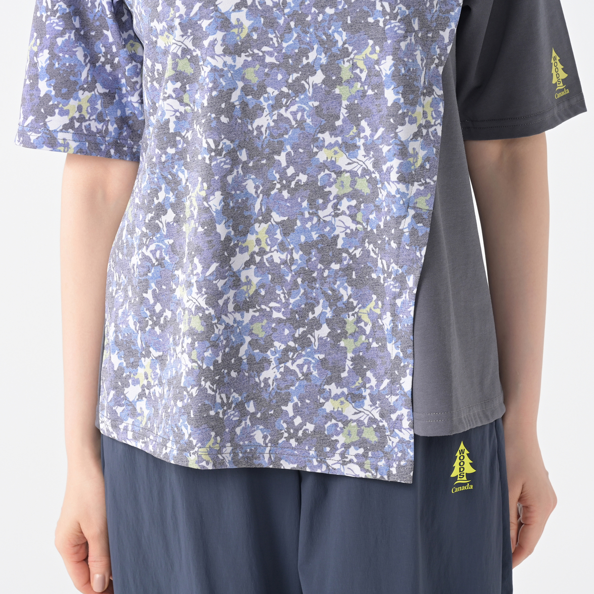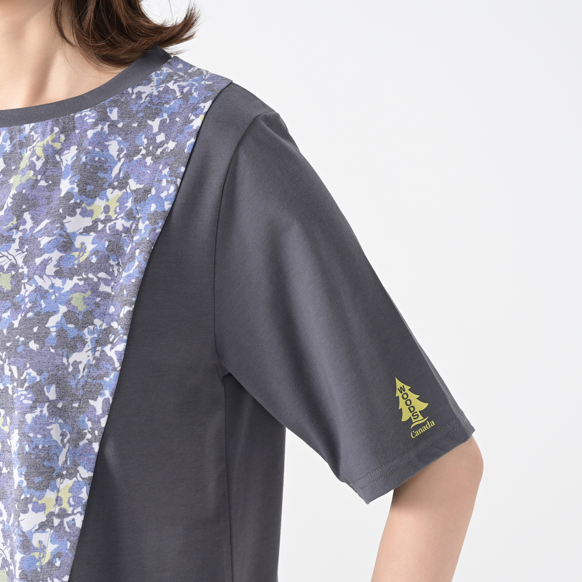 カモフラージュ風フラワープリントを前身頃にあしらったアシンメトリープルオーバー。プリントと同系色の無地を切り替え、立体的なフォルムに仕上げました