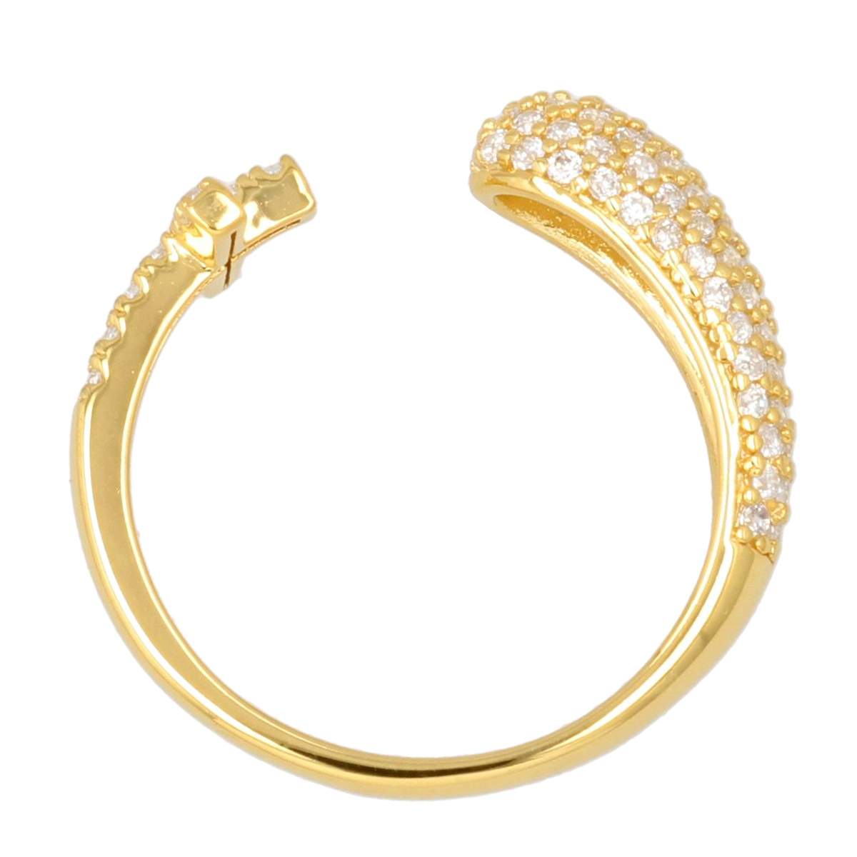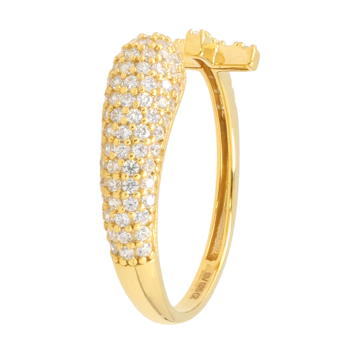 ダイヤモニーククリアCZを贅沢にあしらったフォークリングです。片側はクロスモチーフ、もう一方はパヴェセッティングで、輪が一周せずに一部開いたデザイン。小粒のダイヤモニークが繊細に輝き、印象的な指元を演出します