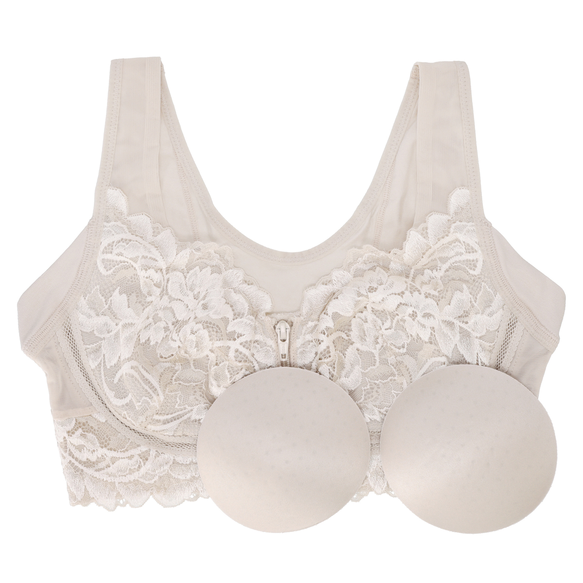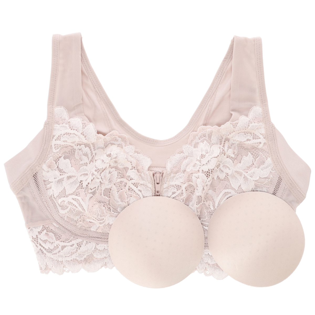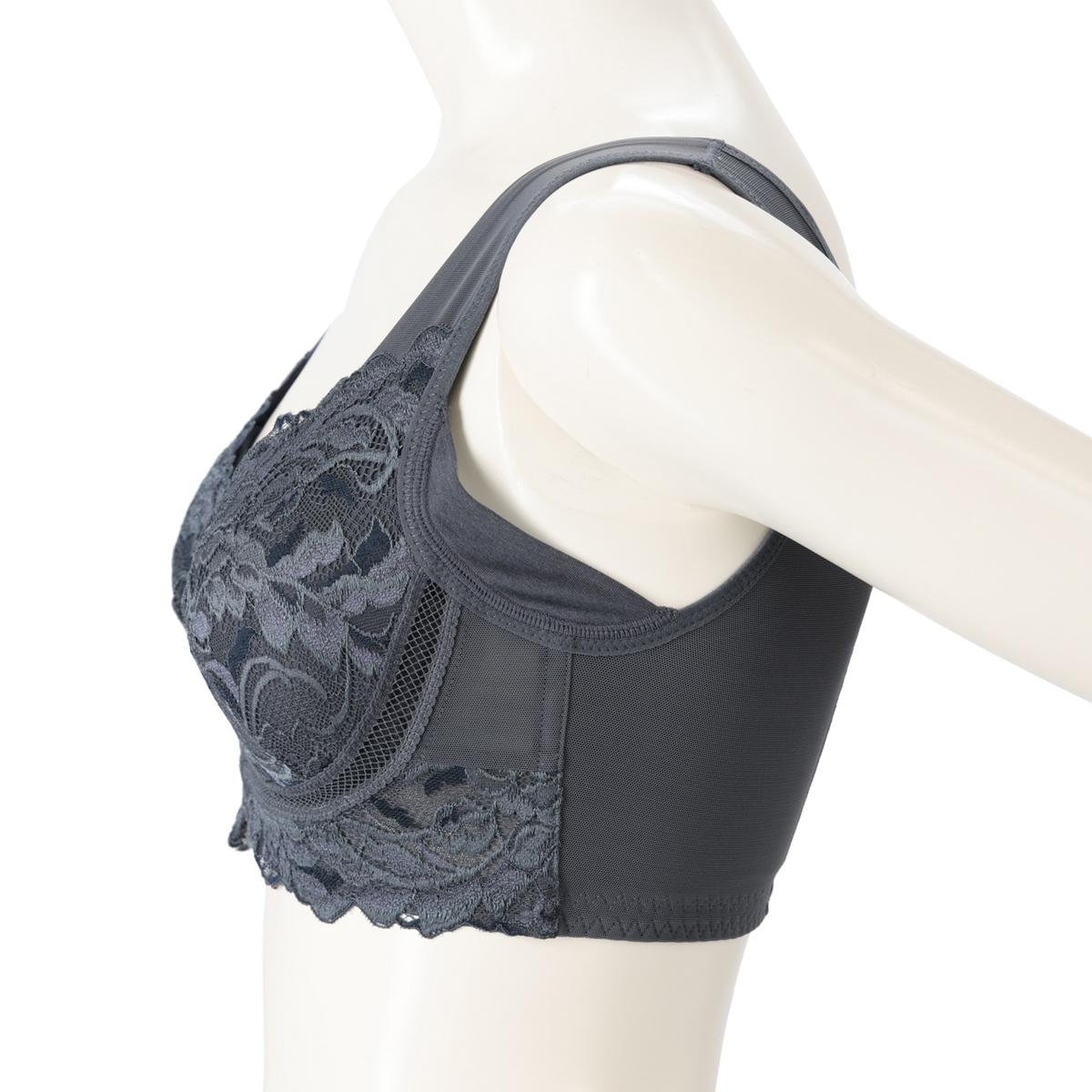 [商品寸法(ヌード)cm] サイズ バスト S:(72〜80) M:(79〜87) L:(86〜94) LL:(93〜101) 3L:(100〜108) 4L:(107〜115) 5L:(114〜122) [仕様]・フルカップ・ワイヤー無・パッド有(取外し可)・ホック無 [素材] クリームベージュ、アッシュブルー、ヌーディピンク、ロイヤルグレー:ポリエステル・綿・その他 ブラック、グレージュ:ナイロン・綿・その他 [お手入れ] 洗濯機洗い可 [注意事項] ※濃色商品は、染色の性質上、洗濯すると色落ちする事があります ※淡色や白物と組み合わせての着用や洗濯はお避け下さい ※長時間濡れたままで放置しないで下さい ※淡色製品には蛍光増白剤入り洗剤を使用しないで下さい ※繊細なレースを使用している為、引っ掛かりなどには十分ご注意下さい ※洗濯により多少縮むことがあります ※洗濯の際は商品を裏返した上、クリーニングネットをご使用下さい ※アイロンの際は当て布を使用して下さい。カップ部分へのアイロンはお避け下さい ※手絞りの場合は弱く、脱水は短時間で行って下さい 【中国製】