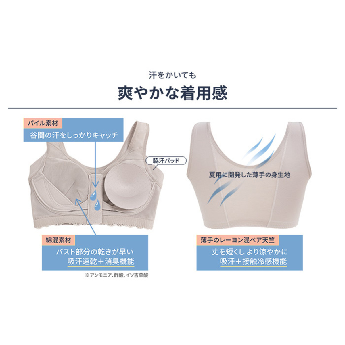 パワーネットのほか、身生地は接触冷感機能や吸汗性のあるレーヨン綿ベア天竺を部分的に使用。はみ肉ストッパー&汗取りパッドは、レーヨン綿ベア天竺を折り返した二重生地。バストのパッドポケットとレースタイプの裏カップには汗臭(アンモニア、酢酸、イソ吉草酸)の消臭機能があり、バストまわりの汗のニオイをケアします