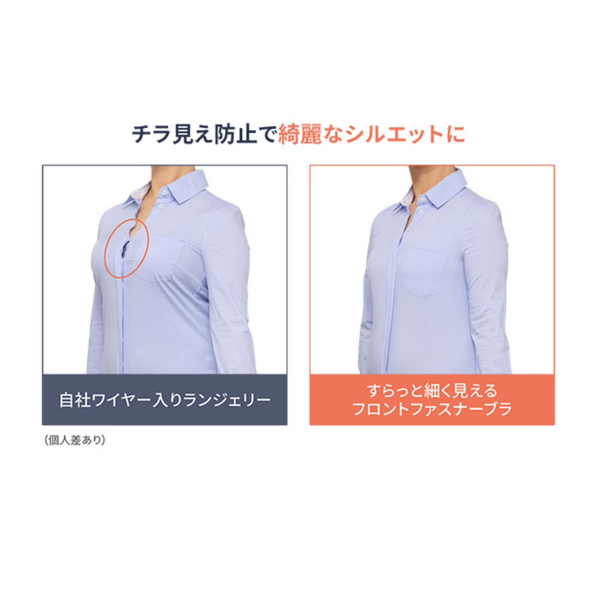 特許取得*の立体メイクパネルが立体にバストメイク。吊り上げループに縫い付けることで、パネルが固定されてより立体に可動し、バストをすくい上げて細見え効果がアップ。カップ部分は表素材/裏カップ/パッドポケットの三重仕様で、ホールド力もあり、バストを支えます