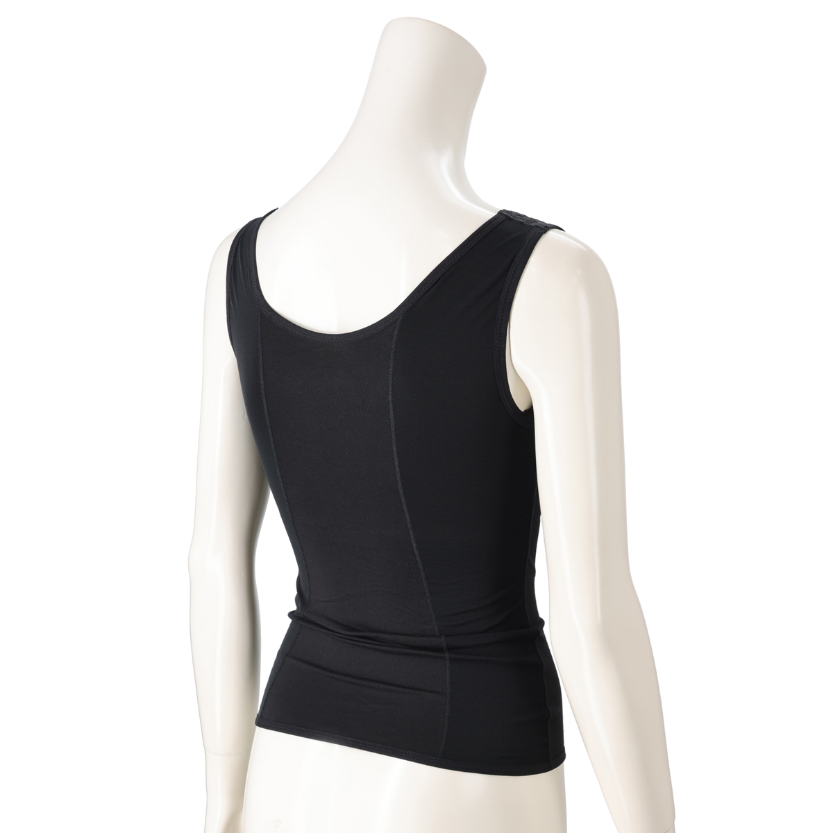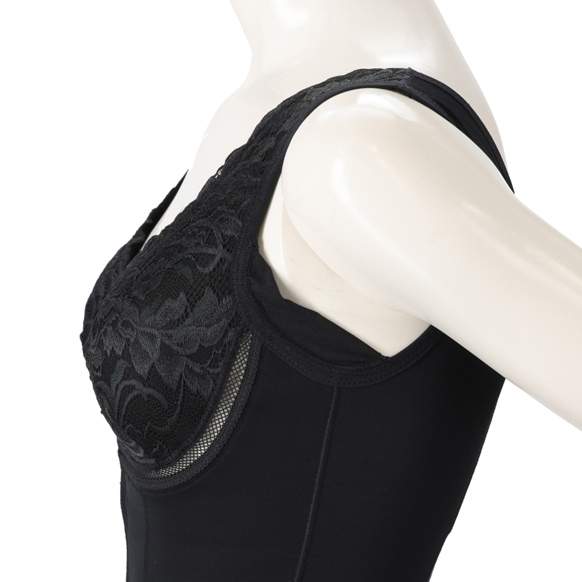 幅広のショルダーは楽に伸びて肩への負担を軽減。肩まわりの可動域が増え、アームホールも楽々です。背中は変形ボディメイクパネルで、バストと背中のお肉を同時に整えつつ、楽に着用できるよう、背中のパワーネットを部分的に抜き、着圧を調整しました