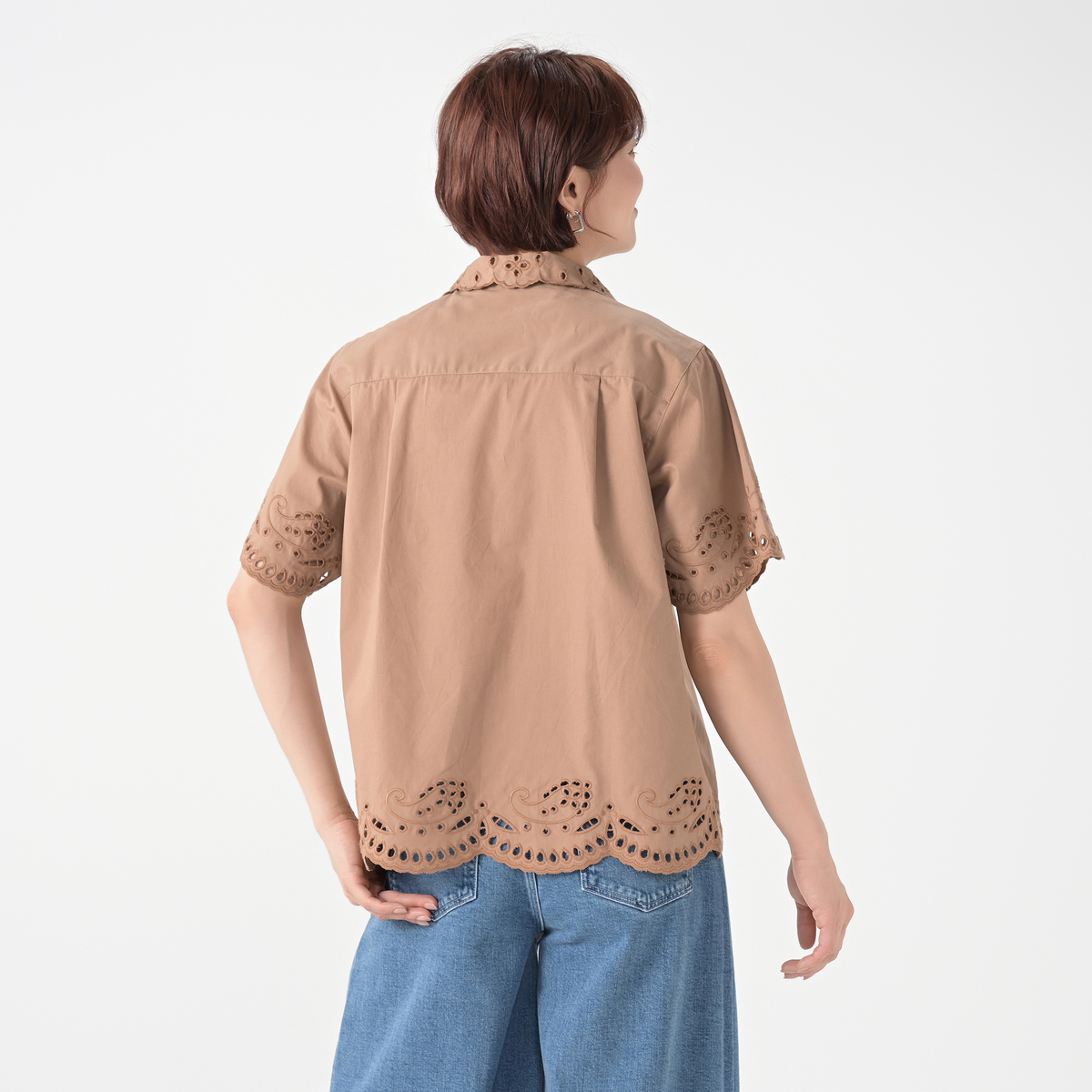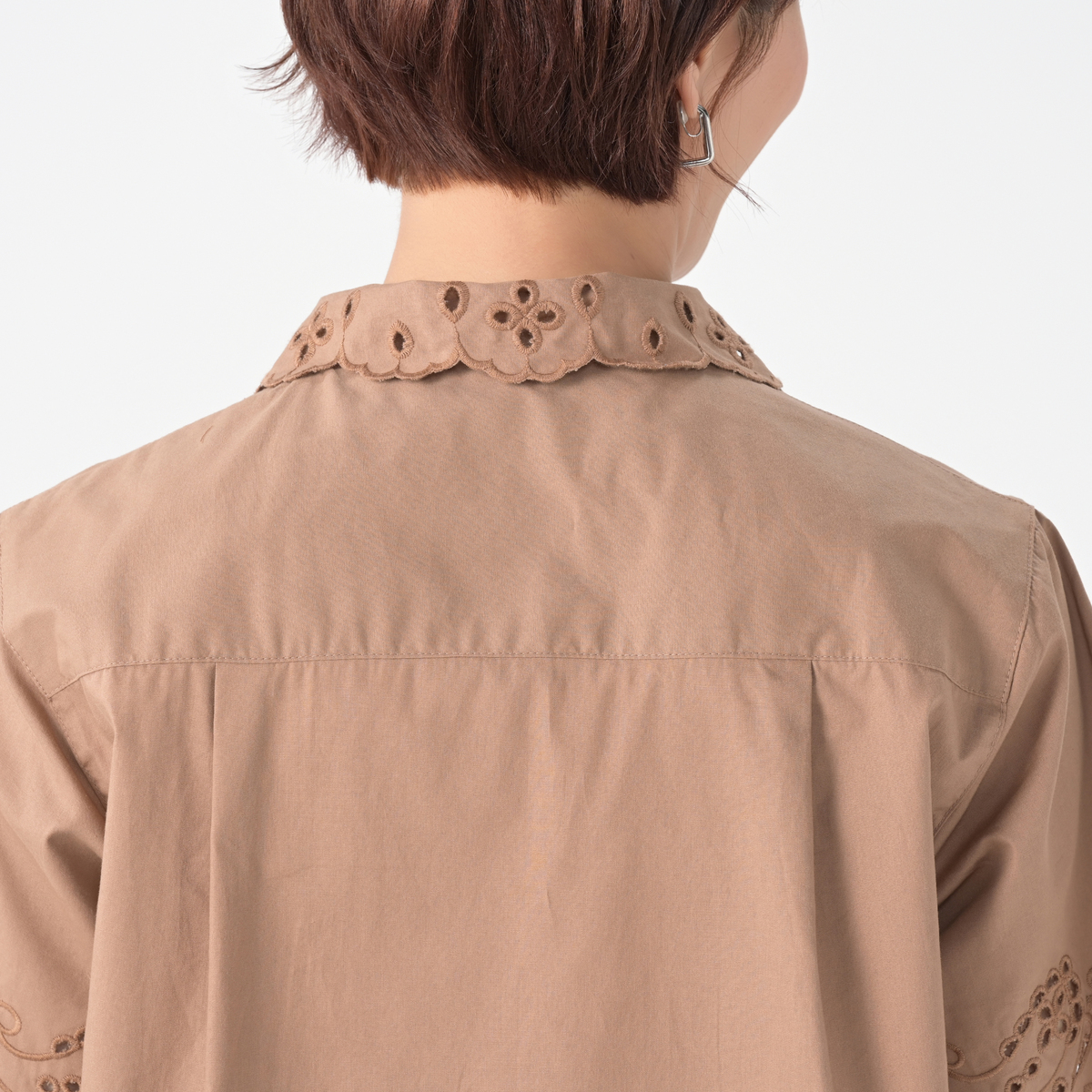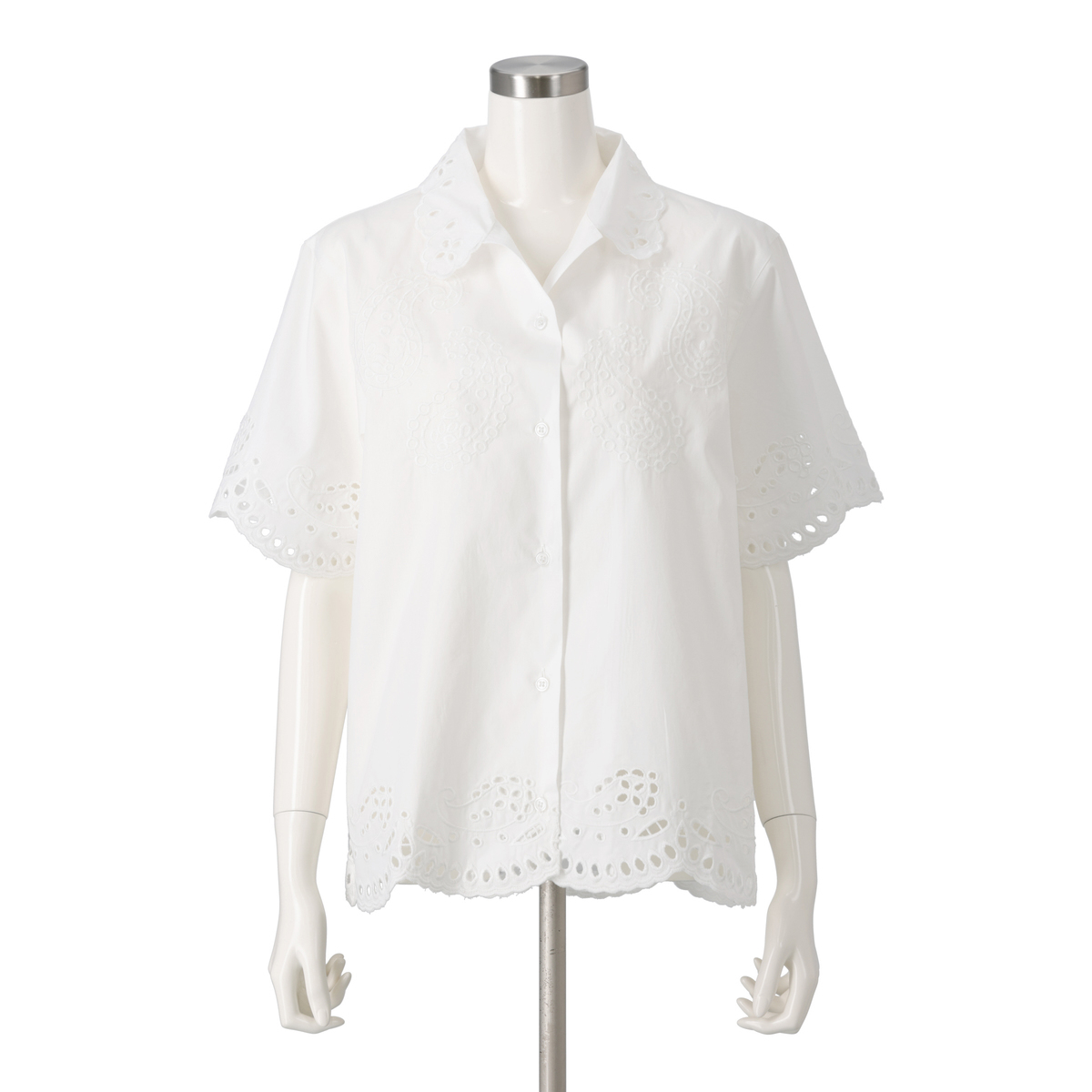 開襟えりと5分袖が涼しげなレディーライクなデザインで、レース調のカットワークがヘルシーな抜け感を演出。胸部分の刺繍にはカットワークをしていないので、安心して着用できます。やや広めの袖口が気になる二の腕を優しくカバーします