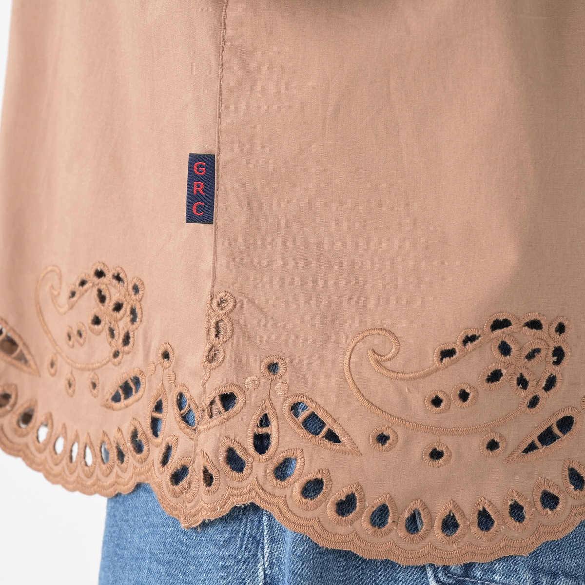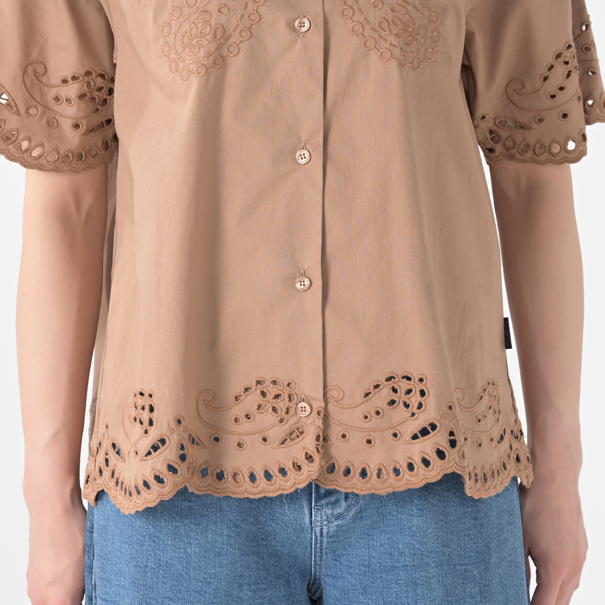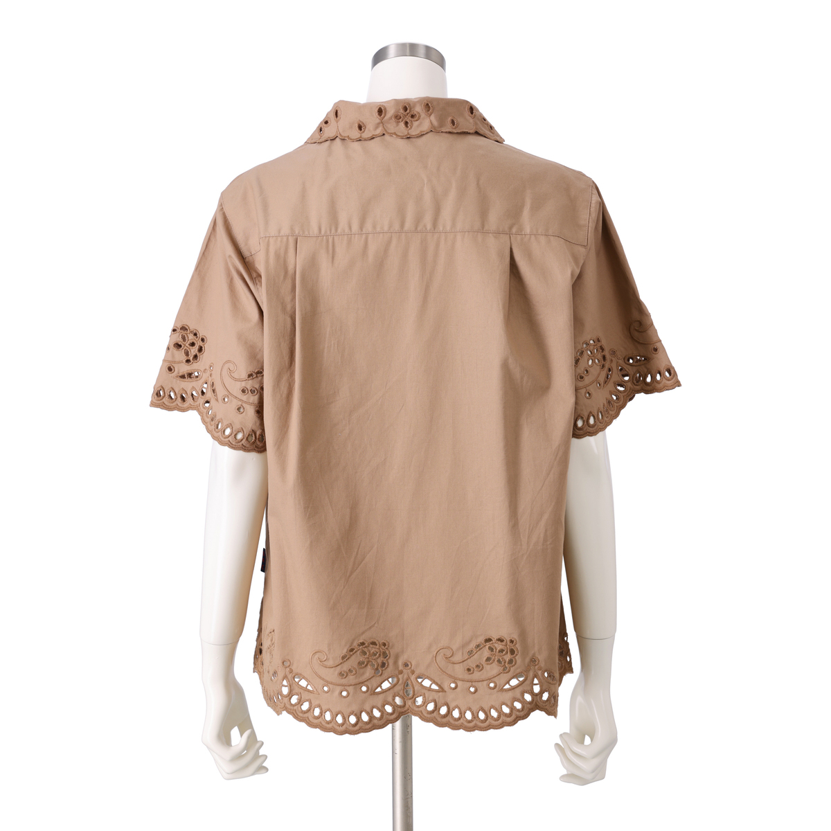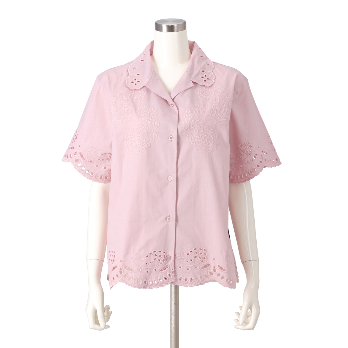 開襟えりと5分袖が涼しげなレディーライクなデザインで、レース調のカットワークがヘルシーな抜け感を演出。胸部分の刺繍にはカットワークをしていないので、安心して着用できます。やや広めの袖口が気になる二の腕を優しくカバーします