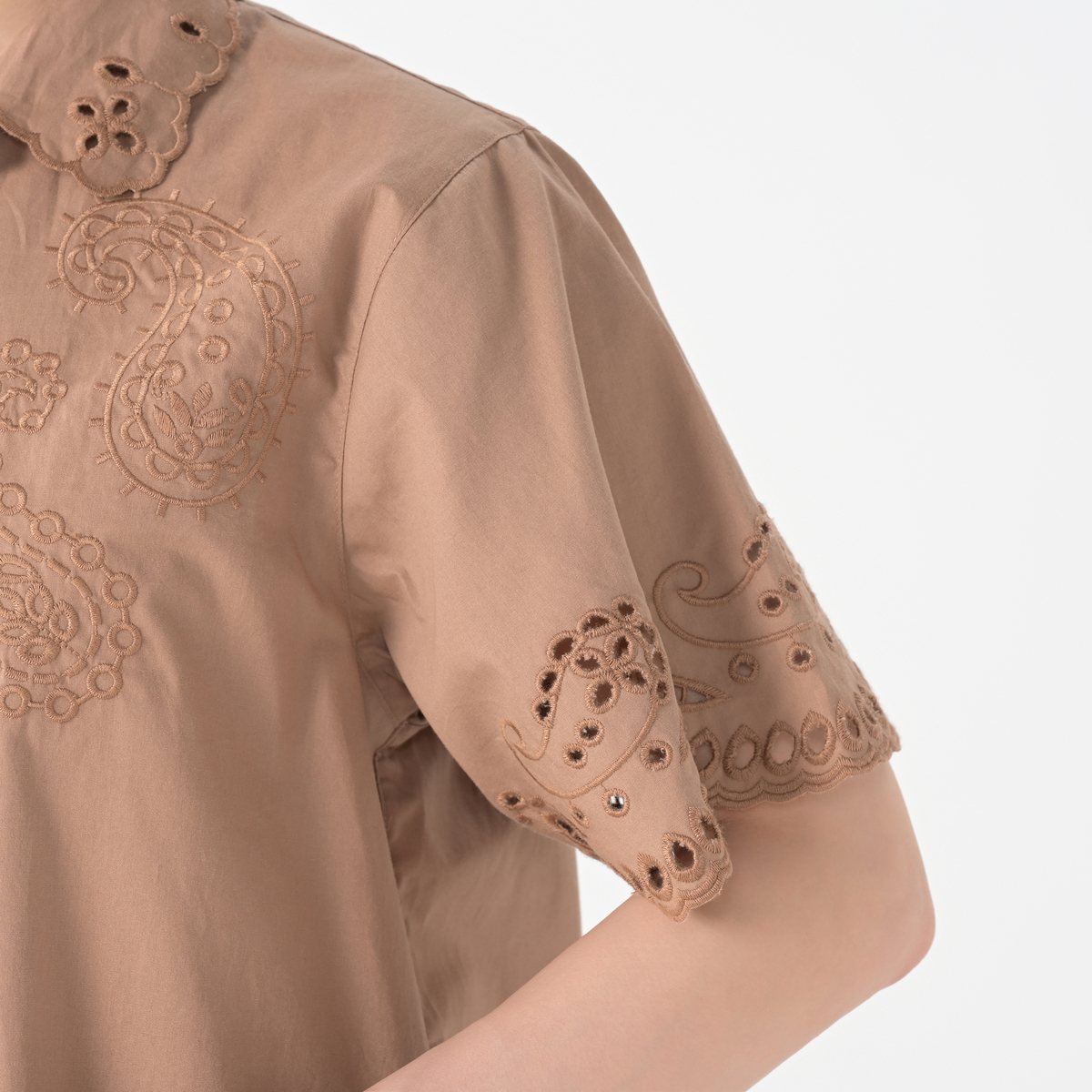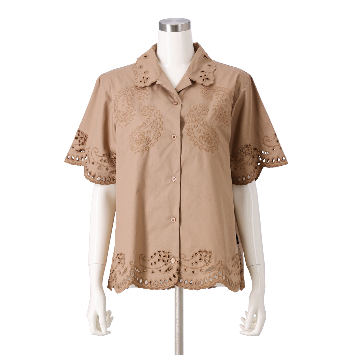 えり、袖、裾、胸にペイズリー柄の刺繍を施したシャツ。本体生地は綿100%の布帛素材でサラッとしていて、気持ち良い肌触りが特徴のブロード素材です。左脇のウエスト下にオリジナルピスネーム付けました
