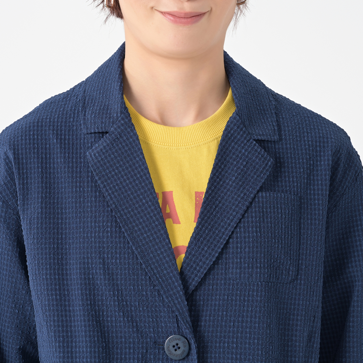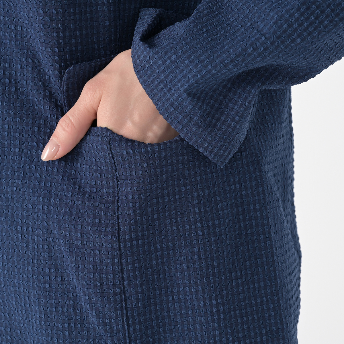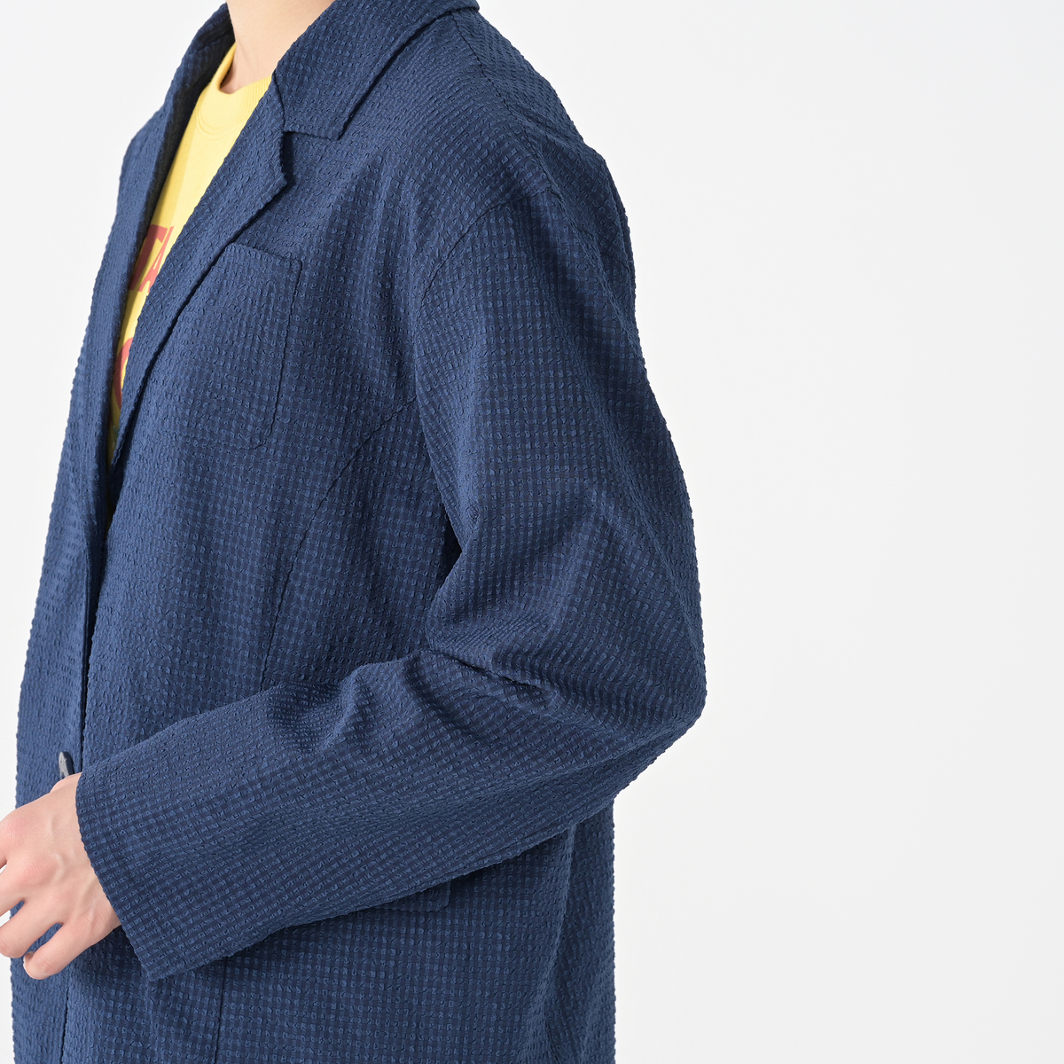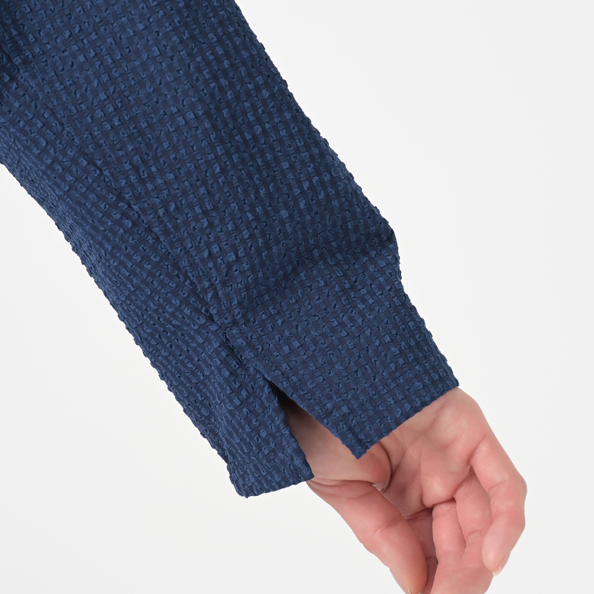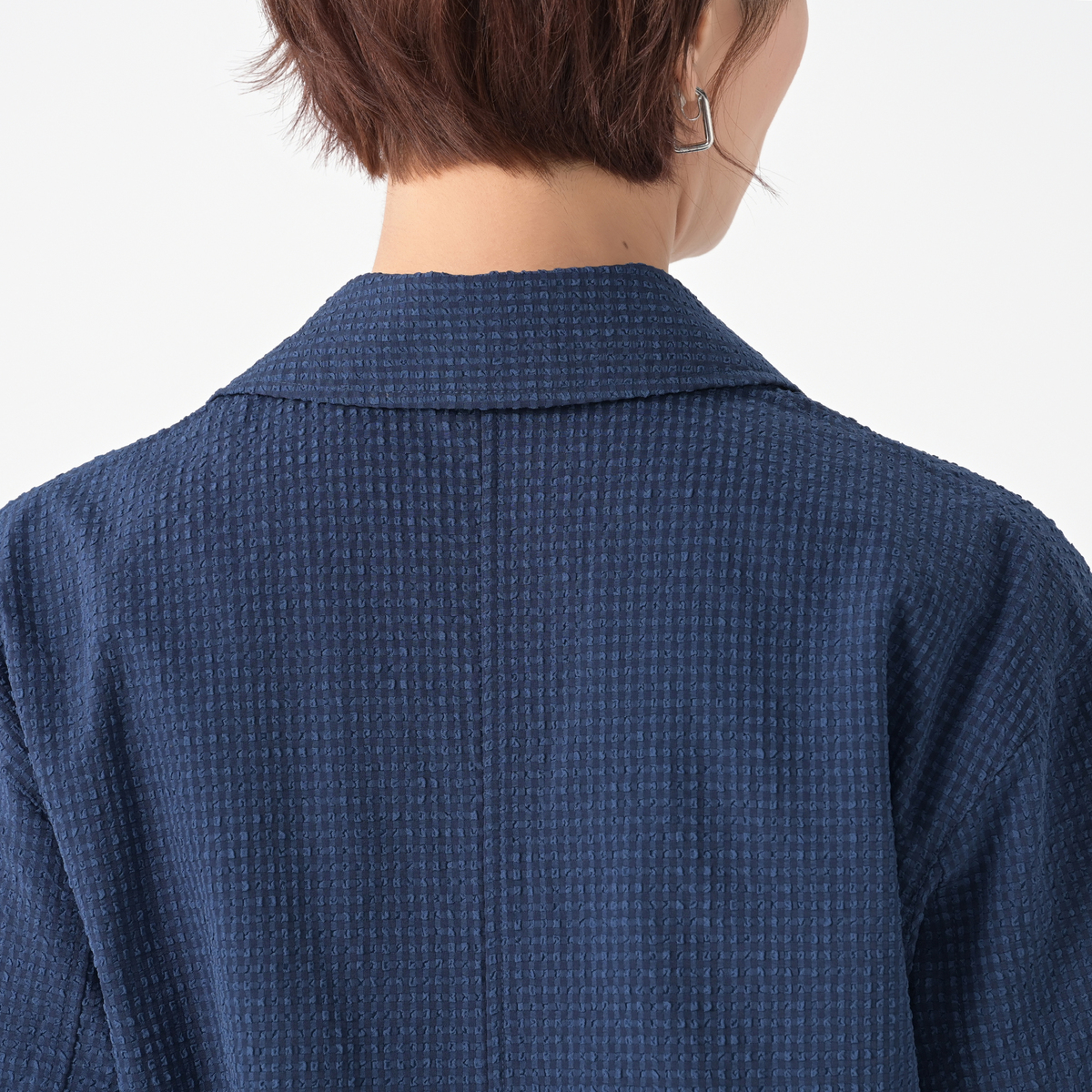 一般的なものよりも少しだけ縞の間隔を広くし、より立体的なシボ感を表現したサッカー素材を使用。吸水速乾、接触冷感、UVカットの機能性も。凹凸が大きいほど、カジュアルでふんわりとした優しい印象に。織りによるナチュラルなストレッチがあります