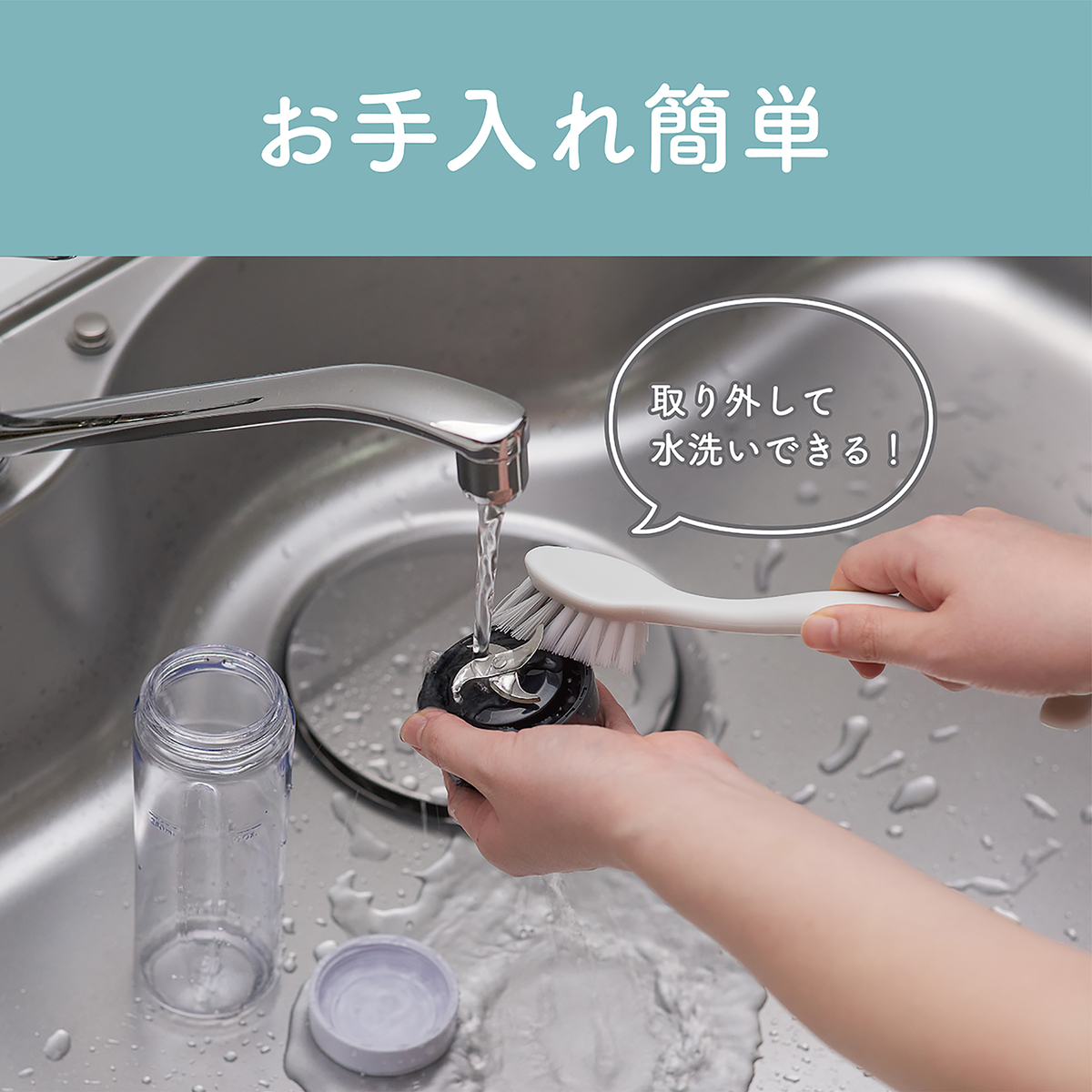 コンパクトで*2キッチンにおいても邪魔にならなず、本体、ボトル台、ミキサーボトル、キャップを装着した重量も約600gで持ち運びも簡単。ボトル、フタ、ボトル台(カッター)は取り外して水洗い可能です