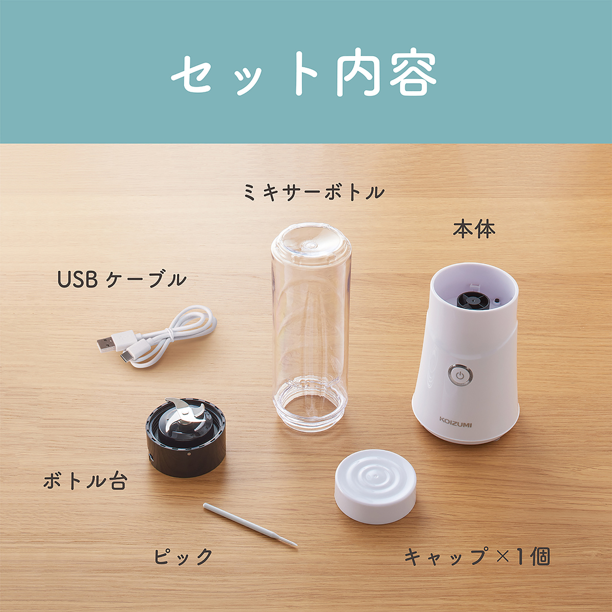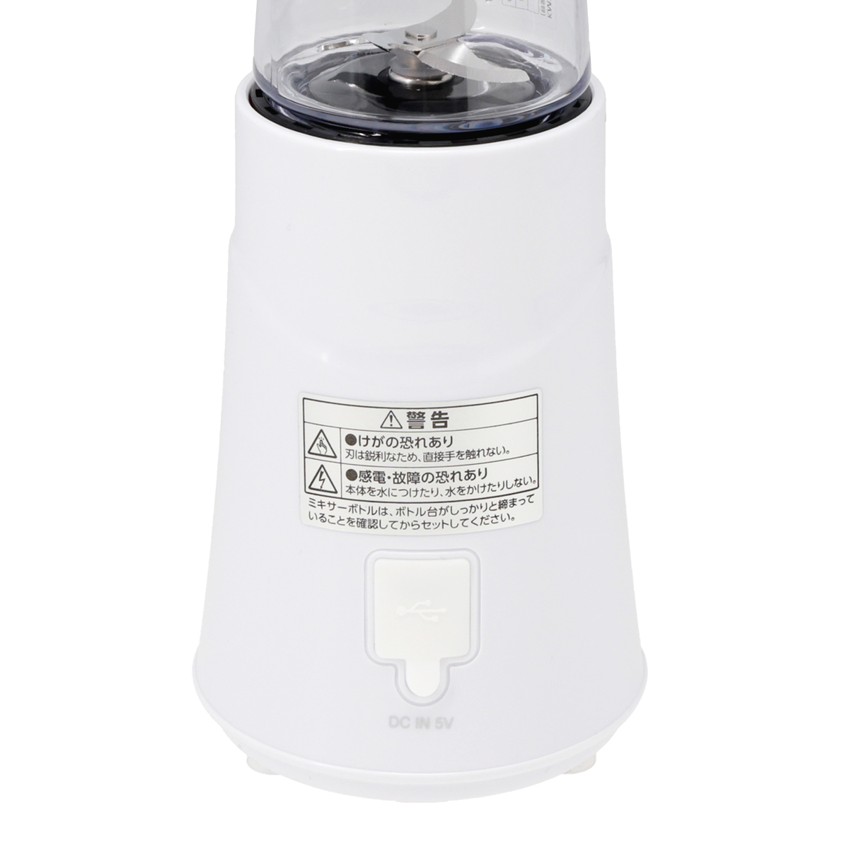 [商品内容] ・本体 ・ボトル台 ・ミキサーボトル ・キャップ ・USBケーブル(TypeAーC) ・ピック ※ACアダプターは付属しません [サイズ] 約幅8.5×奥行8.5×高さ29cm [重量] 約600g [容量] 280ml [材質] 刃:ステンレス [充電時間] 約4時間 [使用可能時間] 40秒×約10回使用可能 (連続使用可能回数:約5回(40秒間運転、1分間停止の連続使用)) 【中国製】 [注意事項] ※使用不可:食器洗い機 ※ACアダプターは付属しません ※改造はしない。修理技術者以外の人は修理をしない※破棄する時以外は分解しない ※USBケーブルは必ずゆとりを持たせて使用する ※USBケーブルは清潔にする。USBケーブルのコネクタに埃が付着している場合はふき取る ※ボトルにボトル台を取り付ける際パッキンがずれていないことを確認する ※USBケーブルに異常がないか確認しピンやごみを付着させない ※落としたり投げつけるなど強い衝撃を与えない ※幼児の手の届くところで使用したり放置したり保管しない ※完全に責任を負う人の監視または指示がない限り補助を必要とする人や子供だけで使わせない ※USBケーブルが傷んだり、接続端子の差込が緩い時は使用しない ※USBケーブルを傷つけたり、破損したり、加工したり、無理に曲げたり、引っ張ったり、ねじったりしない。また重いものを載せたり挟みこんだり、高温部に近づけたりしない ※本体にUSBケーブルを巻き付けない。またUSBケーブルを束ねたまま使用しない ※次のような時な使用しない ・USBケーブルや本体が異常に熱い、または煙が出ている ・USBケーブルに深い傷がある ・USBケーブルがこげている ・異常な音や焦げ臭い ・USBケーブルを動かすと通電したりしなかったりする ※雷が鳴りだしたらUSBケーブルに触れない ※専用のUSBケーブルで他の商品を使用したり充電したりしない。また専用のUSBケーブル以外は使用しない ※出力電圧がDC5V以外の機器に繋がない ※塊の干し椎茸、根昆布等とても固い食品や繊維質の強い食品は粉砕しない ※ボトル台検知装置を細い棒などで押さない ※調理以外の用途で使用しない ※充電残留が空の状態で長時間放置し充電できなくなった場合(過放電状態)は使用しない ※本体を水につけたり、本体に水をかけたりしない ※濡れた手でUSBケーブルを抜き差ししたり使用しない ※充電時以外はUSB-ACアダプターをコンセントから抜く ※部品の取り付け、取り外し、お手入れをするときは電源スイッチを切りUSBケーブルを接続端子から取り外す ※移動させるときは電源を切り、ボトルを持たず本体を両手で持ち上げる。電源スイッチには触れない ※お手入れ後は必ずパッキンを確実に取り付ける ※40秒運転するごとに1分以上休ませる ※取説P7の禁止材料を使用しない ※材料は定格容量以上入れない・不安定なところやテーブルの端などで使用しない ※材料を入れない状態でのカラ回しは絶対にしない ※屋外で使用しない ※業務用で使用しない ※熱湯で洗ったり食器洗い機を使って洗わない。食器緩衝器、食器洗い乾燥機を使って乾燥させない ※運転中にボトルの取り付け、取り外しは行わない ※運転中に移動させない ※カッターに直接手を触れない ※お手入れする時はベンジン、シンナー、アルコール、灯油等の溶剤や薬品類、磨き粉などは使用しない ※40℃以上の熱い材料は容器に入れない ※充電池から漏れた液が目に入った時はすぐに水で洗い流し、医師の治療を受ける ※次のことをしない。液漏れ、ショート、発熱、発火、破損の原因になる ※分解、改造をしない ※火中への投入や加熱をしない ※他の危機に転用しない ※落としたり衝撃を与えたり傷つけたりしない ※端子同士を針金等の金属で接続しない ※充電池から漏れた液が皮膚や衣類に付いた時はすぐに水で洗い流す ※指定の充電時間を超えても充電が完了しない時は充電をやめる ※外装をはがしたり傷つけたりしない ※充電は必ず5〜40℃の環境で行う ※異常に温度が高くなる場所(火やストーブのそば、直射日光が当たるところ炎天下の社内等)に放置しない