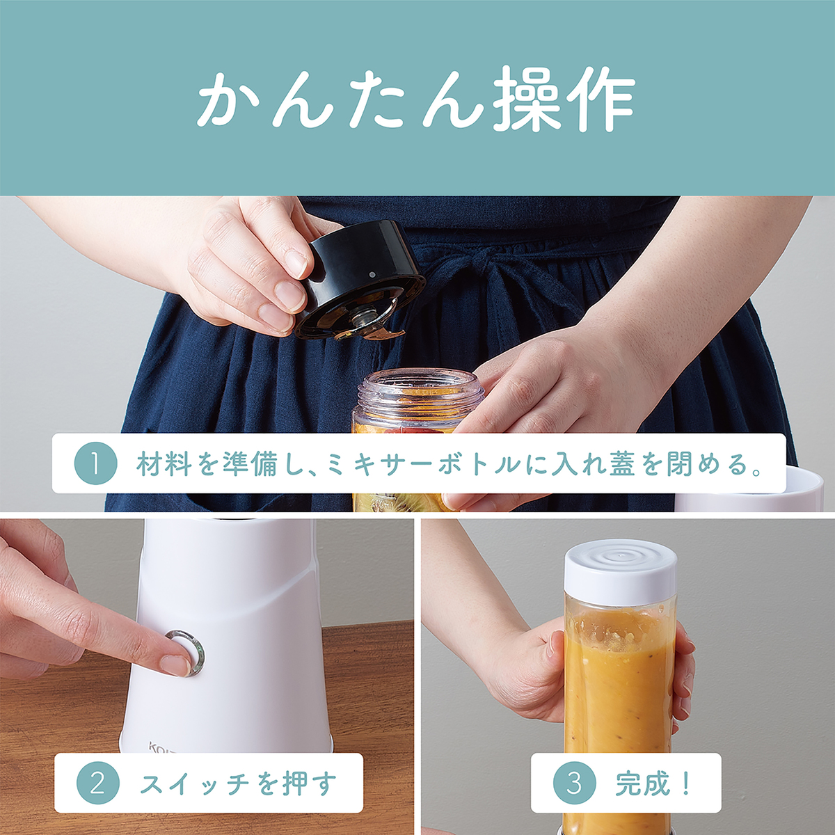 材料を入れてスイッチを押すだけの簡単操作。タンブラーボトル用のキャップが付いたボトルミキサーです。作ってボトルに入れたまま持ち運びができます*1。本体側USB Type C対応のUSB充電式です