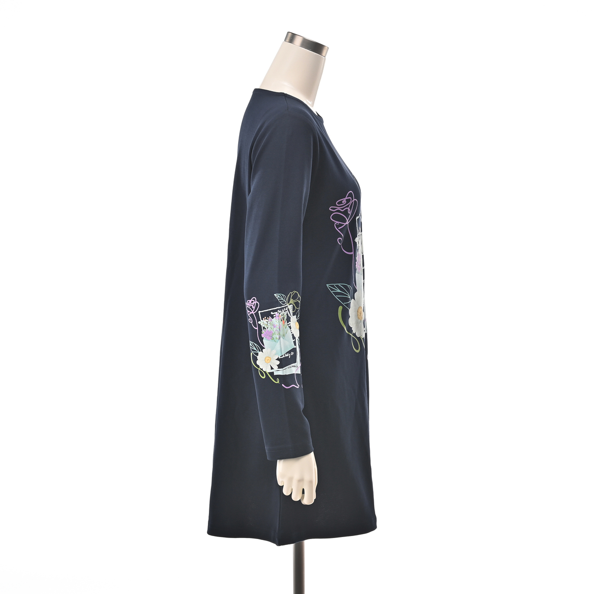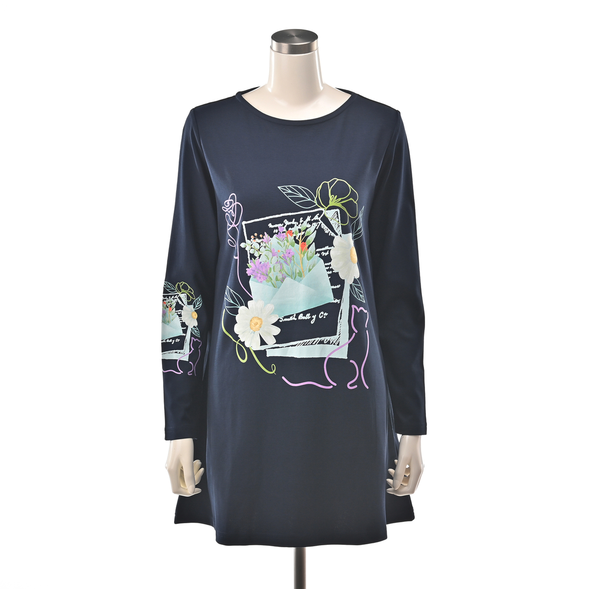 半袖チュニックTシャツを持っており、長袖の同じ物を探していました。しっかりした生地が安心です。今も手紙が好きなので、封筒にお花の柄が気に入りました。落ち着いたネイビーに、発色の綺麗な多色で多い柄が素敵です。Fairy Style さんのこの女らしさが良いです。