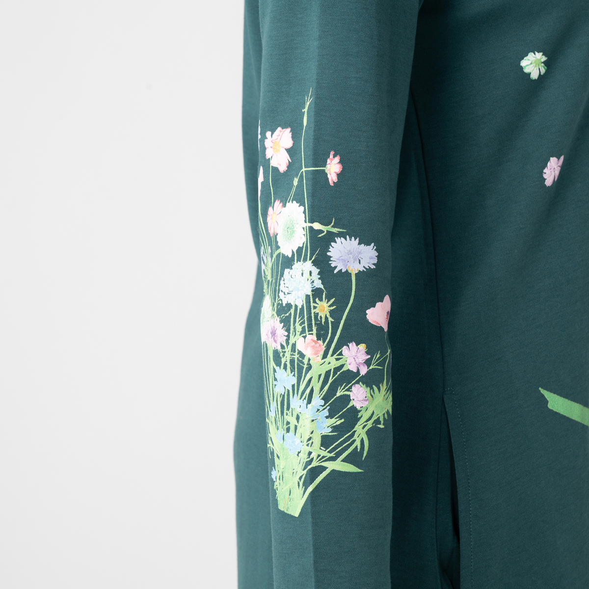 生地は綿100%で肌触りが良く、ストレッチ性があります。美しいお花をモチーフにしたデザインで、シルクスクリーンのように一色ずつ丁寧に色を重ね、きれいなグラデーションを映し出しました。洗濯機洗いできるので、お手入れも簡単です