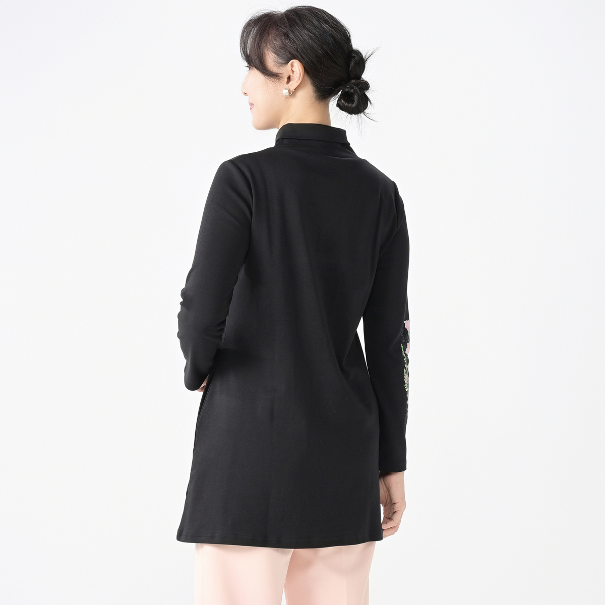 襟元が2枚仕立てになっているおしゃれなチュニック。腰周りからヒップラインまでしっかりカバーする長さで、両脇にポケットもあり機能的です