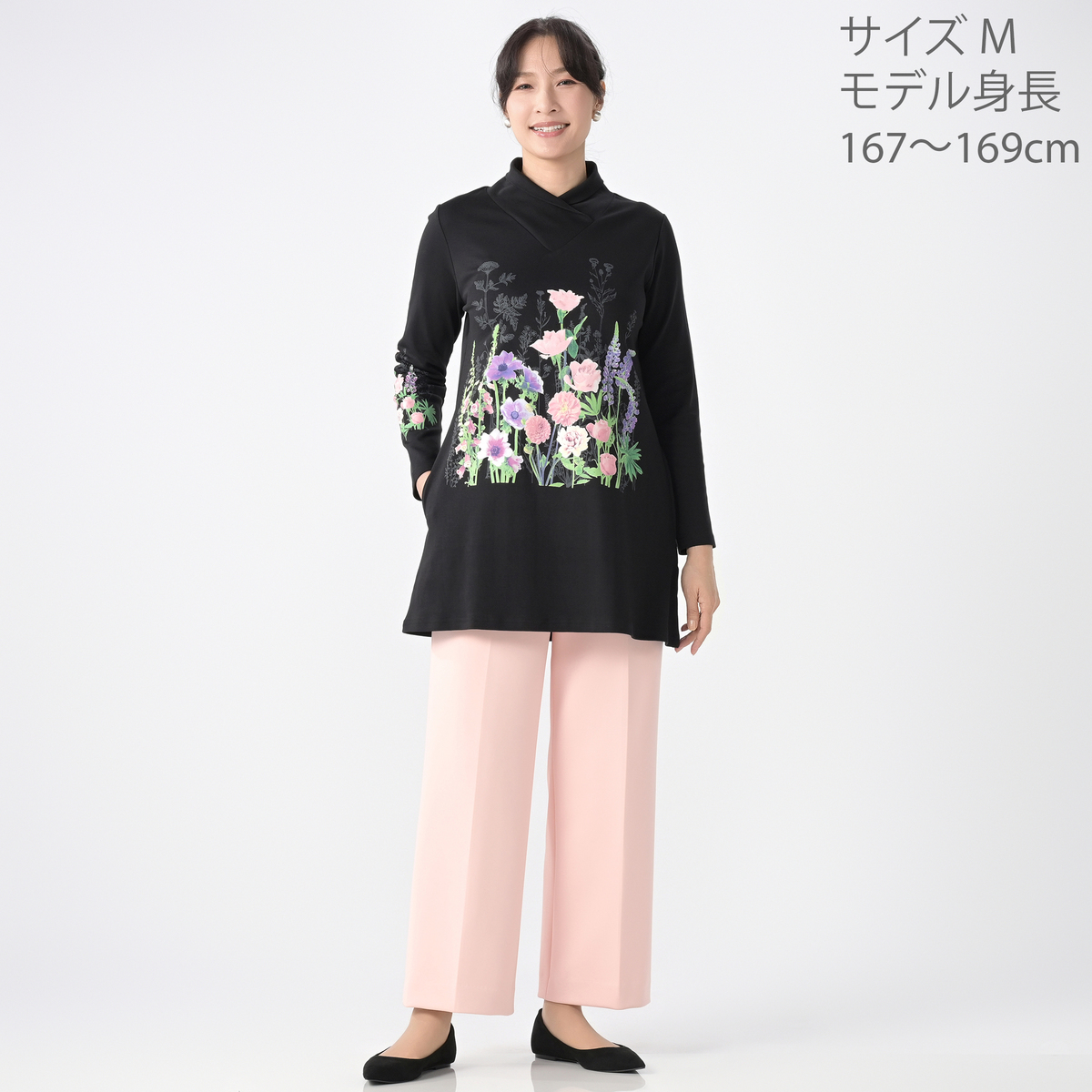生地は綿100%で肌触りが良く、ストレッチ性があります。美しいお花をモチーフにしたデザインで、シルクスクリーンのように一色ずつ丁寧に色を重ね、きれいなグラデーションを映し出しました。洗濯機洗いできるので、お手入れも簡単です