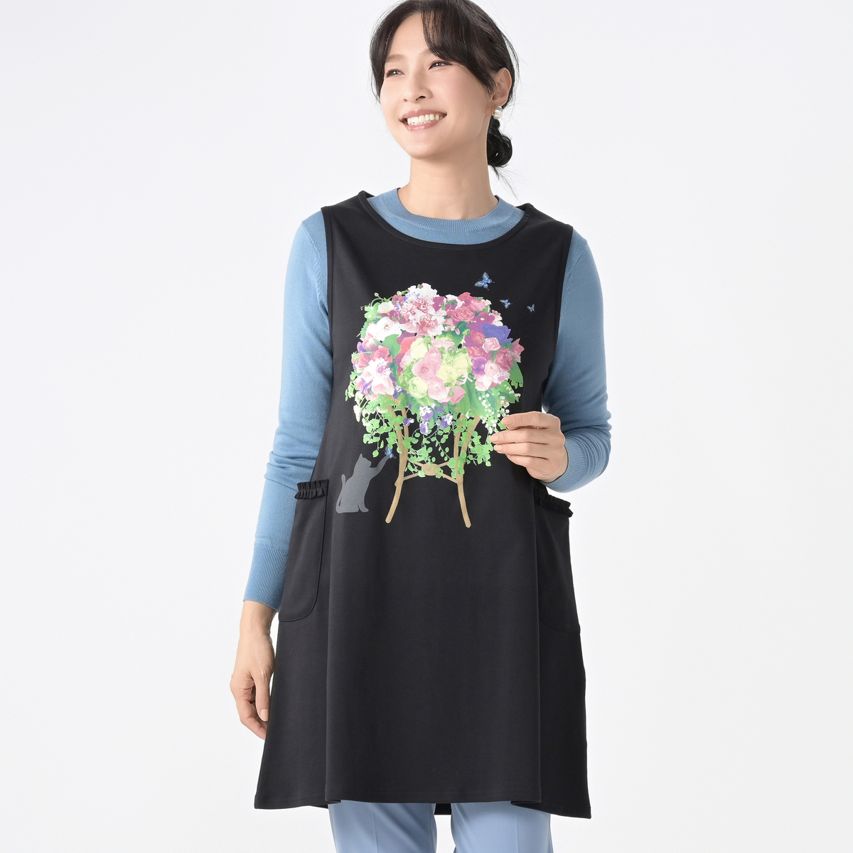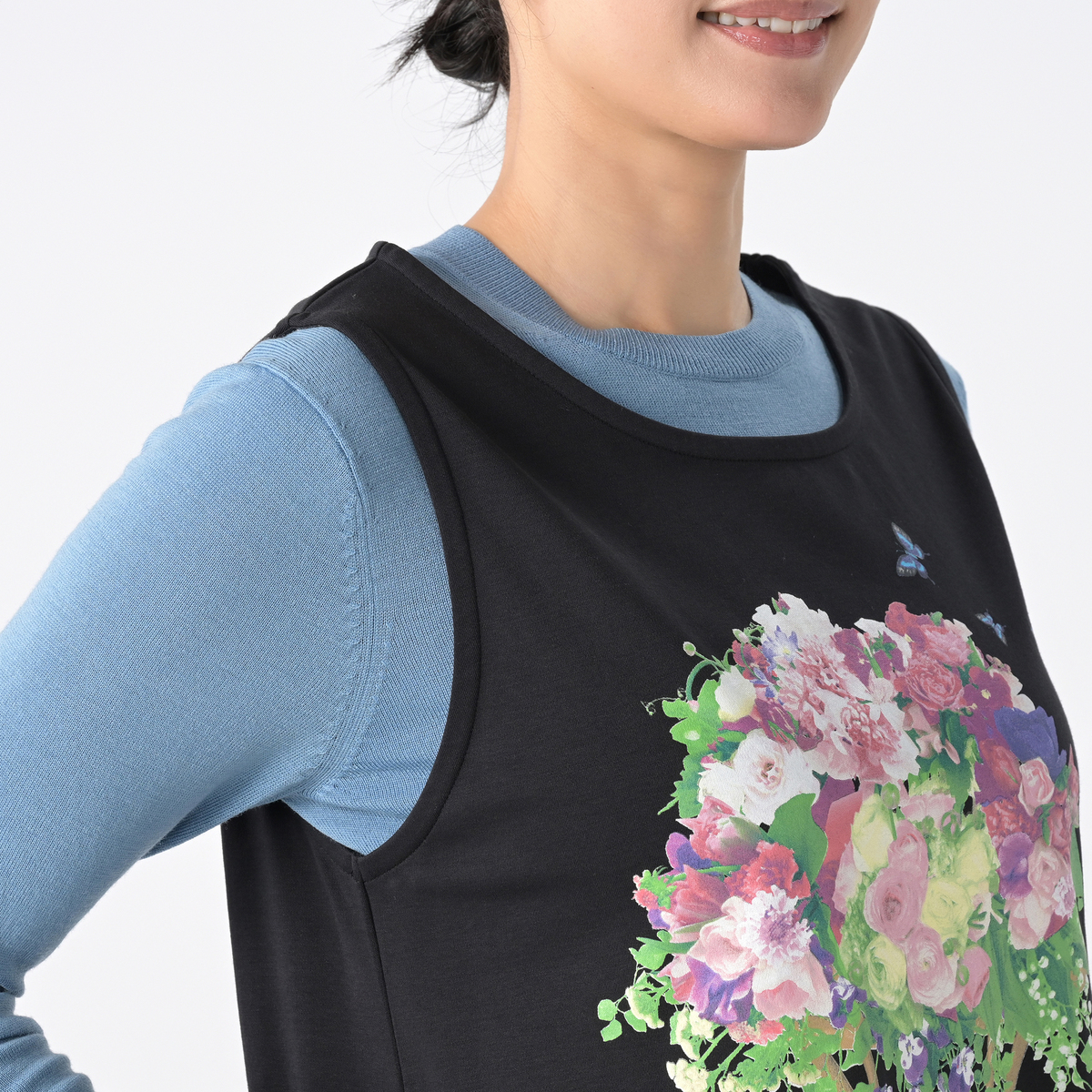 生地は綿100%で肌触りが良く、ストレッチ性があります。美しいお花をモチーフにしたデザインで、シルクスクリーンのように一色ずつ丁寧に色を重ね、きれいなグラデーションを映し出しました。洗濯機洗いできるので、お手入れも簡単です