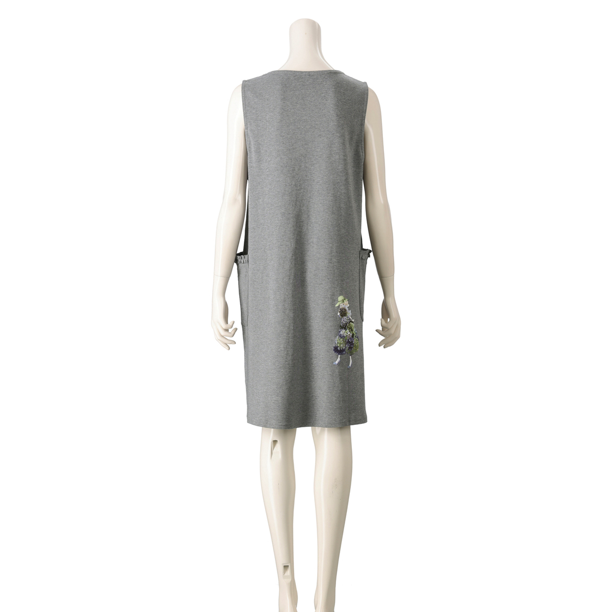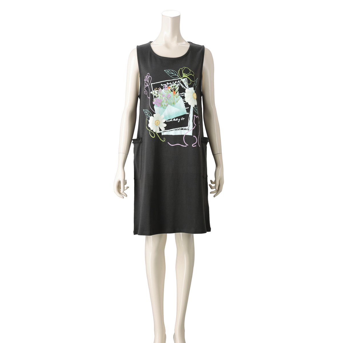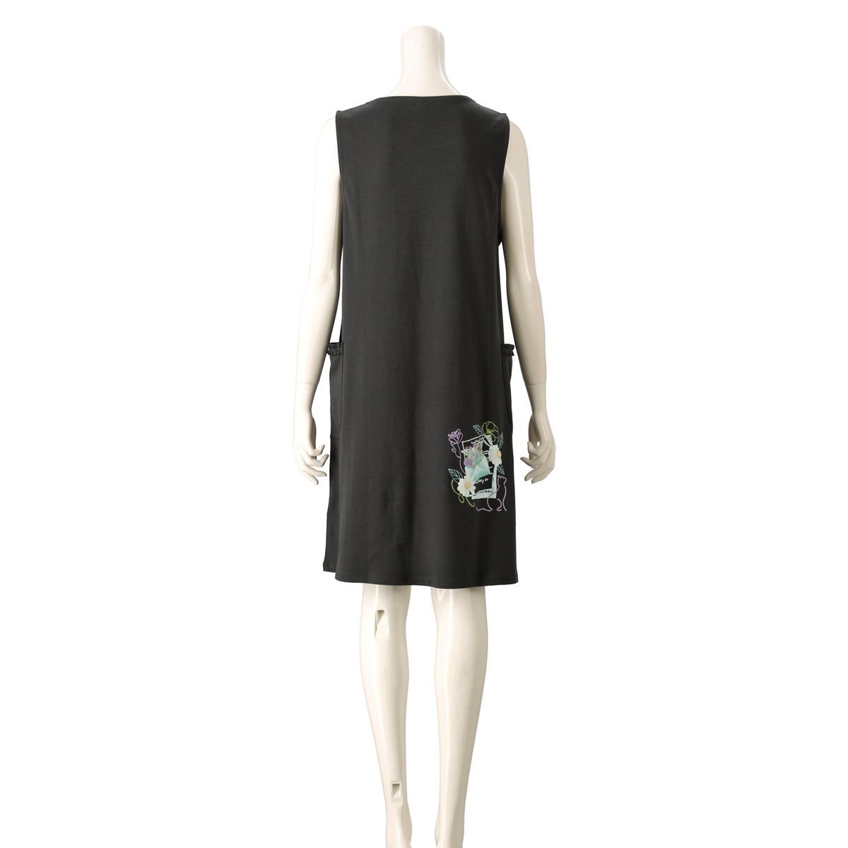 ポケットにフリルをあしらったワンピース。シンプルな丸首と広めのアームホールで、いろいろなインナーに合わせやすいデザインです。生地をたっぷりと使ったワンピース丈で、両脇には便利なポケットが付いています
