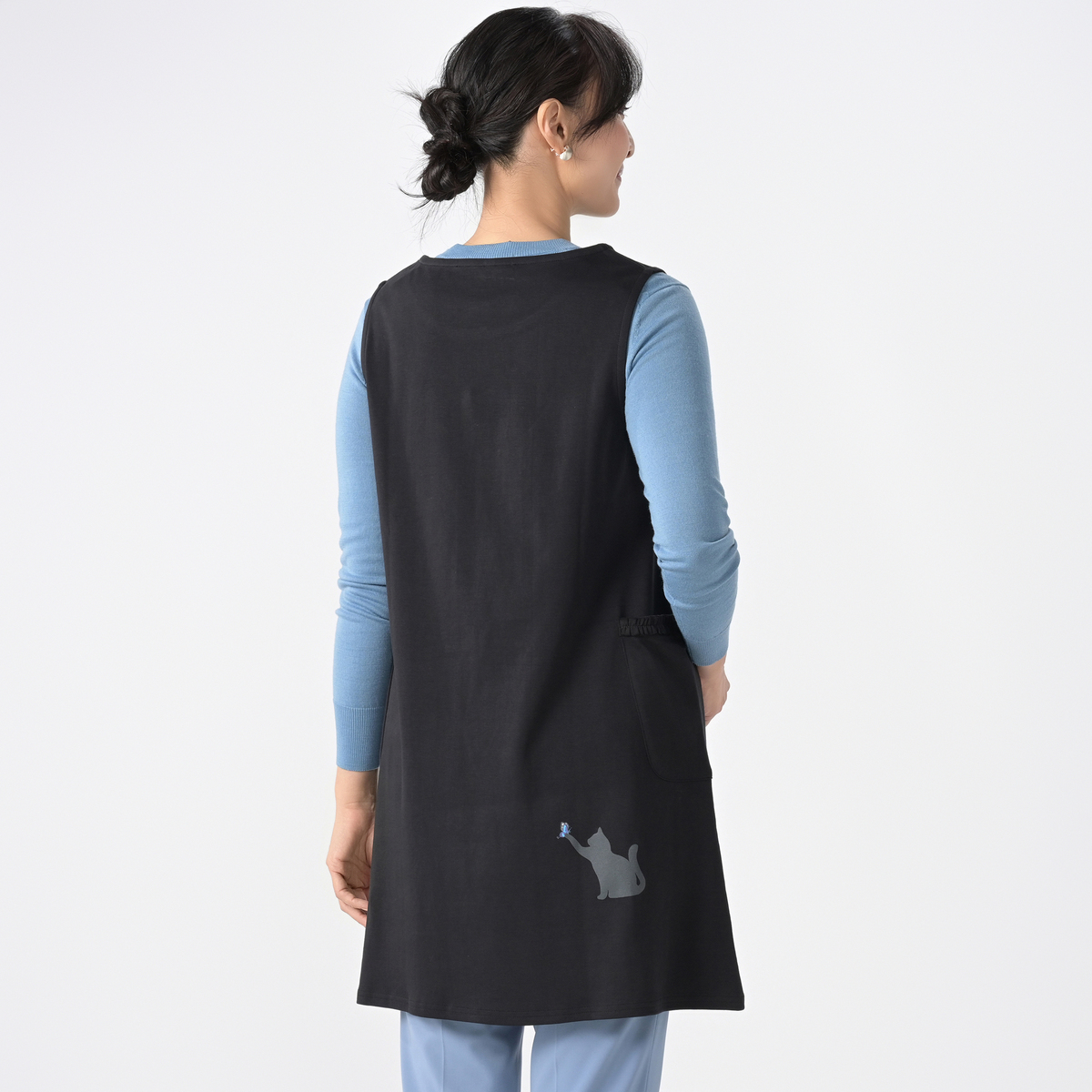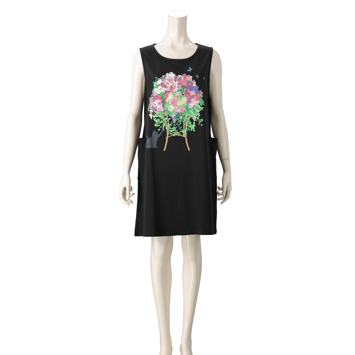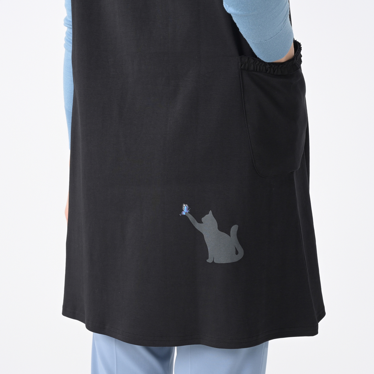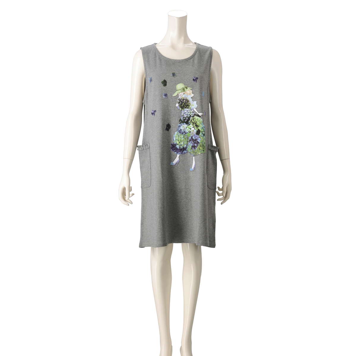 ポケットにフリルをあしらったワンピース。シンプルな丸首と広めのアームホールで、いろいろなインナーに合わせやすいデザインです。生地をたっぷりと使ったワンピース丈で、両脇には便利なポケットが付いています