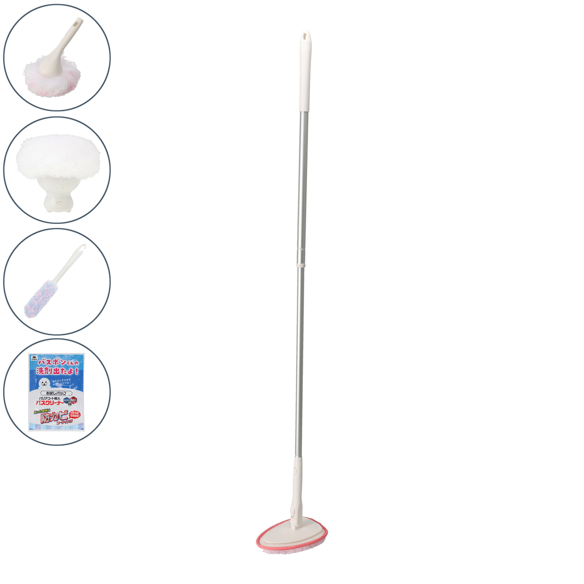 [セット内容] ・伸縮柄 ・バスボン ・床ブラシ ・バスボンの短いおてて ・洗面台ポンポン ・バスクリーナー試供品パック20ml ※プレゼント <バスボン> [サイズ]約幅12×全長25cm [重量]約85g <床ブラシ> [サイズ]約幅13×全長26cm [重量]約123g <伸縮柄> [サイズ(約)] 直径:2.7cm 柄の長さ(伸縮):65〜106cm [重量]約158g <バスボンの短いおてて> [サイズ]約幅4×奥行3×高さ24.5cm(持ち手含む) [重量]約40g <洗面台ポンポン> [サイズ]約8×8×8cm [重量]28g [材質] ポリプロピレン等 [材質詳細] <バスボン> 毛:ポリプロピレン ヘッド:ポリプロピレン <床ブラシ> 毛:ポリプロピレン ヘッド:ポリプロピレン ボタン:ABS ジョイントグリップ:ポリアセタール <伸縮柄> ハンドル:アルミニウム合金 グリップ:ポリプロピレン <バスボンの短いおてて> 柄:ポリプロピレン 針金:ステンレス 毛:ポリプロピレン <洗面台ポンポン> 持ち手:ポリプロピレン 毛:ポリプロピレン(抗菌加工) ■取り扱い説明を充分にご確認の上、ご使用下さい 【中国製(バスボンの短いおてて、洗面台ポンポンは日本製)】 <バスクリーナー試供品パック> [液性]中性 [用途]浴室の浴槽・床・壁・鏡・カラン・洗面器・イスなどの洗浄、除菌、ウイルス除去、防汚、抗菌、防カビ ※白木など水がしみこむ材質や、大理石には使用しない 【日本製】 [注意事項] ※廃棄する場合は専門業者、公的機関にご相談下さい ※用途以外には使用しないで下さい <バスボン> ※カビ除去剤や漂白剤との併用、また高温(60℃以上)での使用はしないで下さい。製品が劣化するおそれがあります ・適しているもの:ポリ(FRP)、ステンレス、ホーロー、人工大理石、タイル、木製 ・適さないもの:モルタル、コンクリート <床ブラシ> ※カビ除去剤や漂白剤との併用、また高温(60℃以上)での使用はしないで下さい。製品が劣化するおそれがあります ※水切りするとき、本体を強く振るとブラシが外れることがありますので注意して下さい ※グリップの角度調節やロック機能を使用する際は、ブラシで手などを傷つけないようご注意下さい ※グリップやヘッド部分が強く浴槽などに当たると傷がつくおそれがありますのでご注意下さい ※シリコンコーキング部分は強くこすると剥がれるおそれがあります。なでるように洗って下さい ※床面の表面が痛んで内部まで浸透しているカビや汚れは落とせません ・適しているもの:ポリ(FRP)、人工大理石、タイル、木製 ・適さないもの:モルタル、コンクリート <伸縮柄> ※伸縮部分はきちんとロックされている状態でご使用下さい。ゆるんでいるとハンドルが縮んで転倒することがあります ※清掃ヘッドと確実にジョイントされていることを確認してご使用下さい <バスボンの短いおてて> ※清掃用のブラシです ※ブラシ部に砂や硬いゴミが付着したまま使用しないで下さい。傷つける恐れがあります ※カビ除去剤や漂白剤との併用、また高温(60℃以上)での使用はしないで下さい ※強くこすると清掃面に傷が付く恐れがありますのでご注意下さい ※柄やブラシに無理な力をかけないで下さい。変形、破損の原因になります ※ご使用中に、ブラシのはねかえりで水しぶきが顔や服にかかったり、目に入る恐れがありますのでご注意下さい ※火のそばなど高温になる場所に置かないで下さい。火傷、火災の原因になります ※ブラシの毛がへたり、針金が露出した場合は、直ちに使用を中止して新しいものと取り替えて下さい <洗面台ポンポン> ※洗面台の清掃用ブラシです ※硬いゴミや砂などが付着したまま使用しないで下さい ※プラスチックなど特にキズつきやすいものや光沢のある素材にはあらかじめ目立たないところで確認してから使用して下さい ※シリコーンコーキング部分は強くこするとはがれるおそれがあります。なでるように洗浄して下さい ※カビ除去剤や漂白剤との併用、また高温(60℃以上)での使用はしないで下さい。製品が劣化するおそれがあります ※毛は無理に引っ張ると抜けることがありますので、ご注意下さい ※火のそばなど高温になる場所には置かないで下さい。火傷や火災の原因になるおそれがあります ※直射日光が当たる場所に保管しないで下さい。劣化や変色のおそれがあります ※逆さに立てて置くと、持ち手の底から水が抜けるため周囲が濡れやすいです。洗面台内など水が抜けても問題のない場所で保管して下さい [成分] バスクリーナーお試しパック: ・界面活性剤(2.5% アルキルグルコシド) ・泡調整剤(ブチルジグリコール) ・金属封鎖剤 ・除菌剤 ・粘度調整剤 ・安定化剤 ・PH調整剤
