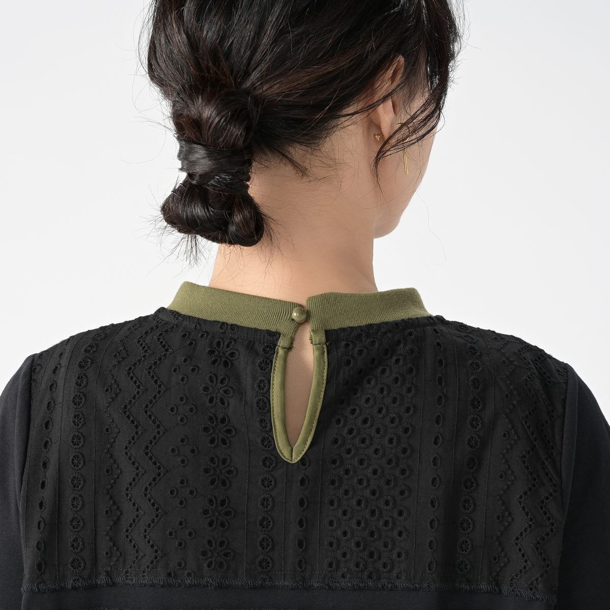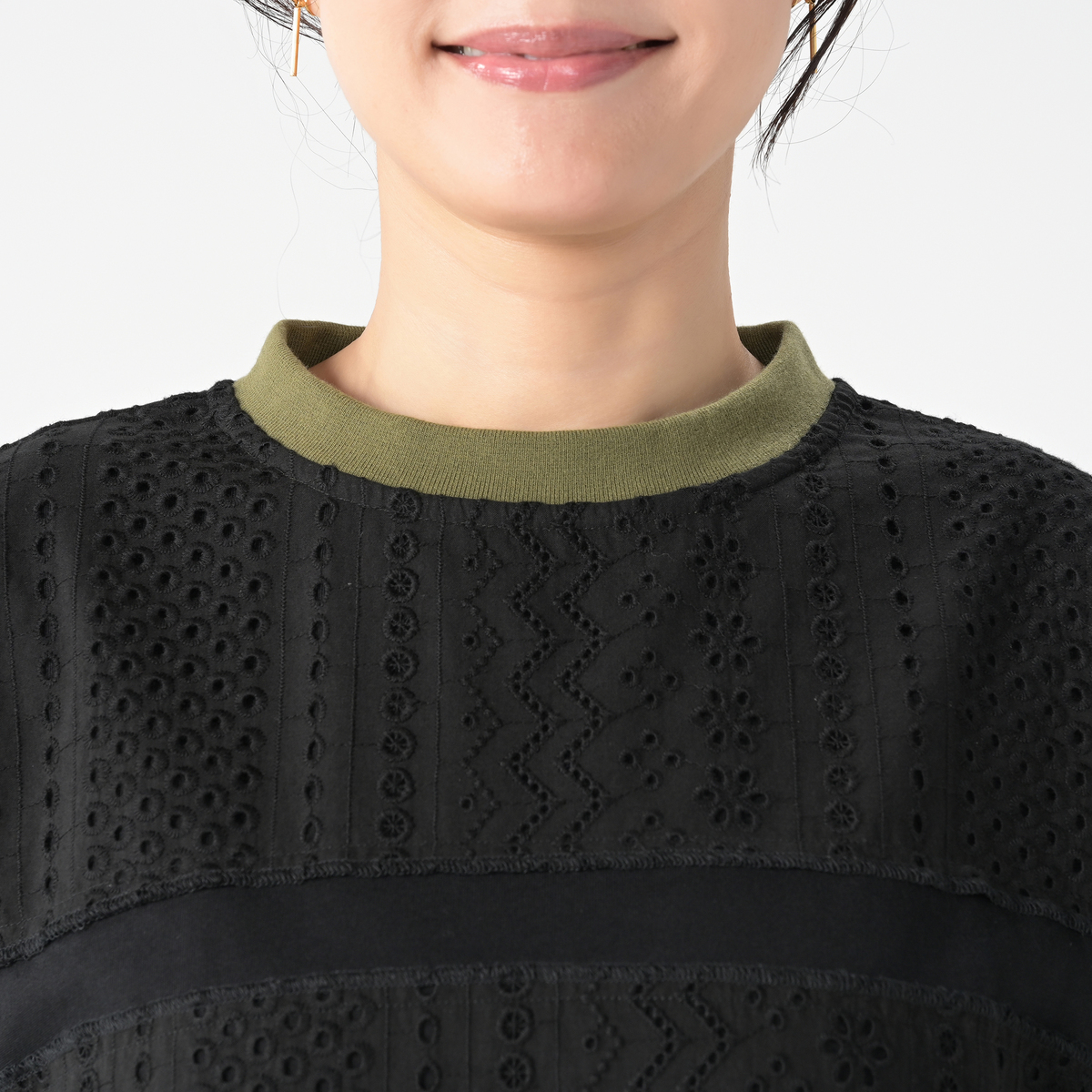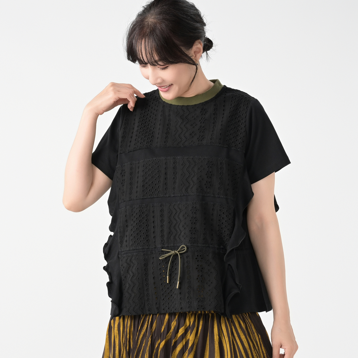 本体には綿100%のカットソー素材を使用。程良い肉感のカットソー素材で透け感も感じにくく、レースも綿100%のレースで、エレガントな大人カジュアルに仕上げました