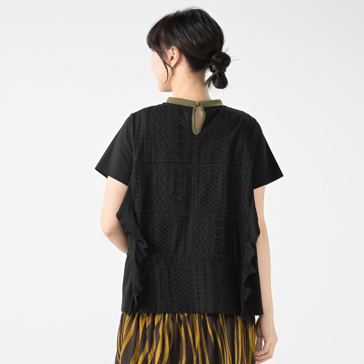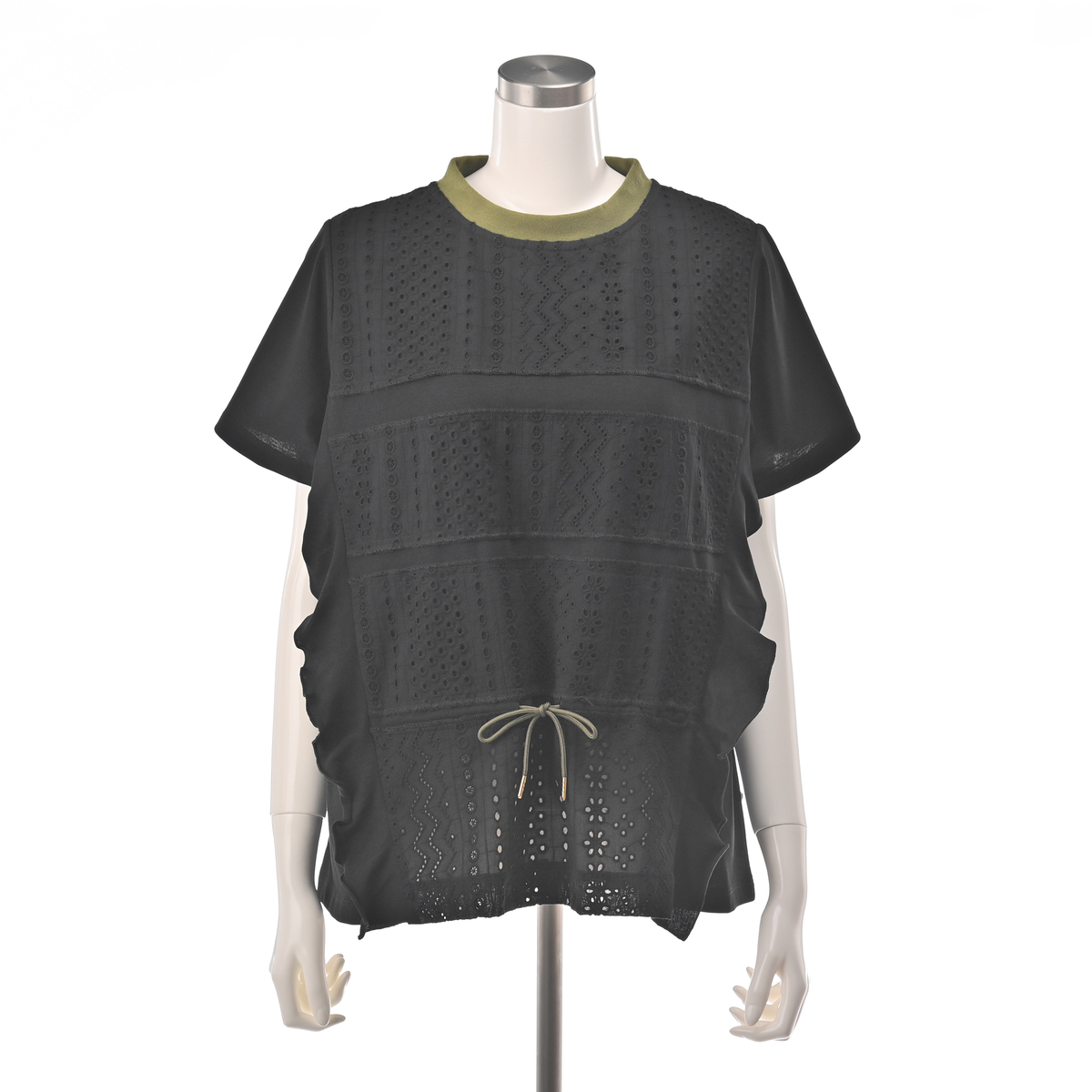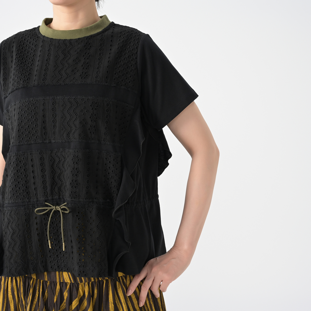 Tシャツの上にレースを重ねたプルオーバー。身頃の切り替え部分にカットソーをふらして重ねることで動きを出し、身頃にスピンドルを入れることでシルエットアレンジも楽しめるデザインです