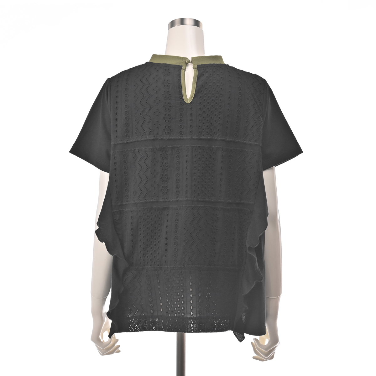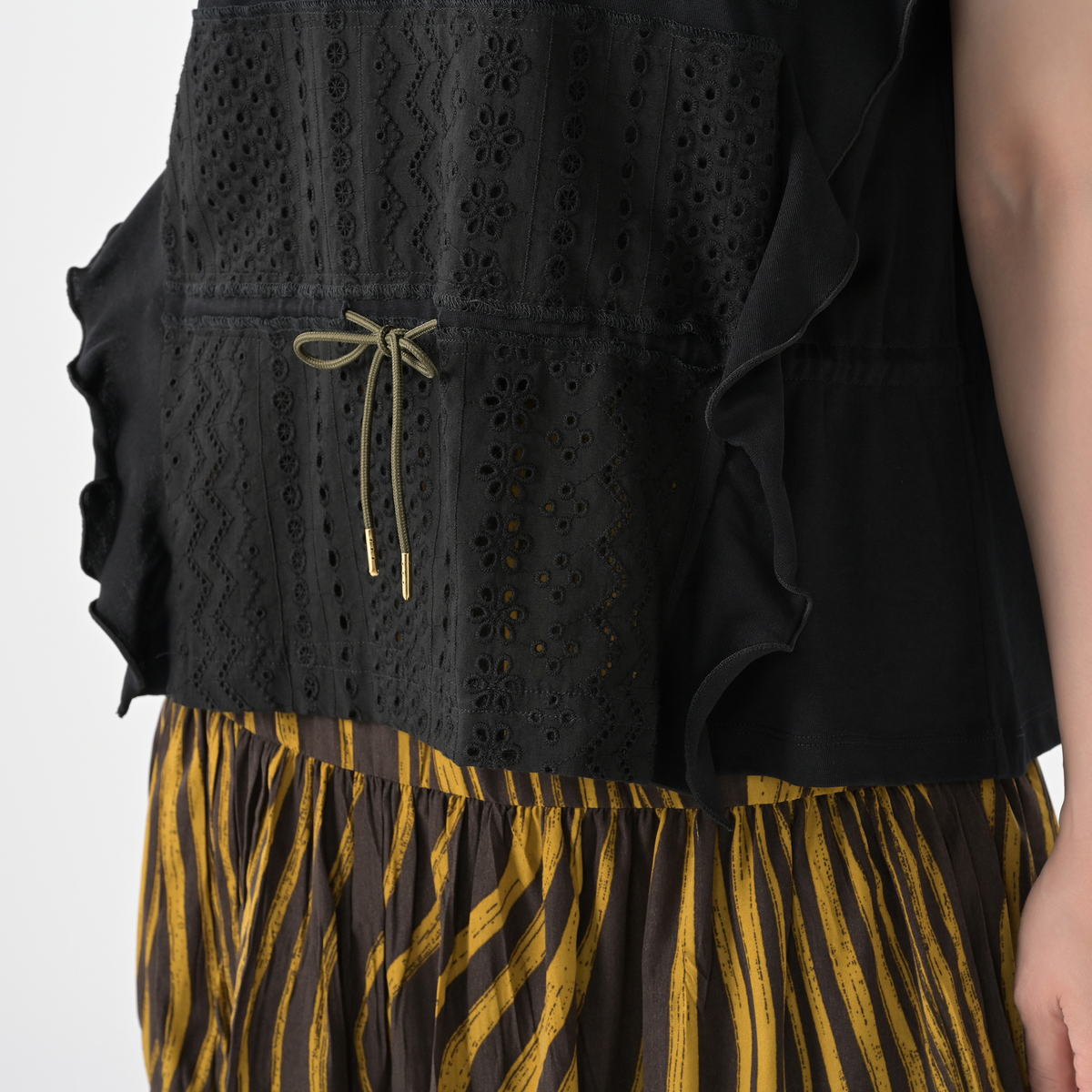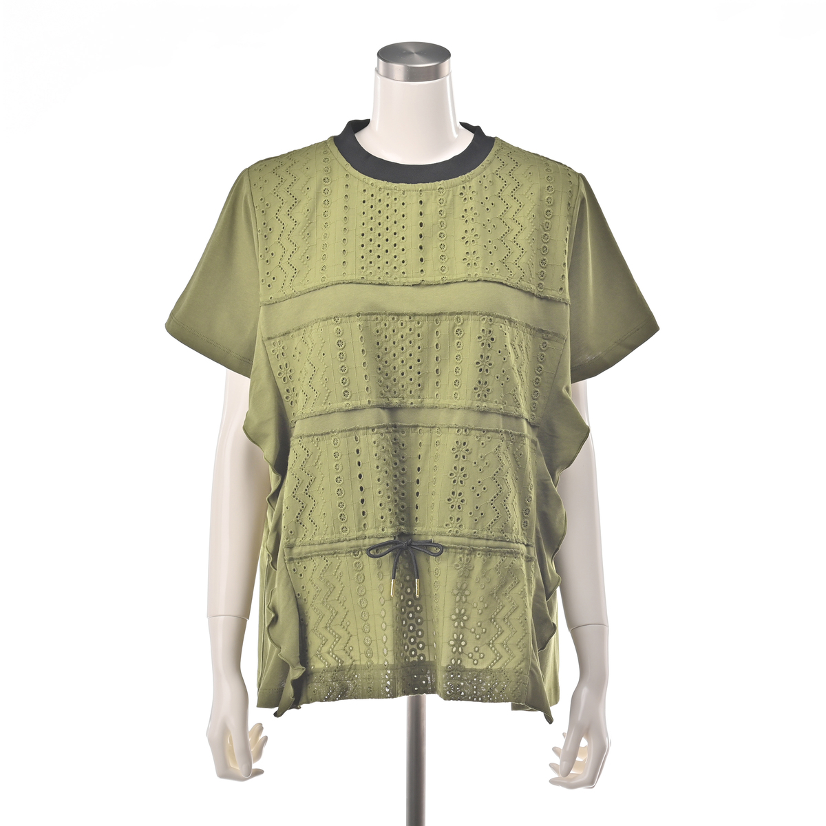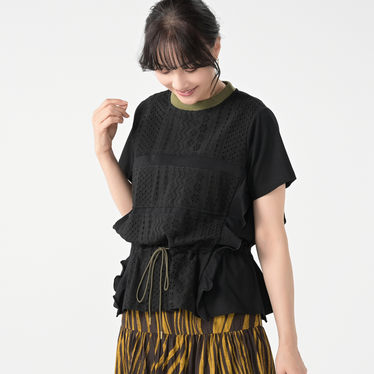 Tシャツの上にレースを重ねたプルオーバー。身頃の切り替え部分にカットソーをふらして重ねることで動きを出し、身頃にスピンドルを入れることでシルエットアレンジも楽しめるデザインです