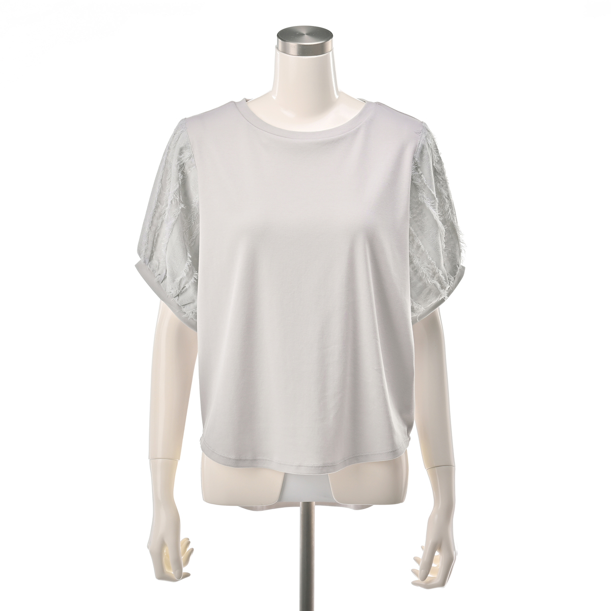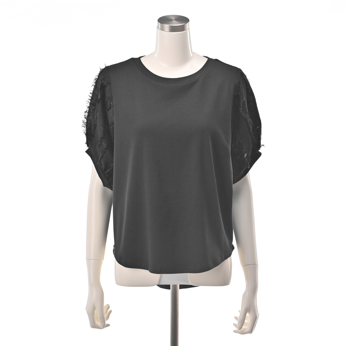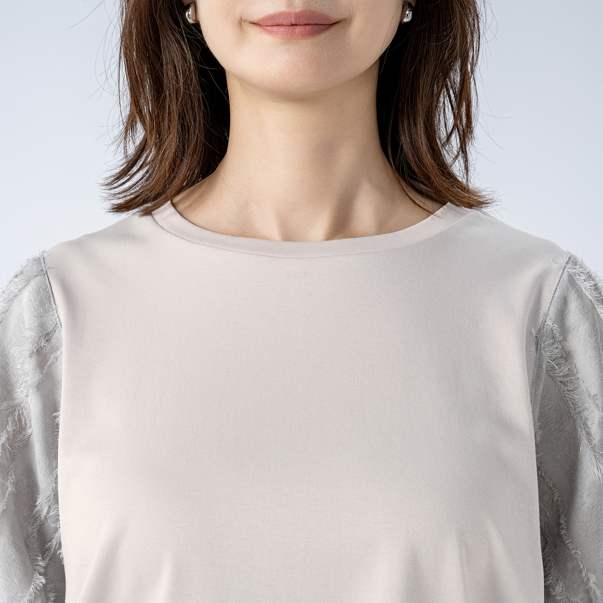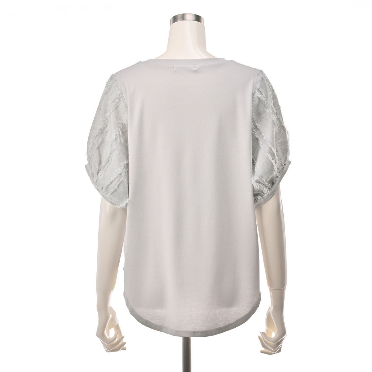 本体は綿100%のカットソー素材で、程良い肉感のスムース素材を使用しています。袖の別布はポリエステル100%のカットジャガード素材で、薄手でシアー感のある雰囲気です