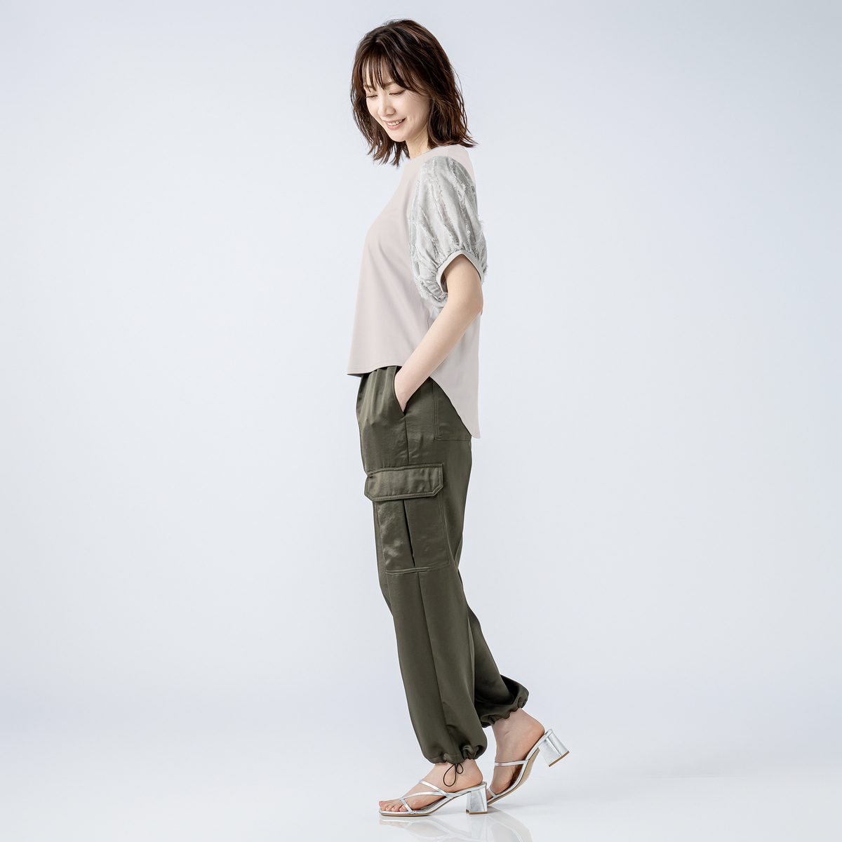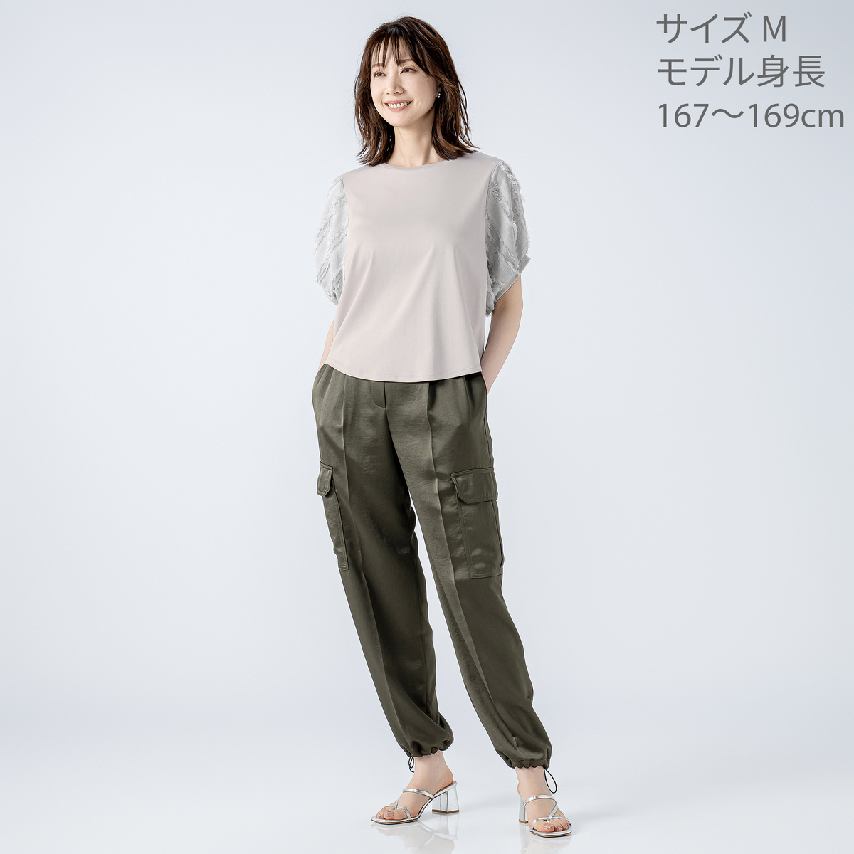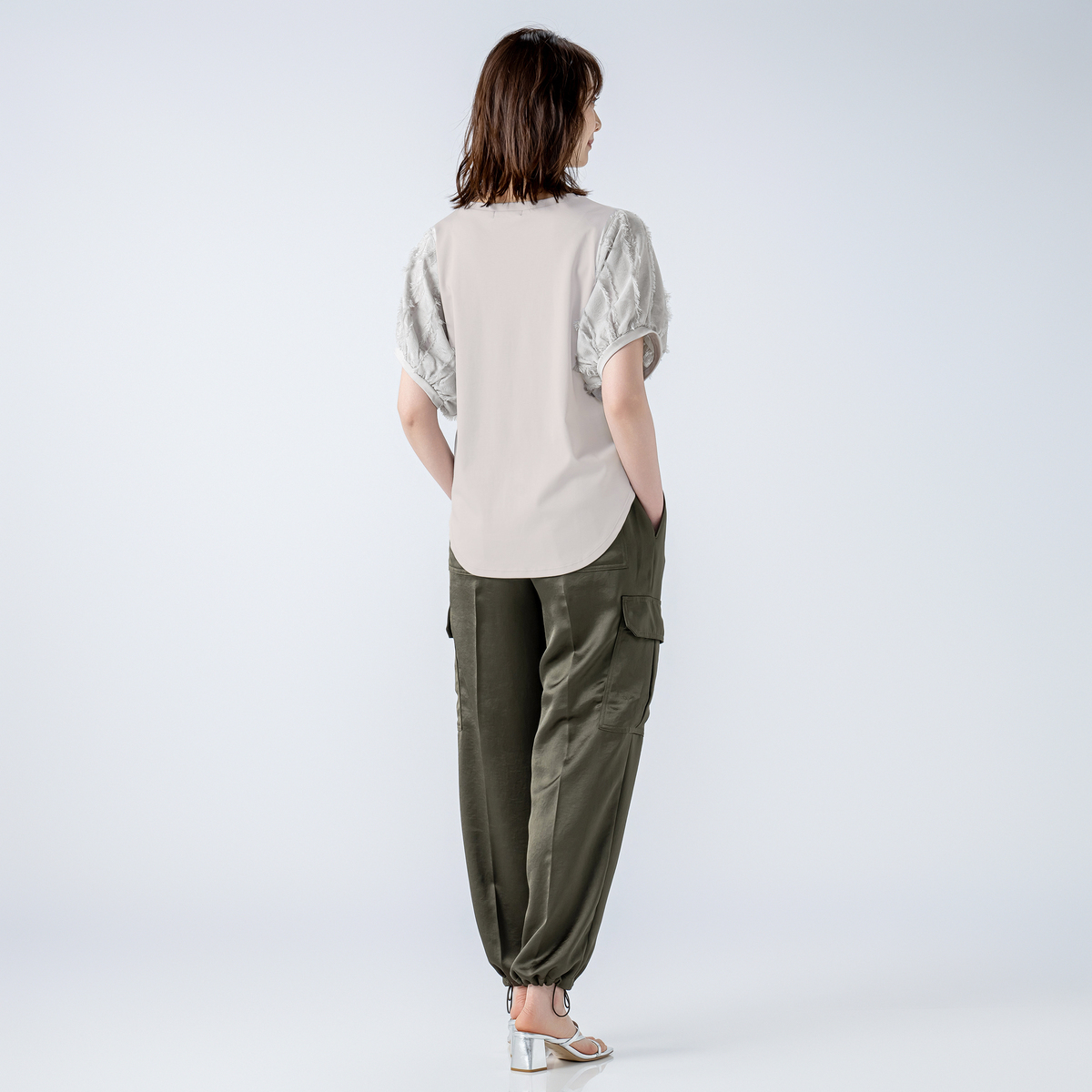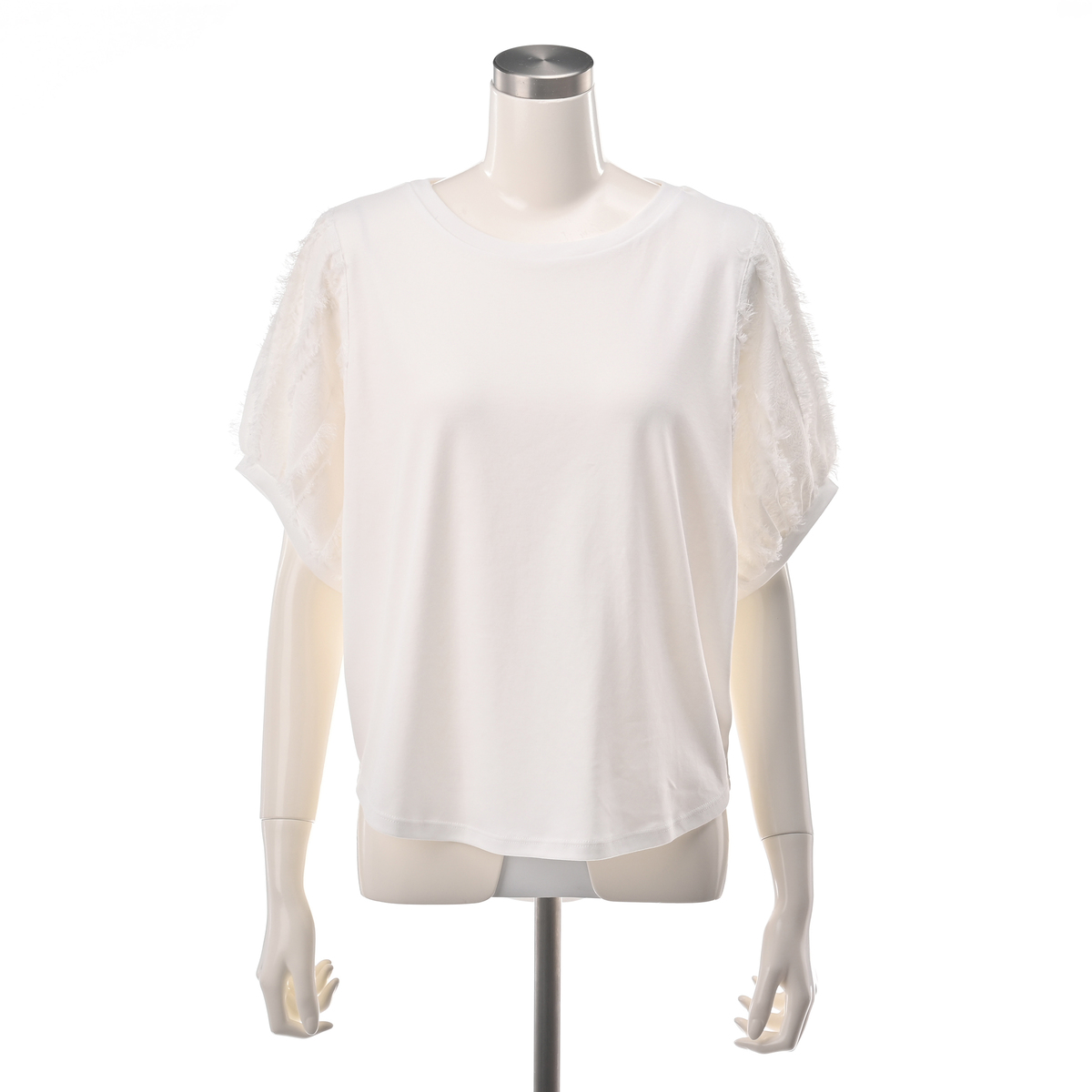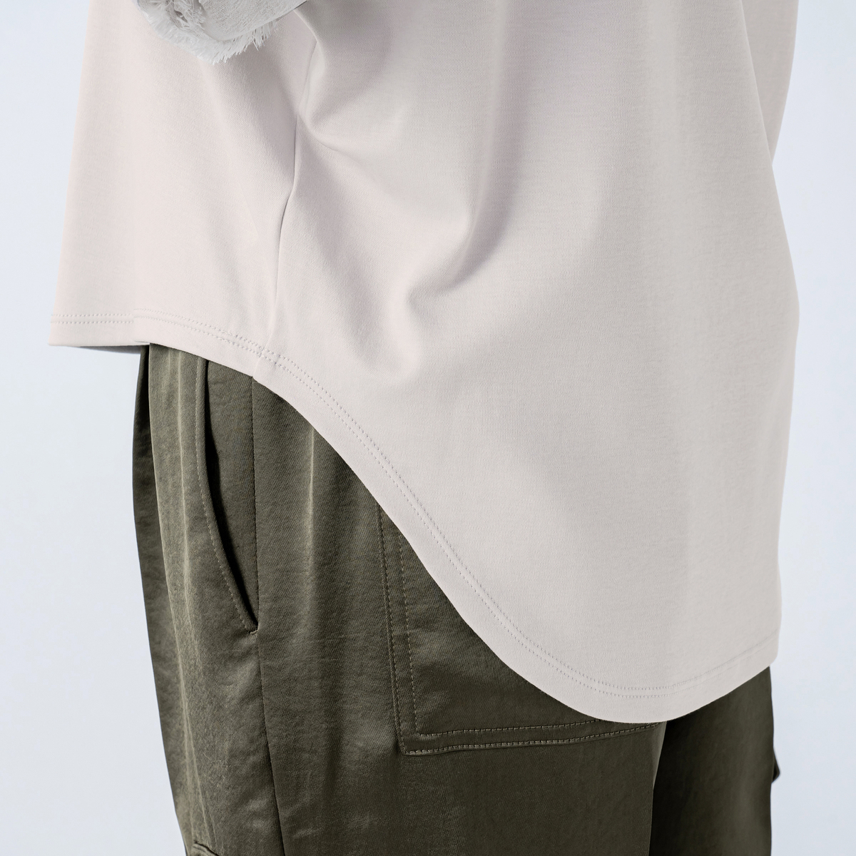 本体は綿100%のカットソー素材で、程良い肉感のスムース素材を使用しています。袖の別布はポリエステル100%のカットジャガード素材で、薄手でシアー感のある雰囲気です