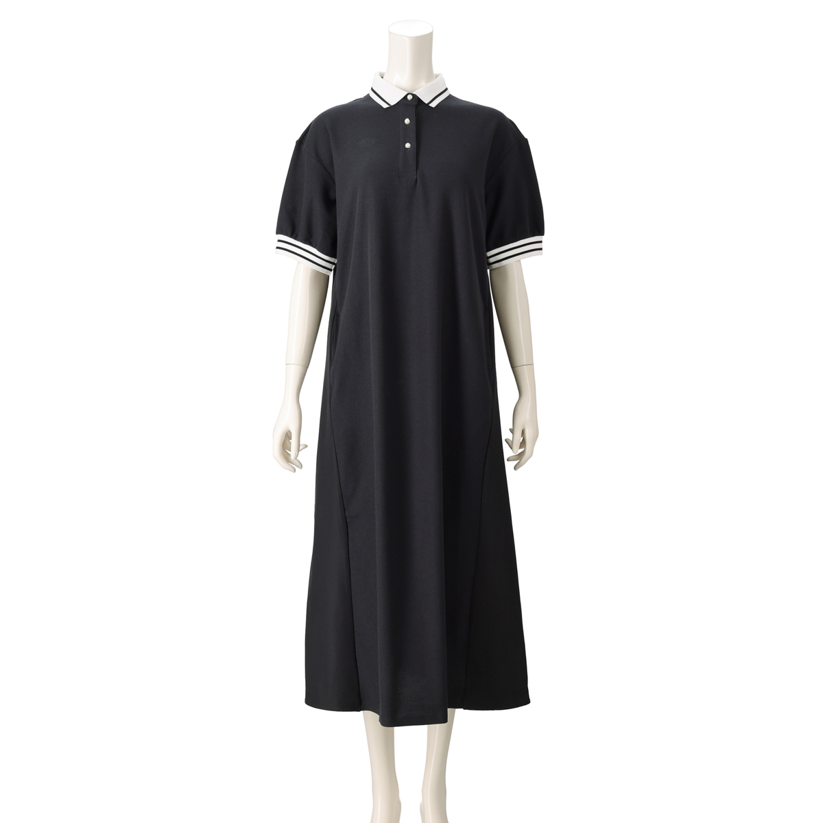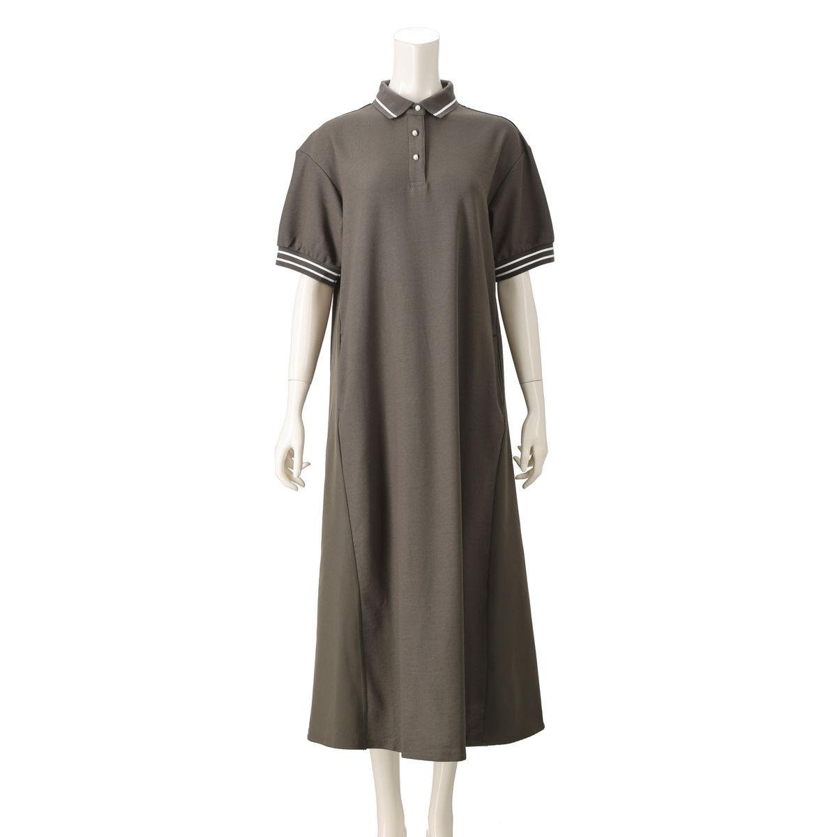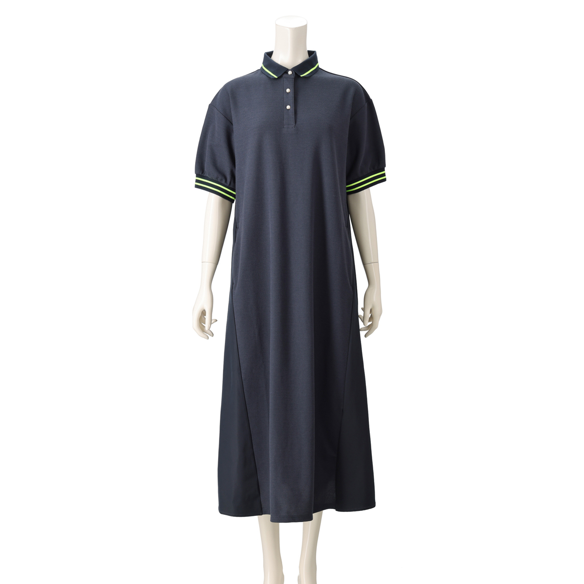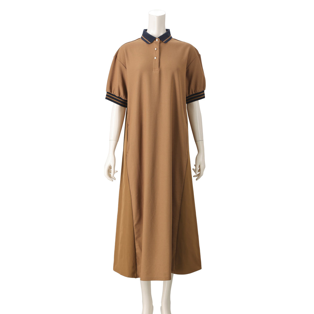 カットソーのカノコ編みをメインに、後ろ身頃には布帛素材を組合せたポロワンピース。カノコ編みは綿とポリエステルを交編させ、布帛素材には程よいハリ感があります