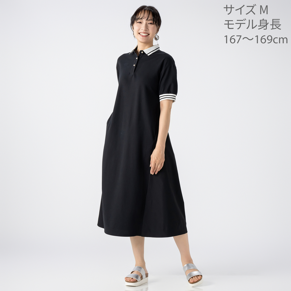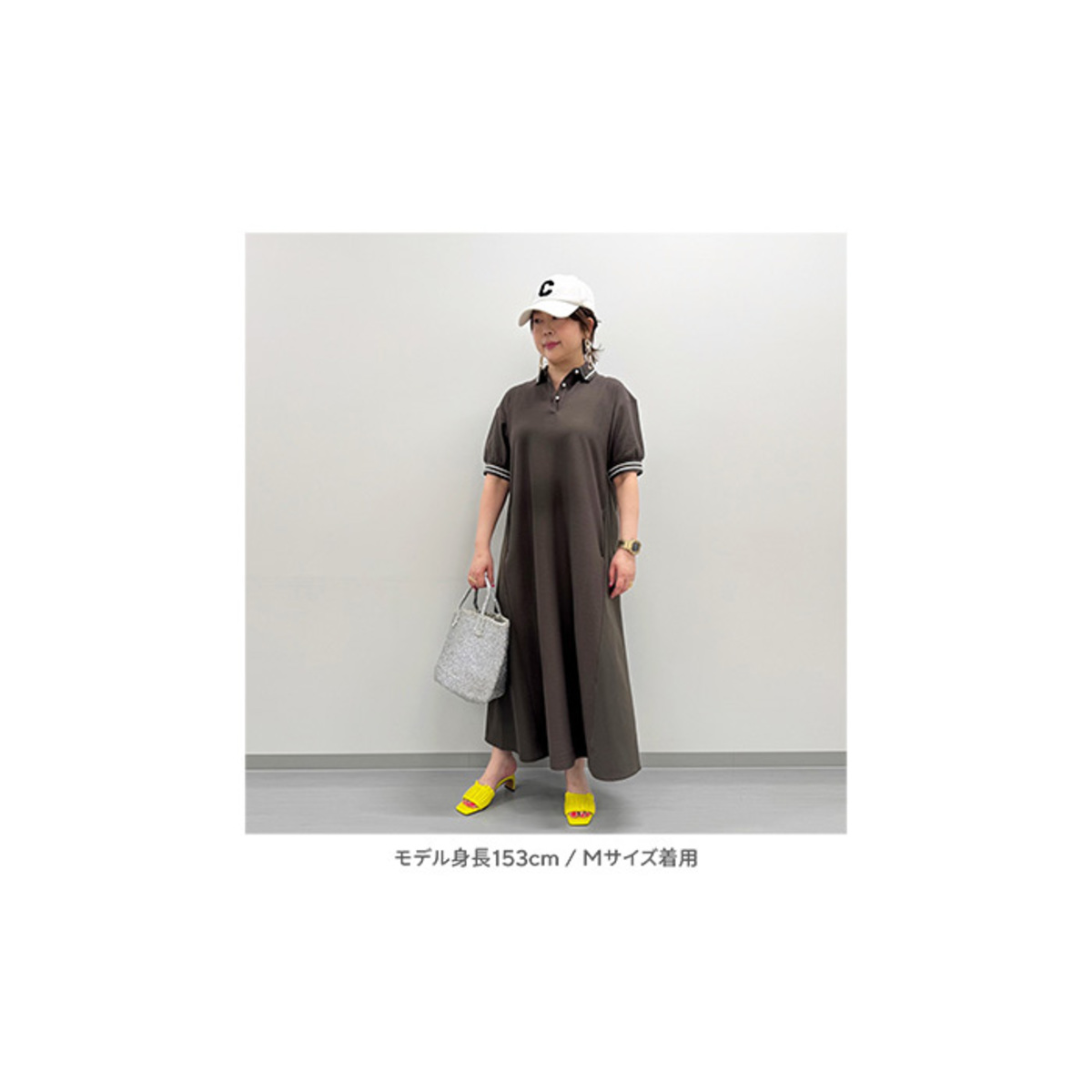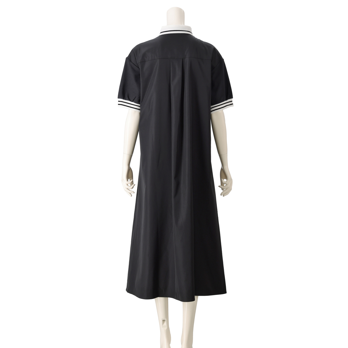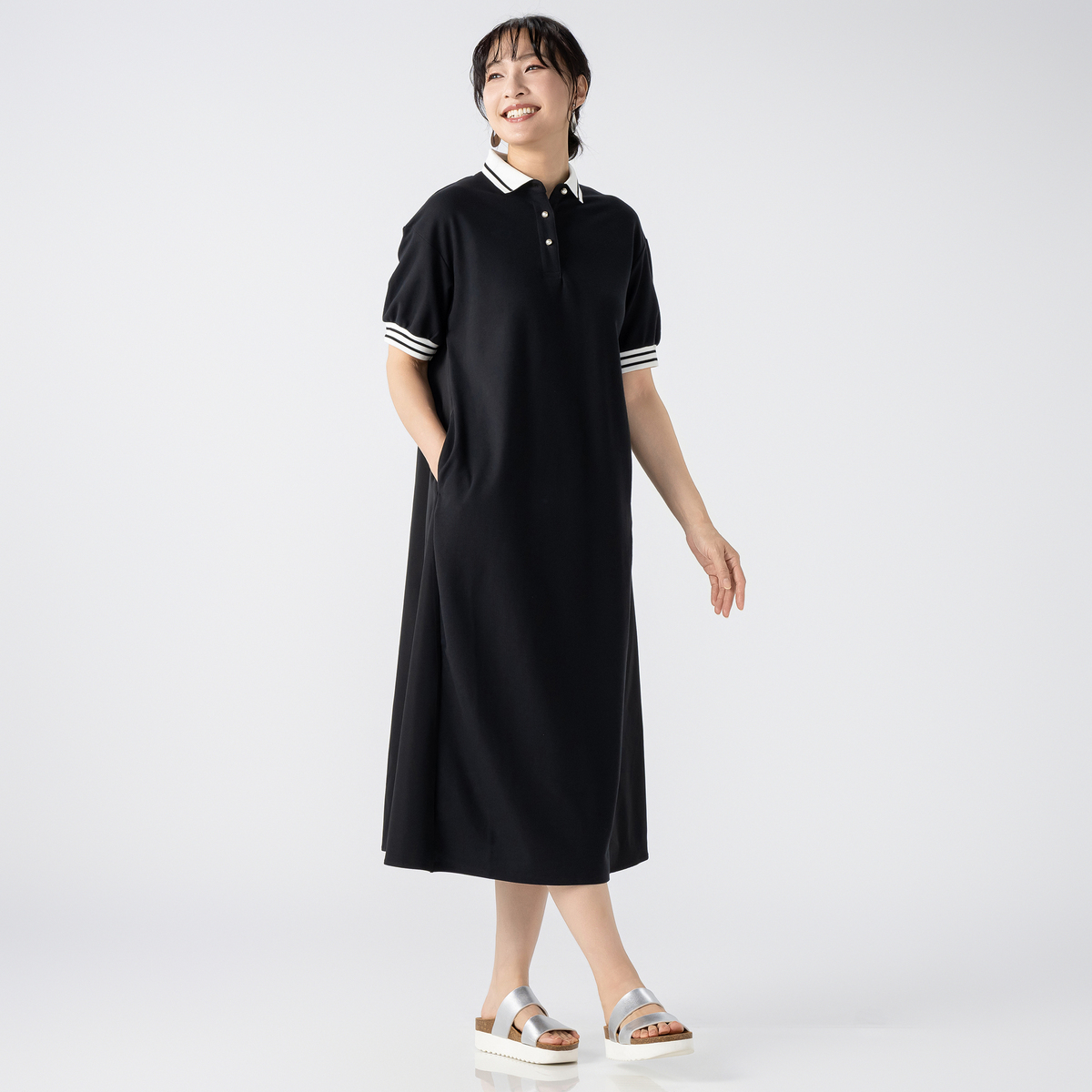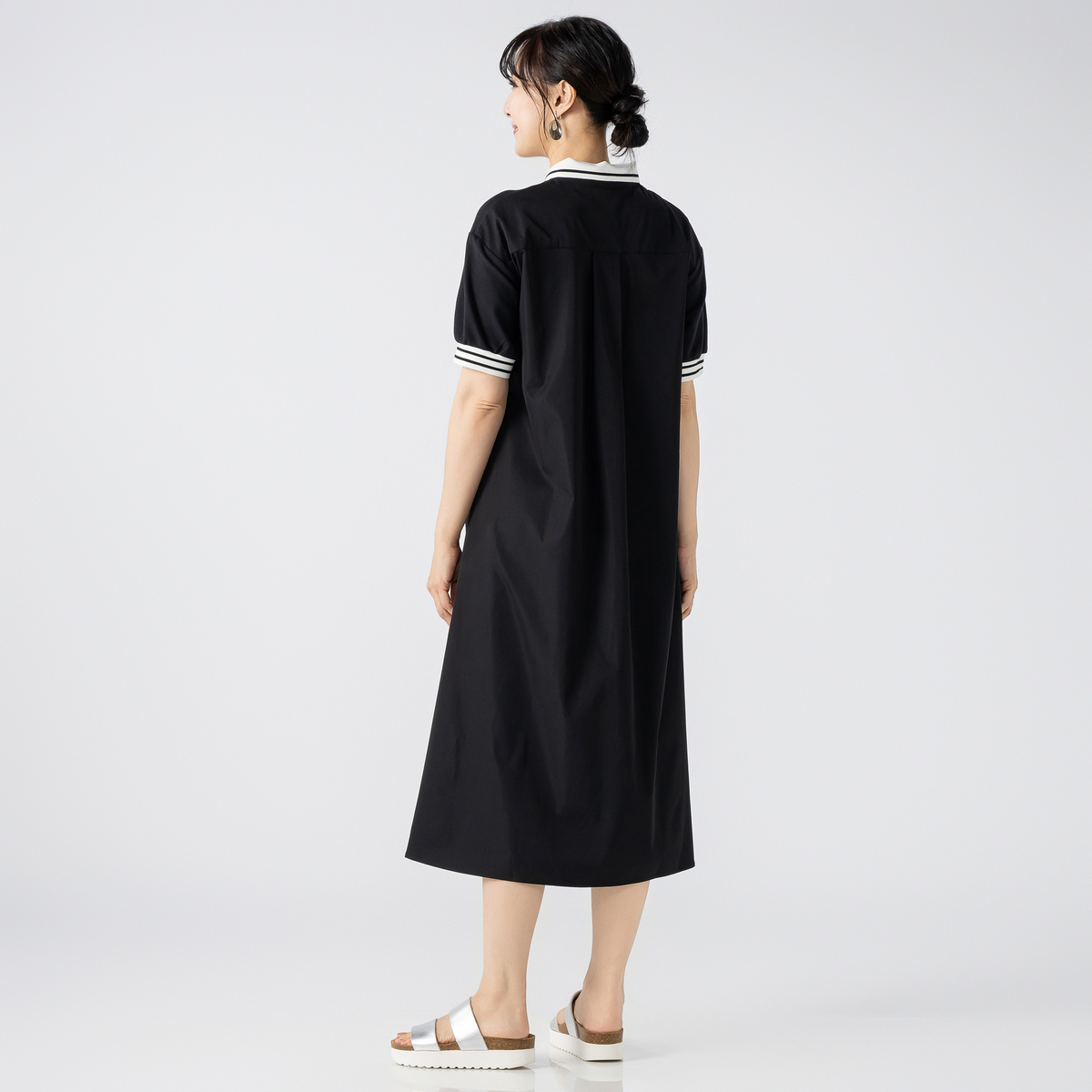 カットソーのカノコ編みをメインに、後ろ身頃には布帛素材を組合せたポロワンピース。カノコ編みは綿とポリエステルを交編させ、布帛素材には程よいハリ感があります