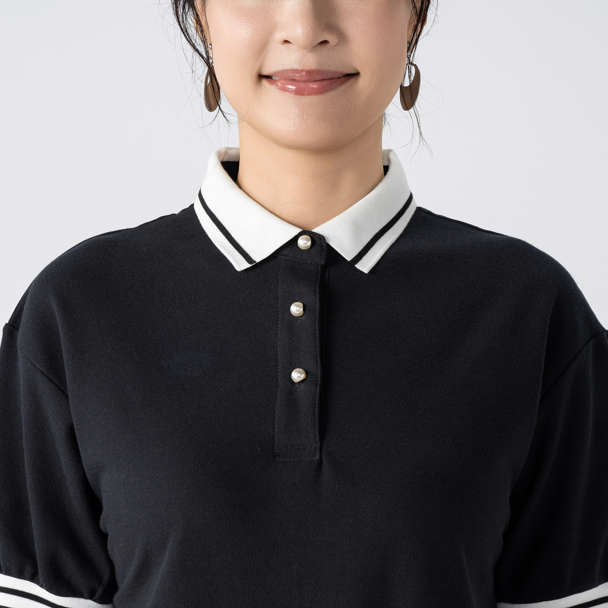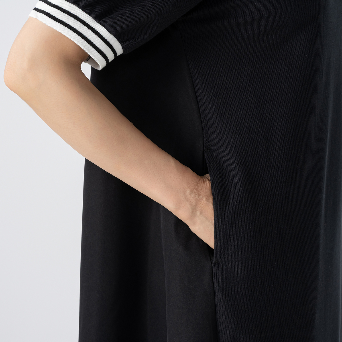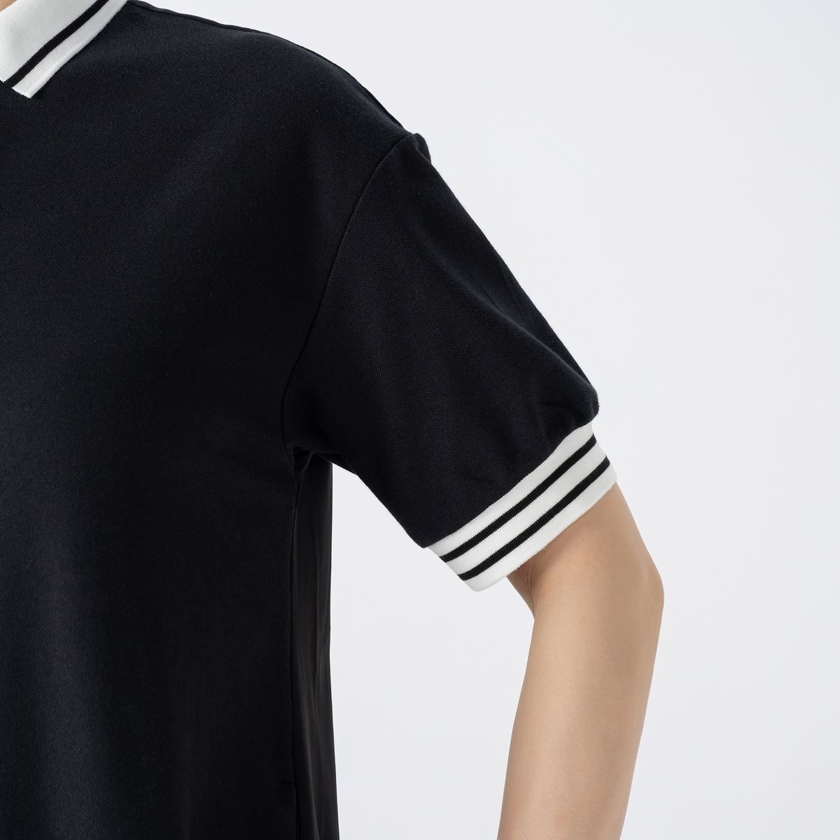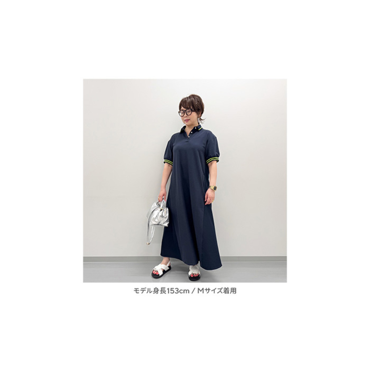 カットソーのカノコ編みをメインに、後ろ身頃には布帛素材を組合せたポロワンピース。カノコ編みは綿とポリエステルを交編させ、布帛素材には程よいハリ感があります