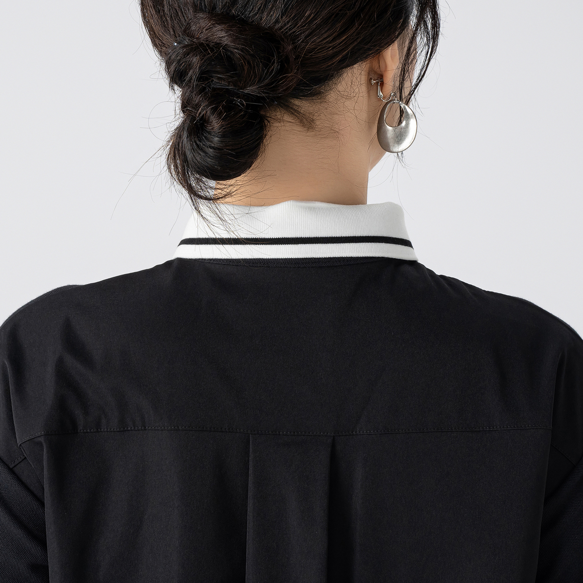 衿と袖口のボーダーリブが、着こなしに遊び心をプラス。後ろ身頃の布帛素材が、すっきりとした印象をもたらします