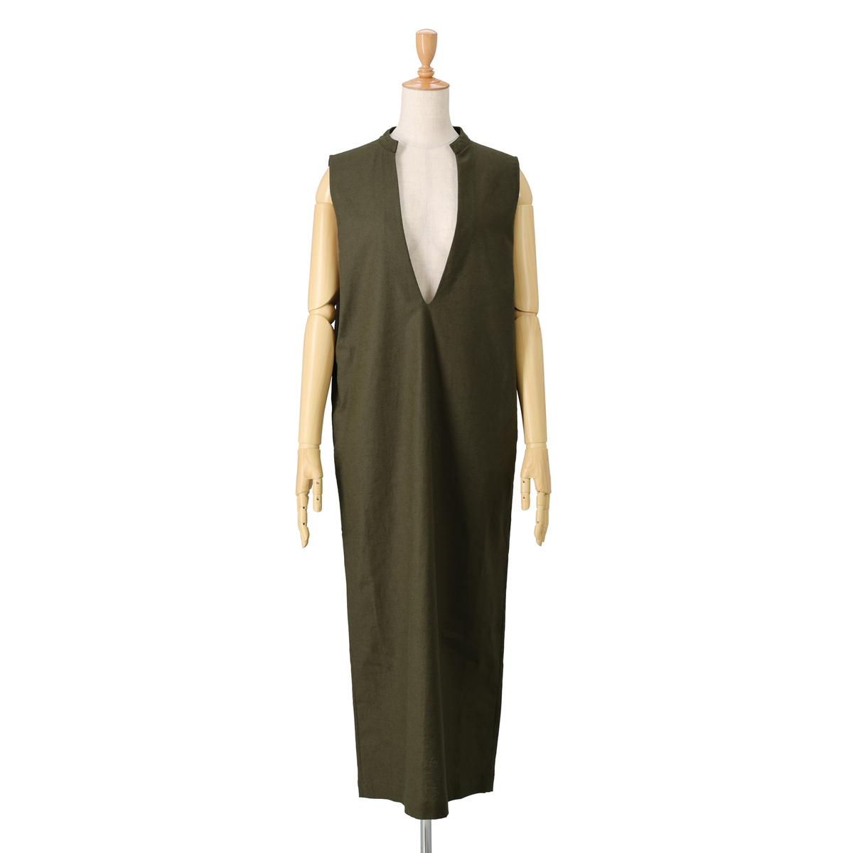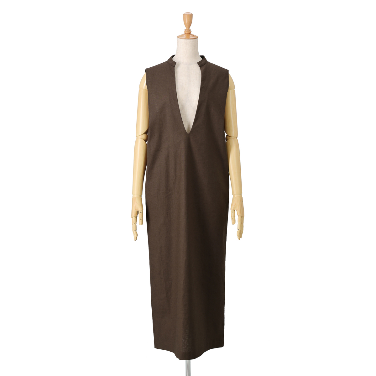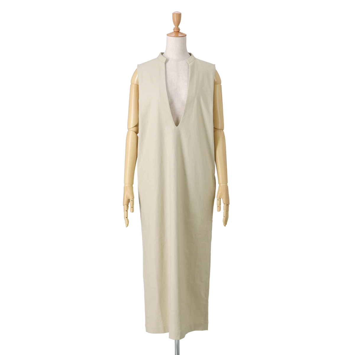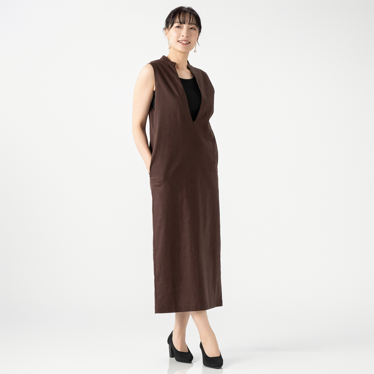 上質なストレッチフレンチリネンのジャンパースカート。大きくVネックラインを入れたフロントデザインで、バンドカラーで旬な表情をプラス。チューブトップやキャミソール、タンクトップをインナーに合わせたコーディートがオススメです