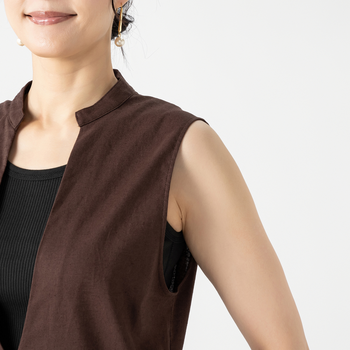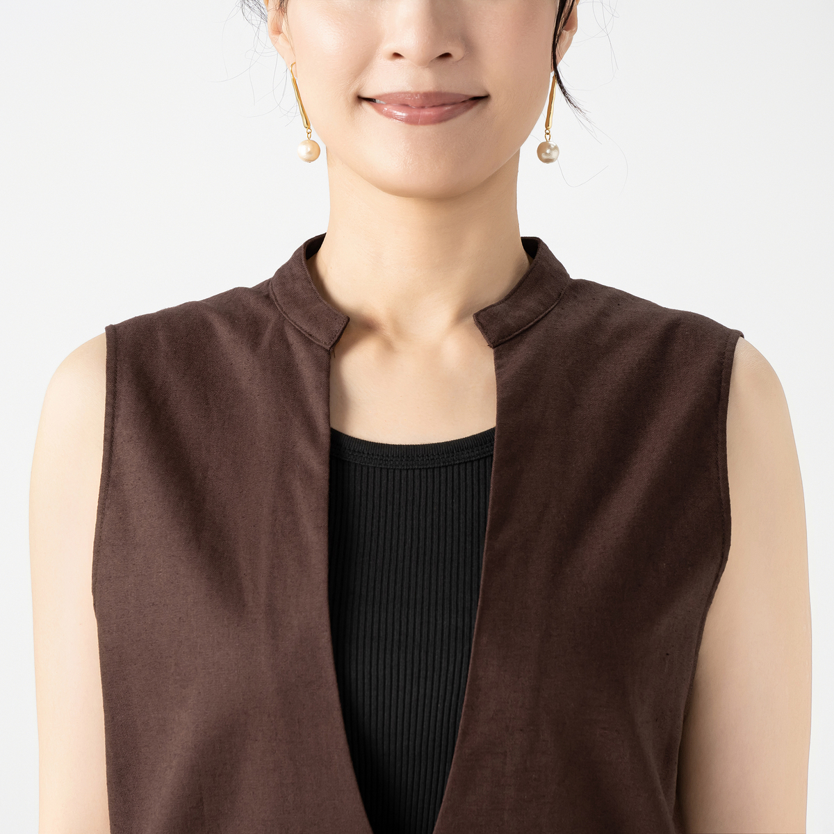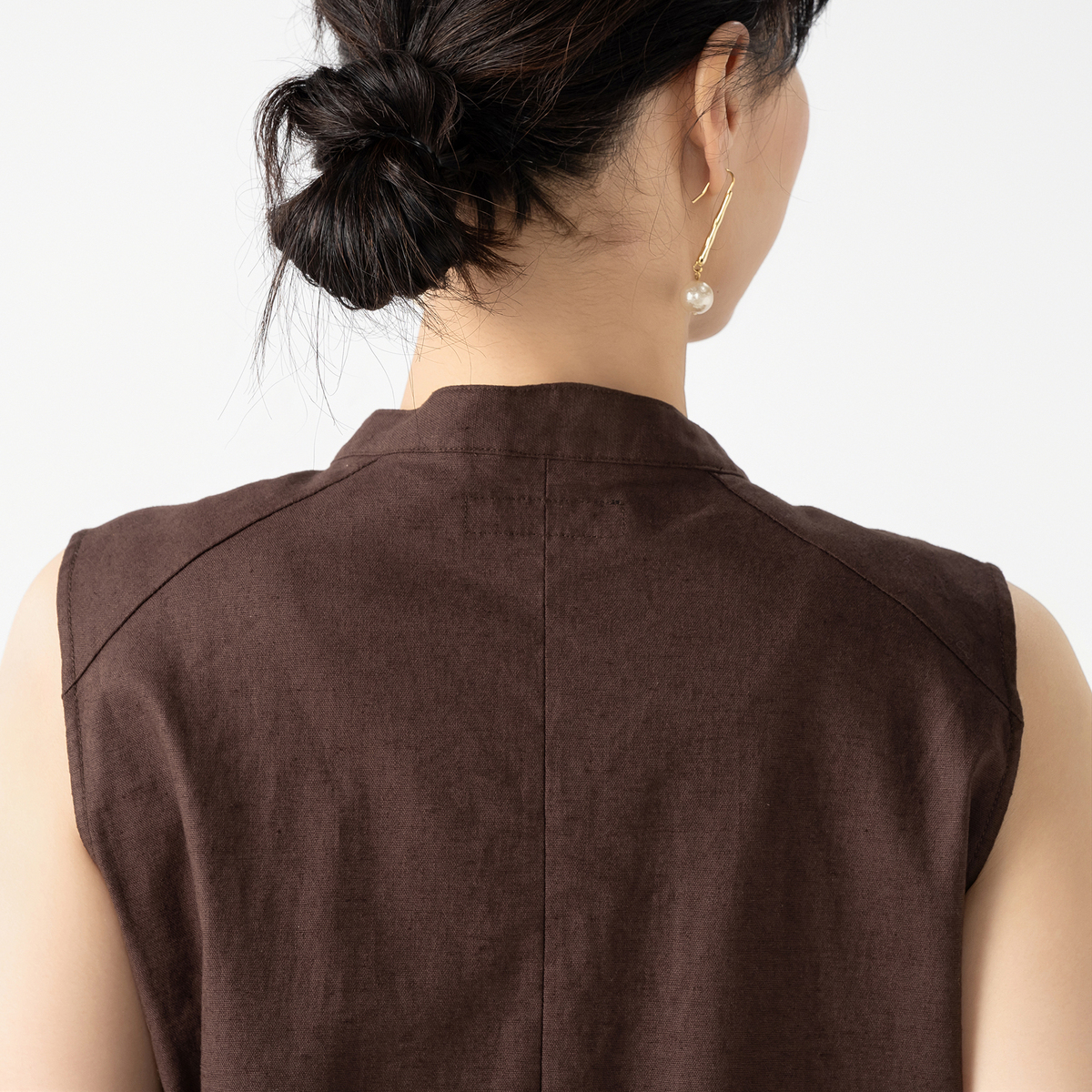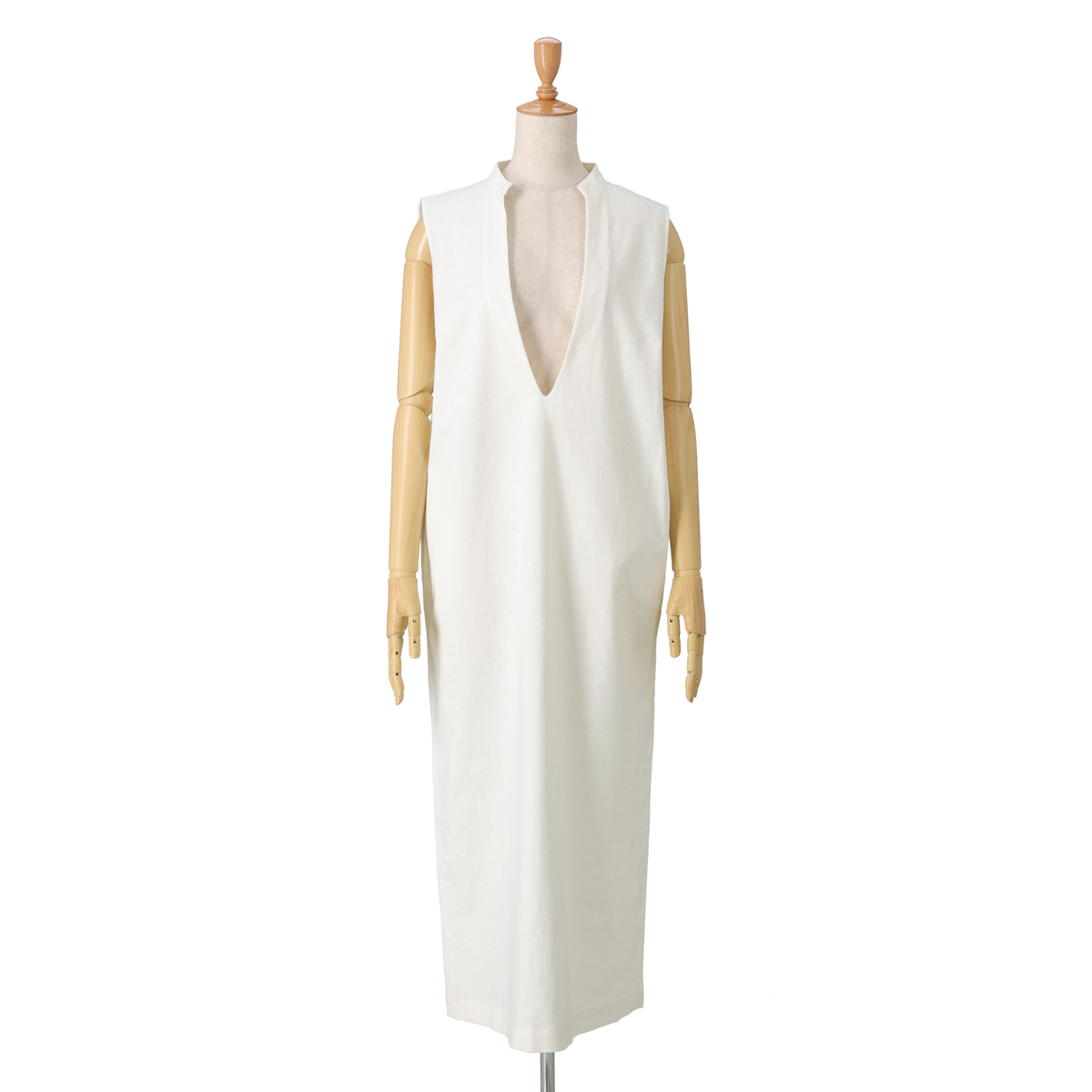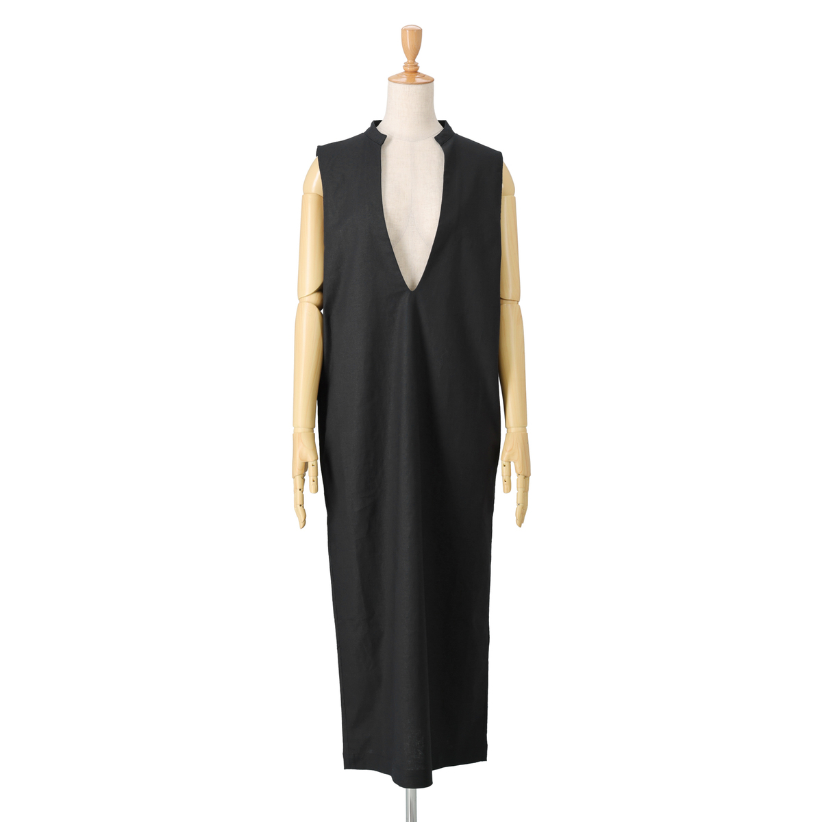 上質なストレッチフレンチリネンのジャンパースカート。大きくVネックラインを入れたフロントデザインで、バンドカラーで旬な表情をプラス。チューブトップやキャミソール、タンクトップをインナーに合わせたコーディートがオススメです