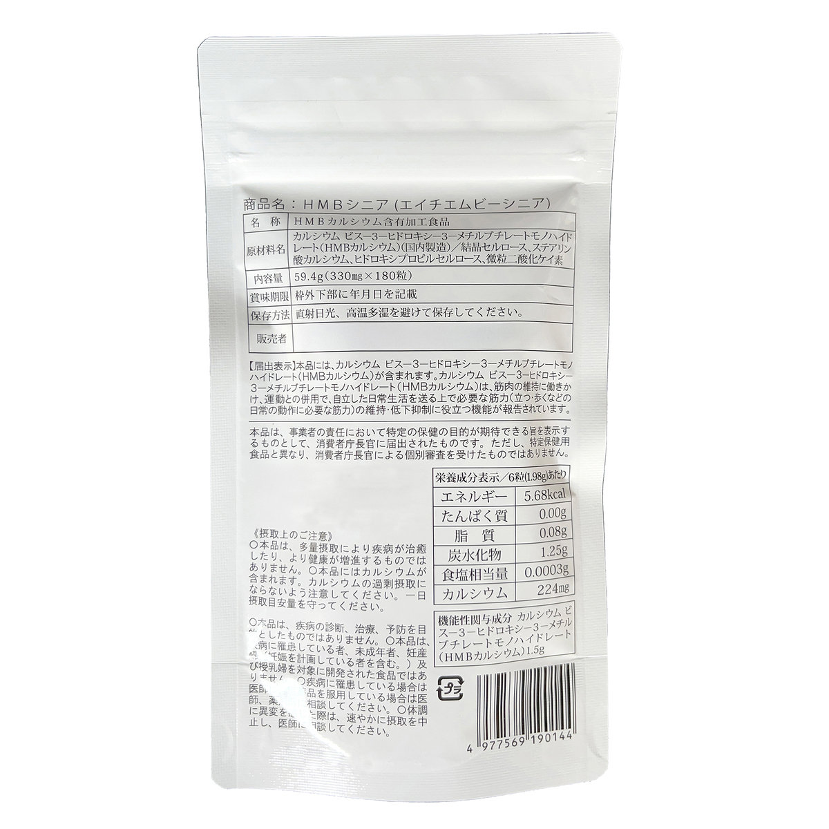 [アレルギー物質特定原材料8品目] なし [内容量] 180粒 [目安量] 1日あたり6粒 [お召し上がり方] 1日あたり6粒を目安に、噛まずに水またはぬるま湯でお召し上がりください [保存方法] 直射日光、高温多湿を避けて保存してください [届出番号] D633 [届出表示] 本品には、カルシウム ビスー3ーヒドロキシー3ーメチルブチレートモノハイドレート(HMBカルシウム)が含まれます。カルシウム ビスー3ーヒドロキシー3ーメチルブチレートモノハイドレート(HMBカルシウム)は、筋肉の維持に働きかけ、運動との併用で、自立した日常生活を送る上で必要な筋力(立つ・歩くなどの日常の動作に必要な筋力)の維持・低下抑制に役立つ機能が報告されています。 [注意事項] ※本品は、多量摂取により疾病が治癒したり、より健康が増進するものではありません ※本品は、疾病の診断、治療、予防を目的としたものではありません ※本品は、疾病に罹患している者、未成年者、妊産婦(妊娠を計画している者を含む)及び授乳婦を対象に開発された食品ではありません ※疾病に罹患している場合は医師に、医薬品を服用している場合は医師、薬剤師に相談してください ※本品は、事業者の責任において特定の保健の目的が期待できる旨を表示するものとして、消費者庁長官に届出されたものです。ただし、特定保健用食品と異なり、消費者庁長官による個別審査を受けたものではありません ※食生活は、主食、主菜、副菜を基本に、食事のバランスを ※本品にはカルシウムが含まれます。カルシウムの過剰摂取にならないよう注意してください。一日摂取目安量を守ってください ※体調に異変を感じた際は、速やかに摂取を中止し、医師に相談してください ■機能性表示食品 ※機能性関与成分:カルシウム ビスー3ーヒドロキシー3ーメチルブチレートモノハイドレート(HMBカルシウム)1.5g [原料原産地] カルシウム ビスー3ーヒドロキシー3ーメチルブチレートモノハイドレート(HMBカルシウム)(国内製造) [原産国] 日本 [原材料] カルシウム ビス-3-ヒドロキシ-3-メチルブチレートモノハイドレート(HMBカルシウム)(国内製造)/結晶セルロース、ステアリン酸カルシウム、ヒドロキシプロピルセルロース、微粒二酸化ケイ素