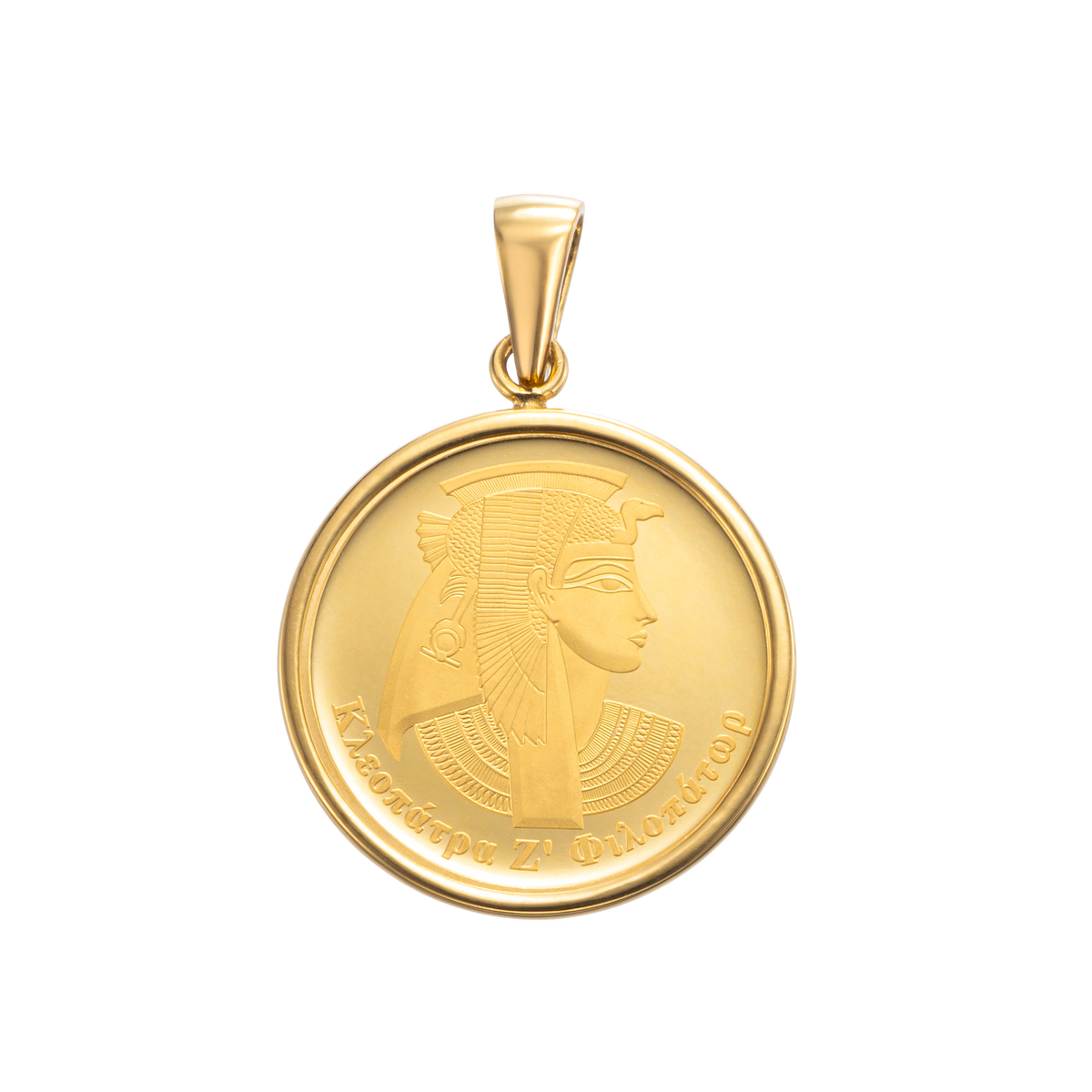 古代エジプト・プトレマイオス朝最後の女王(ファラオ)であるクレオパトラをあしらった、英国王立造幣局製造の純金メダルのペンダントヘッド。もう片面には、古代エジプト神話に登場する猫の姿をした女神バステトが描かれています