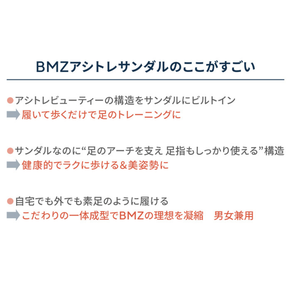 [重量(約)]130g(26cm 片方) [ソール厚さ(約)]1cm [ヒール高さ(約)]2.5cm [ワイズ]4E相当 [材質] 合成樹脂・合成皮革・ポリエステル [注意事項] ※はじめてBMZ製品を使用する場合には違和感や痛みを感じる場合があります。まずは、1日30分程度使用するようにして、慣らし期間を設けることをお勧めします ※「車の中」には保管しないでください ※「高温多湿」の場所には保管しないでください ※「長期の保管後」は必ず点検してください。長期間保管したサンダルを履く場合は、劣化をしていないか必ず確認してからご使用ください ※使用中に足や身体に異常を感じた場合は、ご使用をおやめください ※本製品は治療用、矯正用の医療機器ではありません ※血行障害/糖尿病/足裏に傷、はれもの/湿疹/ケガ等異常のある方は、医師にご相談の上ご使用ください。また、BMZ製品は変形した足を矯正する装具ではありません。足部が変形したまま使用を続けると、足に痛みを感じることがあります。その場合は直ちに使用を中止して、足の専門医を受診してください 【ベトナム製】